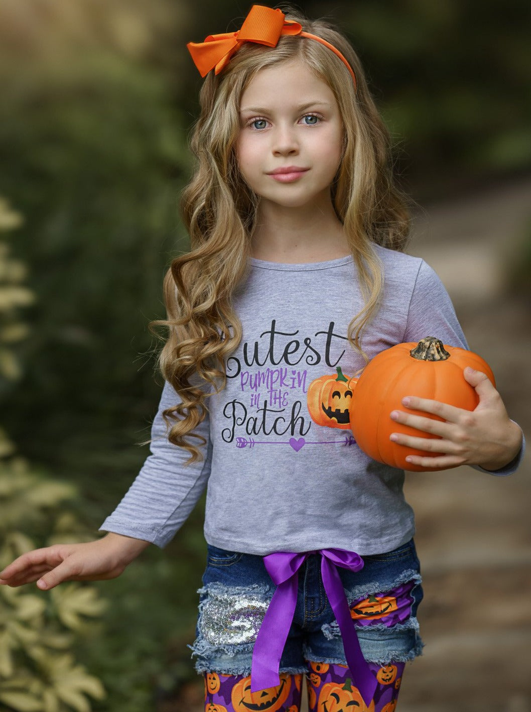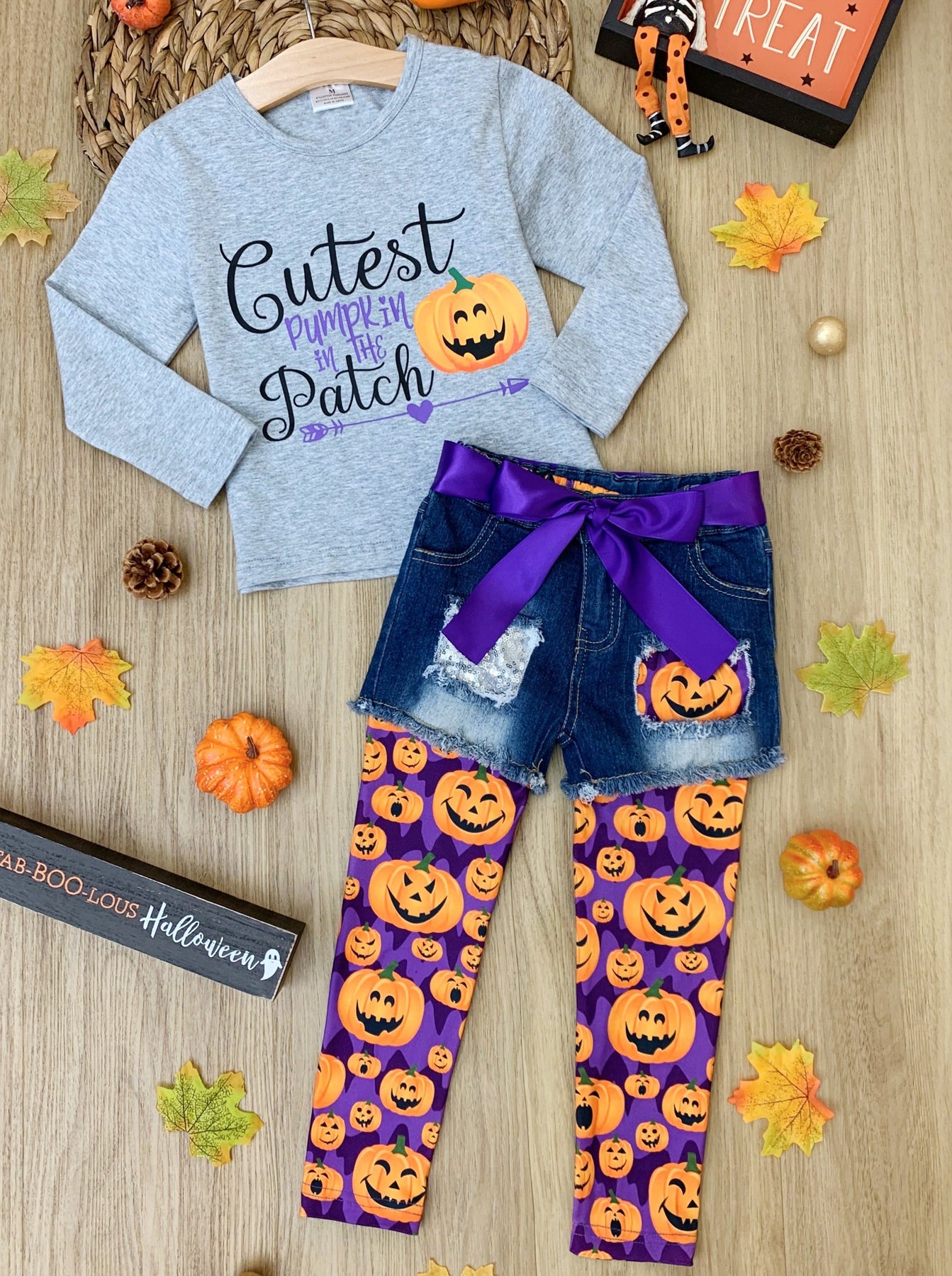 - Long-sleeve "Cutest Pumpkin in the Patch" graphic print top, pumpkin print leggings and matching fabric and sequin patched denim shorts with satin belt sash