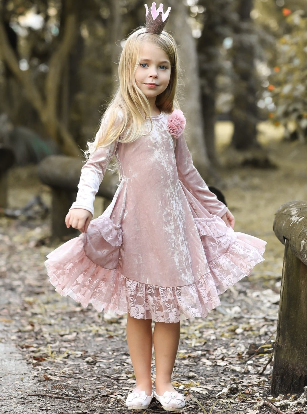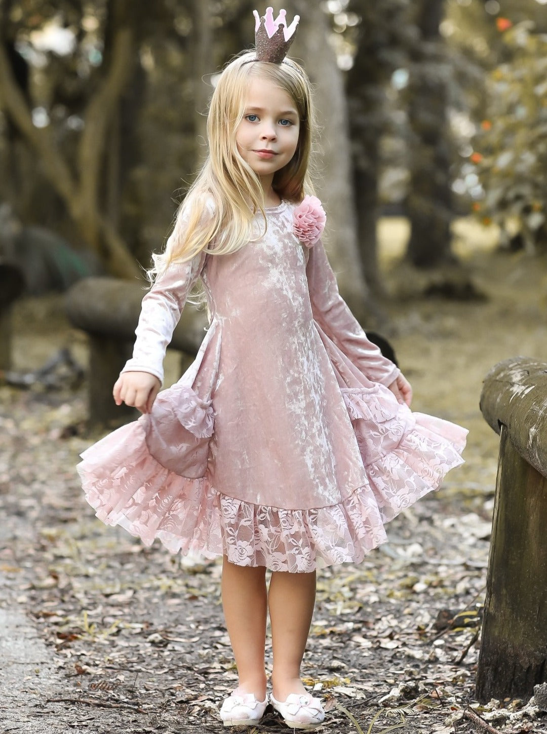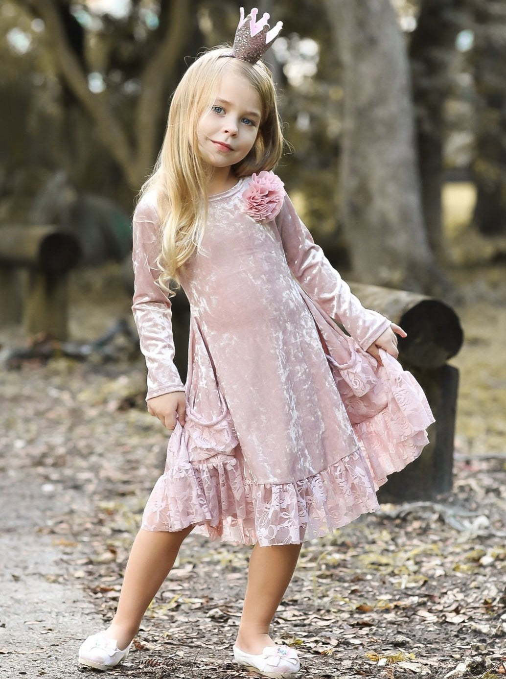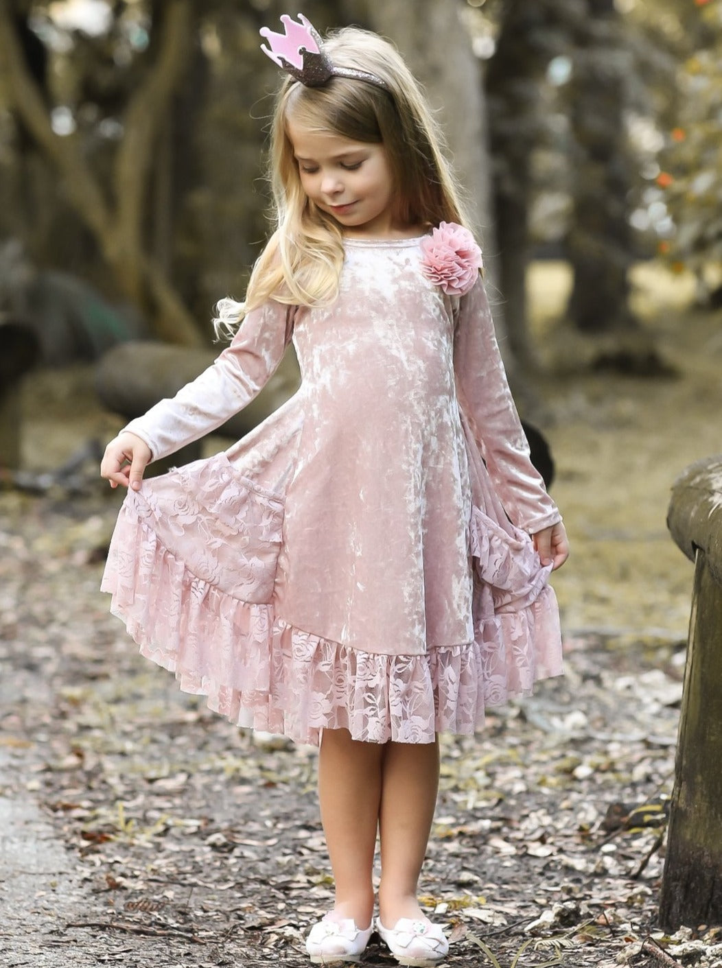 Girls Dusty Pink Velvet Princess Holiday Dress with Lace Ruffled Pockets - Dusty Pink / 2T/3T - Girls Fall Dressy Dress