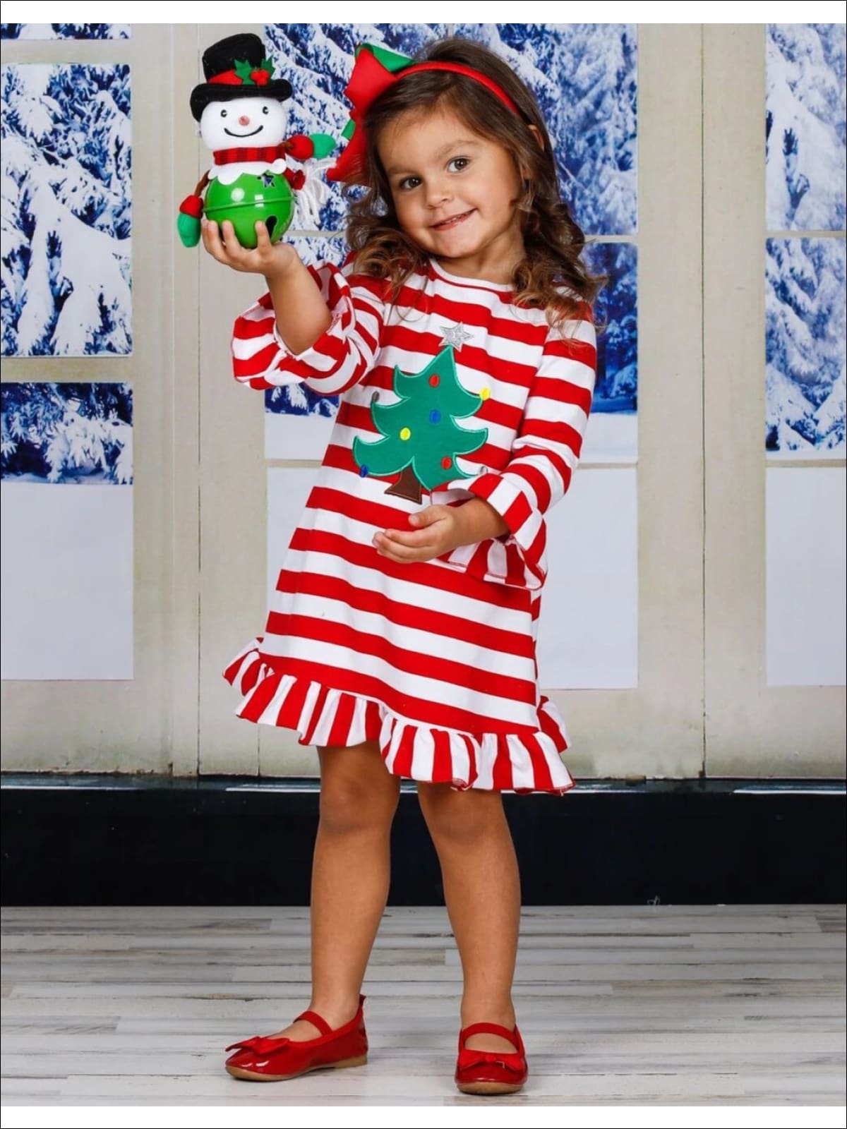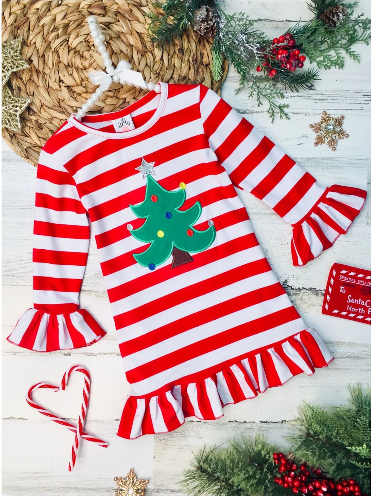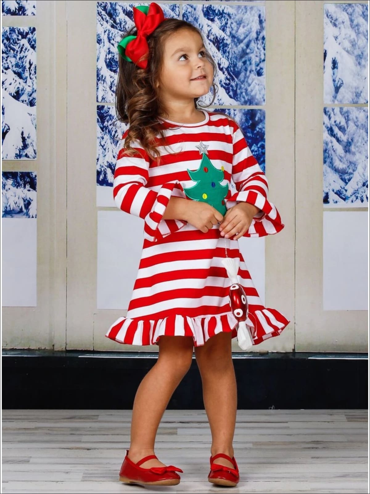 Girls Red Striped Fall Christmas Tree Applique Dress