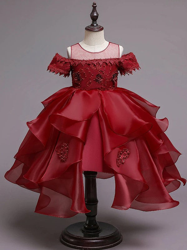 Off-shoulder formal dress with nude neckline, embroidered bodice, and layered flared tulle hi-lo skirt; back zipper