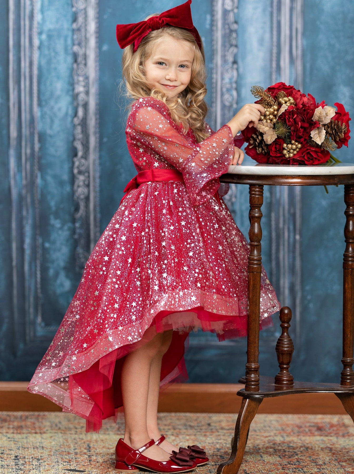 Half-sleeve hi-lo dress withsequin star tulle overlay, flared cuffs, bowed waistline in front and back; zips in back