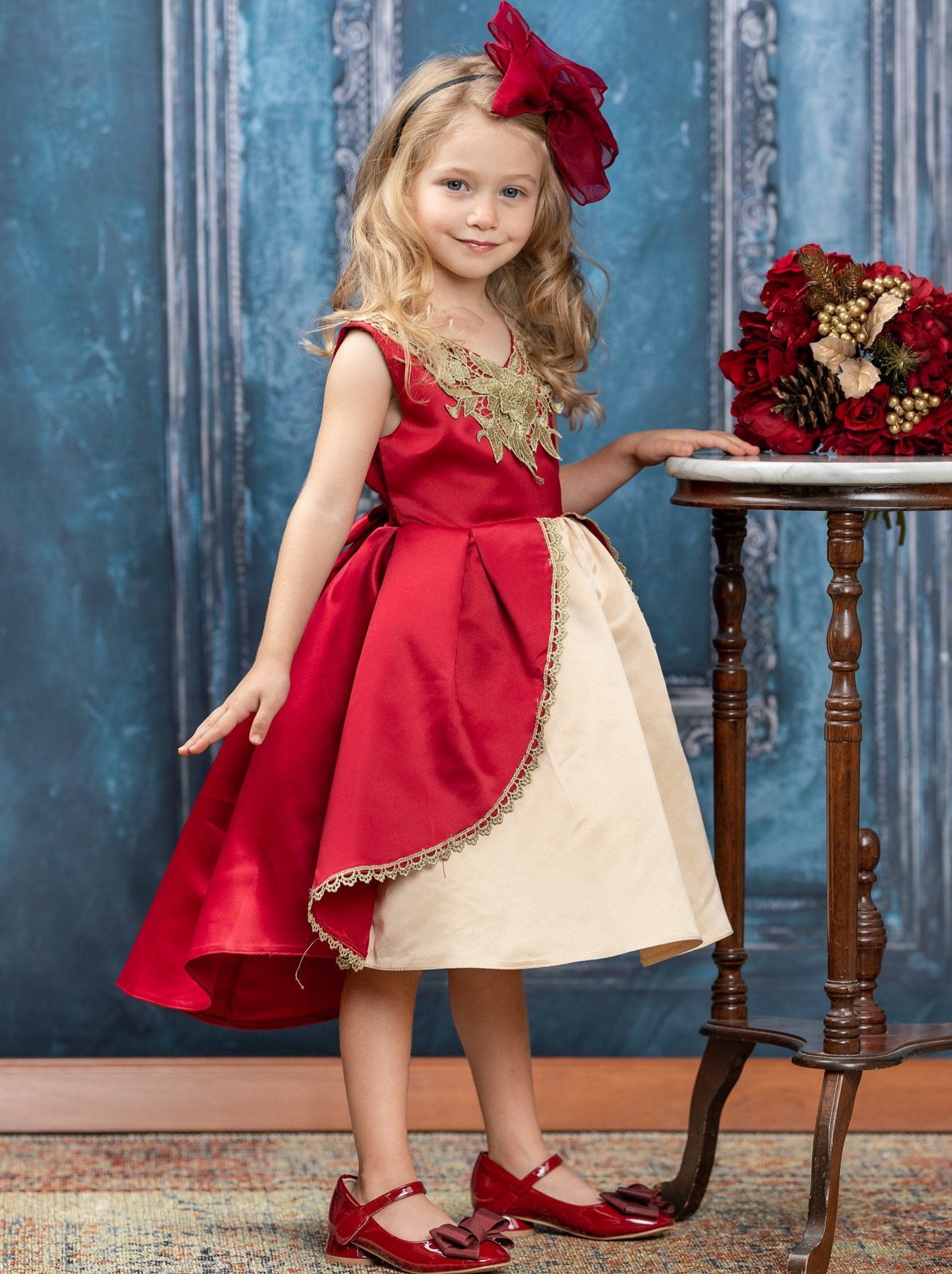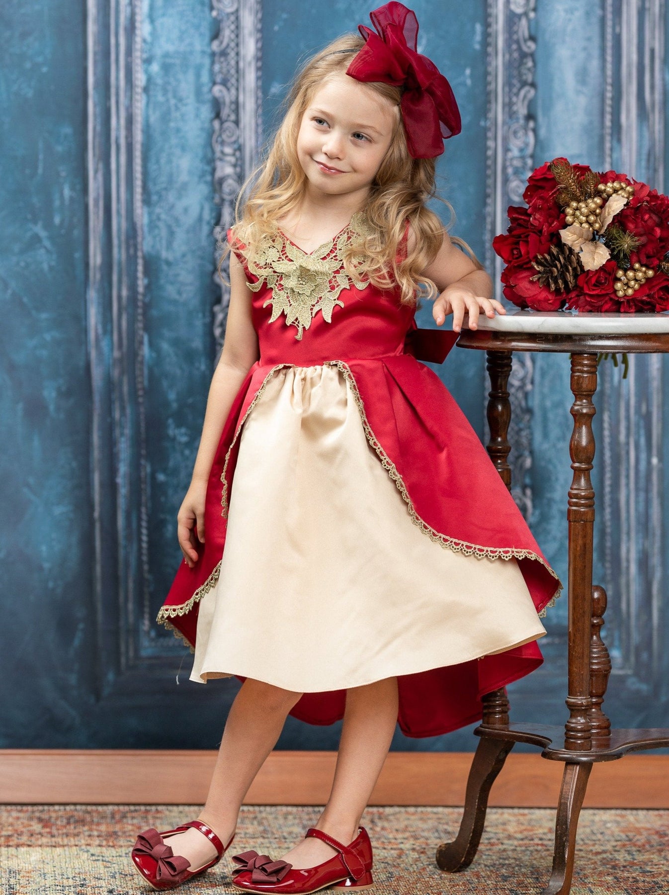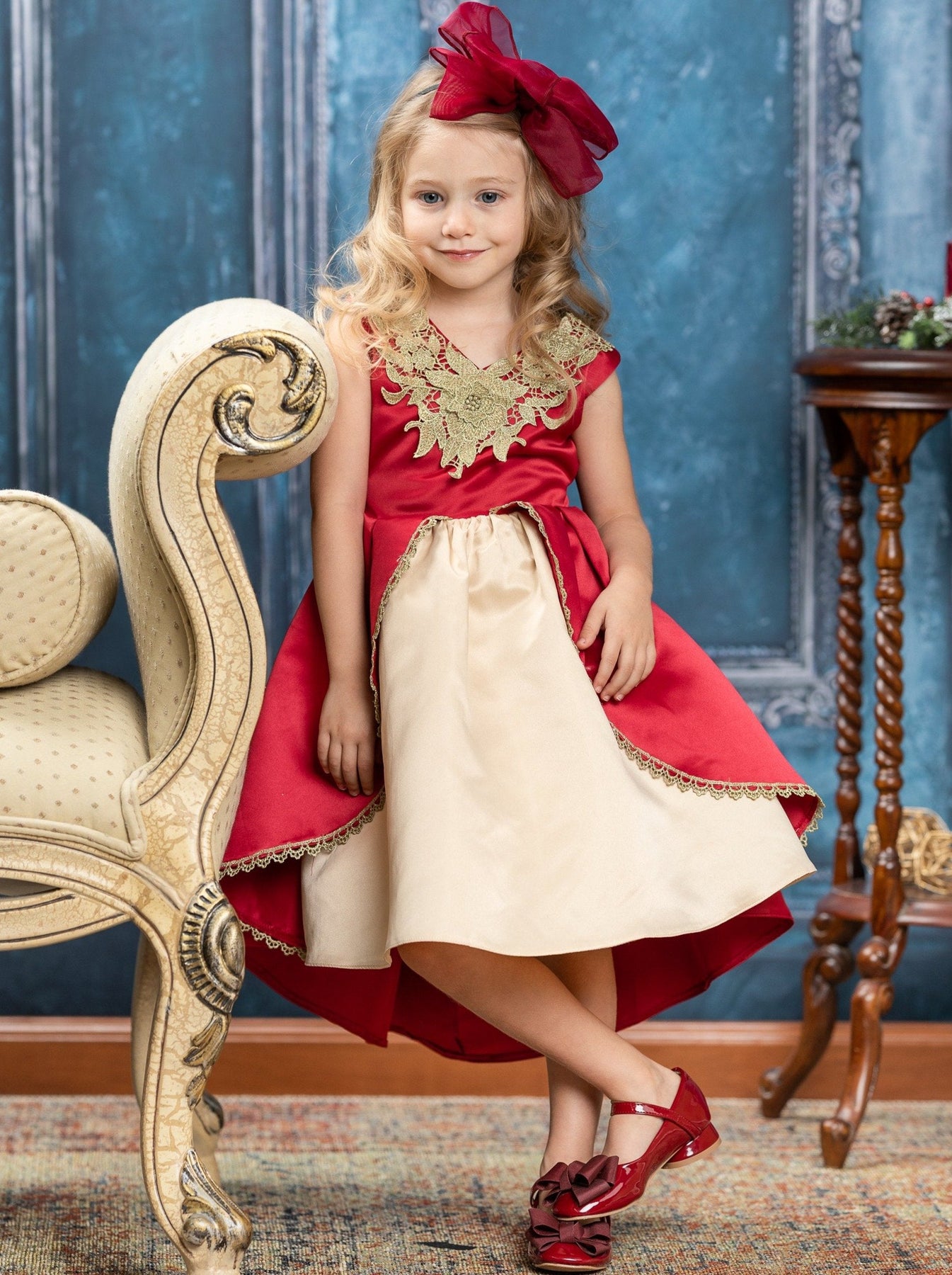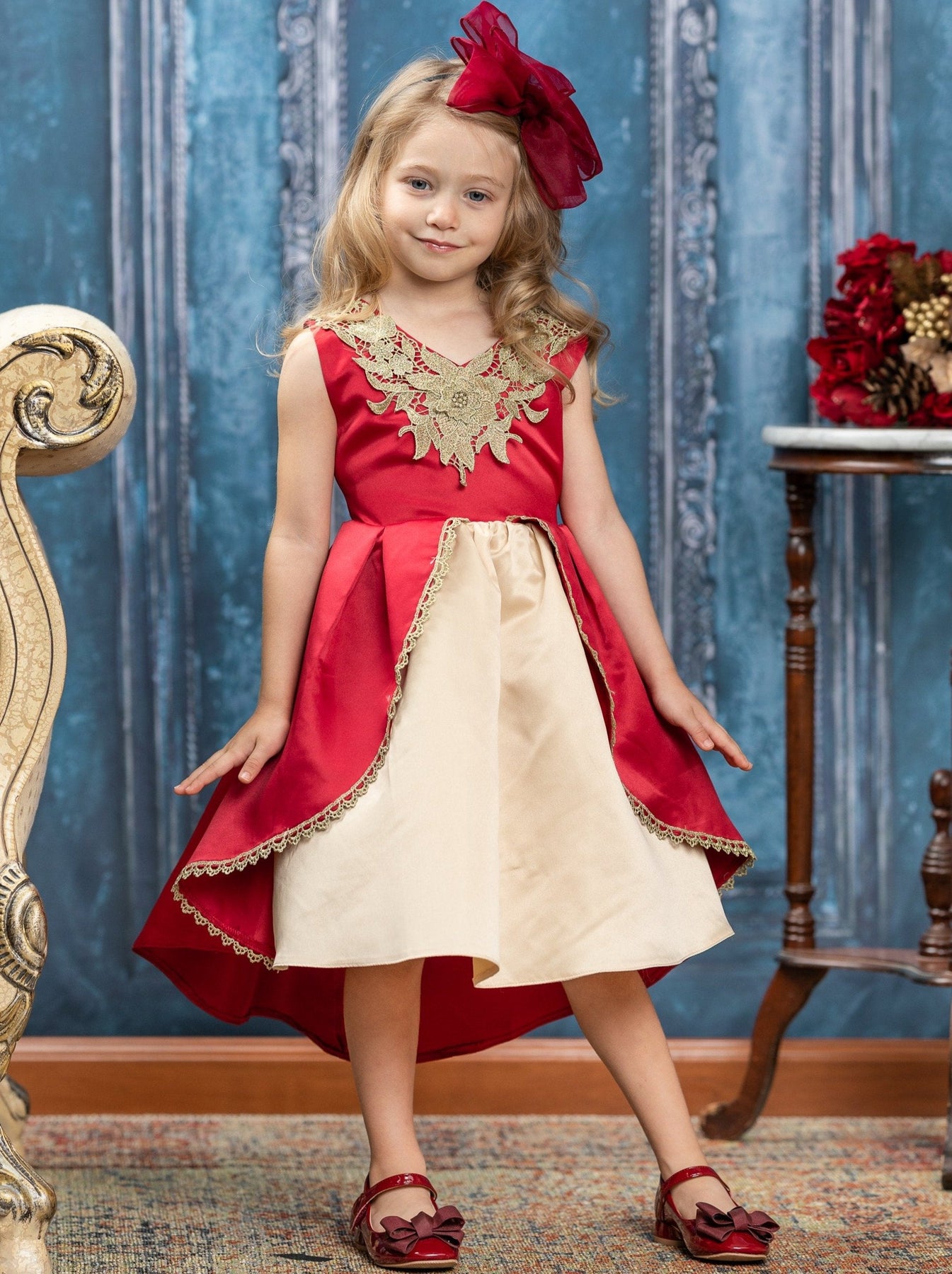 Regal takes on a whole new meaning when your little girl puts on this holiday dress! The gorgeous gold lace neckline and the princess ball gown cut are enough to make everyone comment on how beautiful she is.
