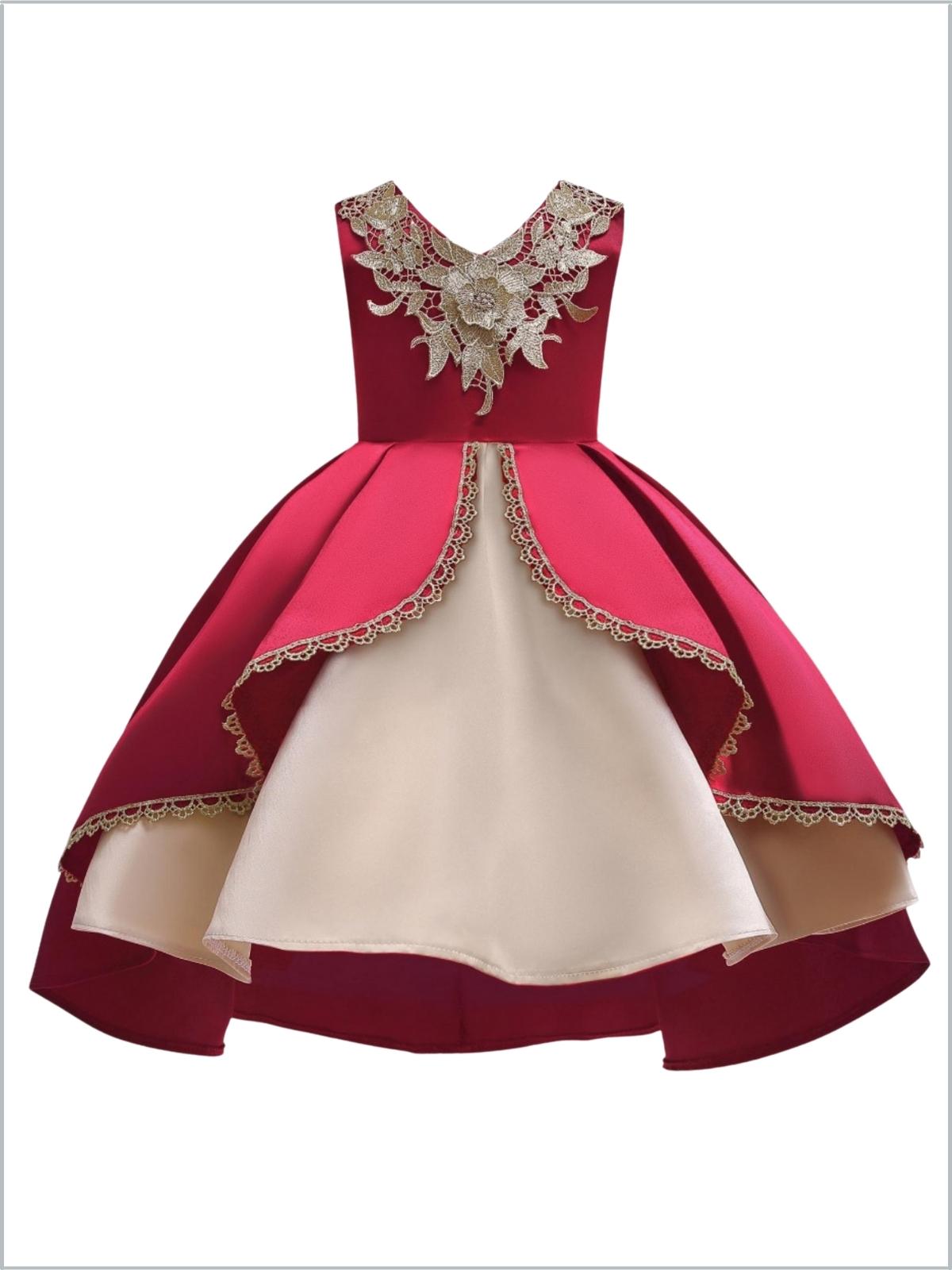 Sleeveless princess dress with layered peplum hi-lo skirt, floral applique bodice, and bow in back