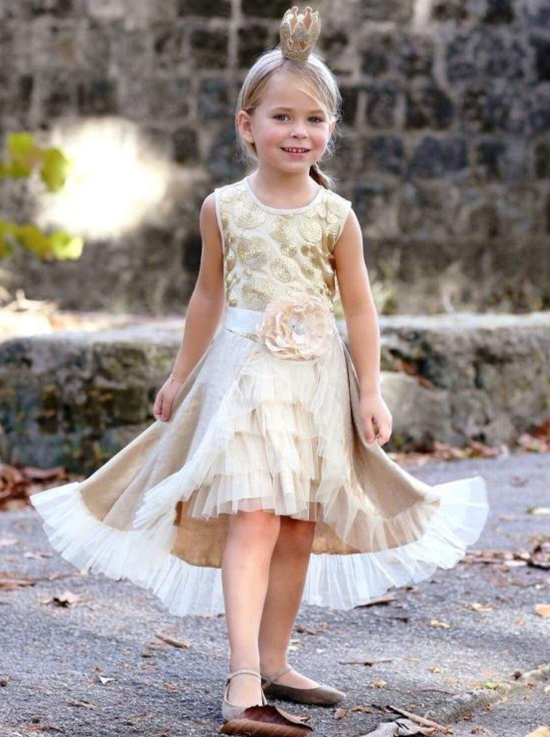 The gold color, waist flower belt and raised floral bodice give this look the "WOW" of the party. Do not forget your matching tiara!