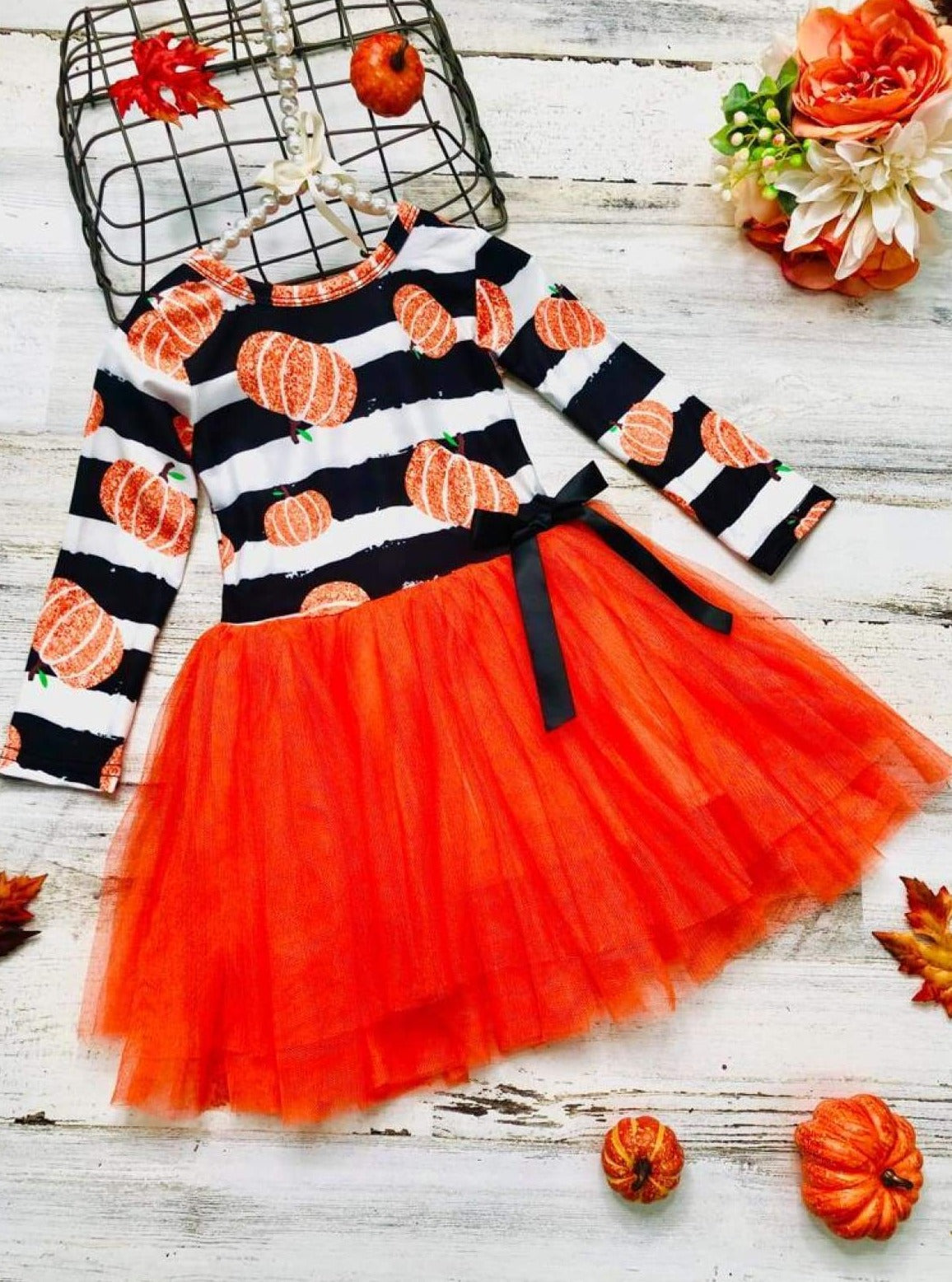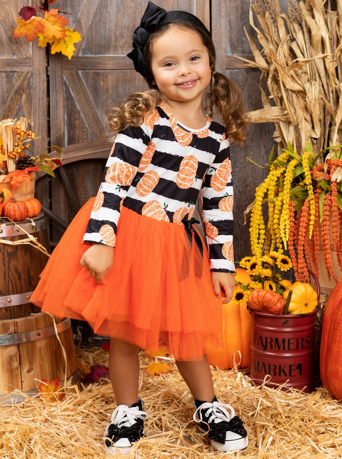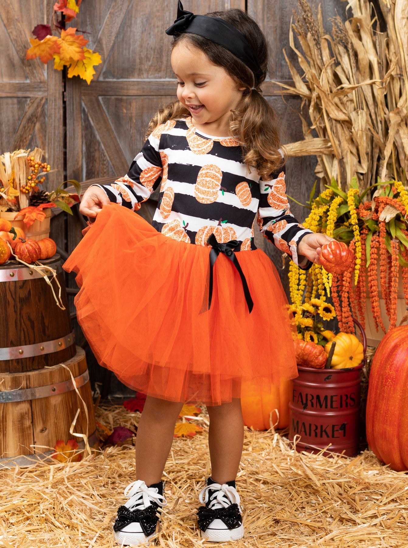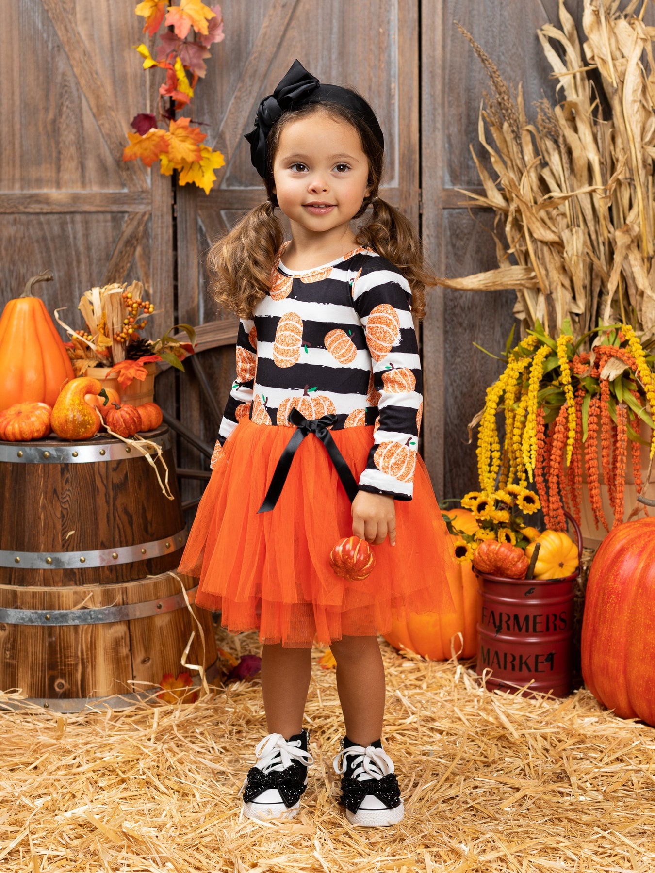 Long-sleeve tutu dress with pumpkin striped print bodice and gathered tulle skirt embellished with a ribbon bow