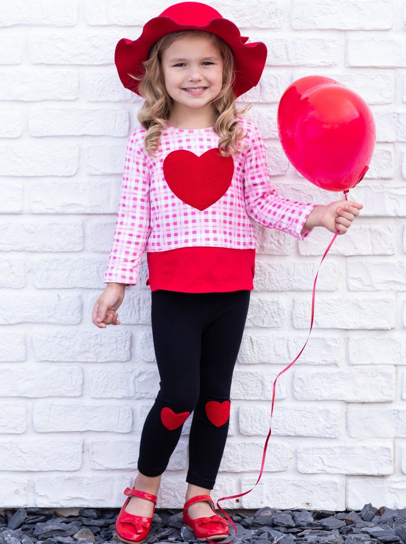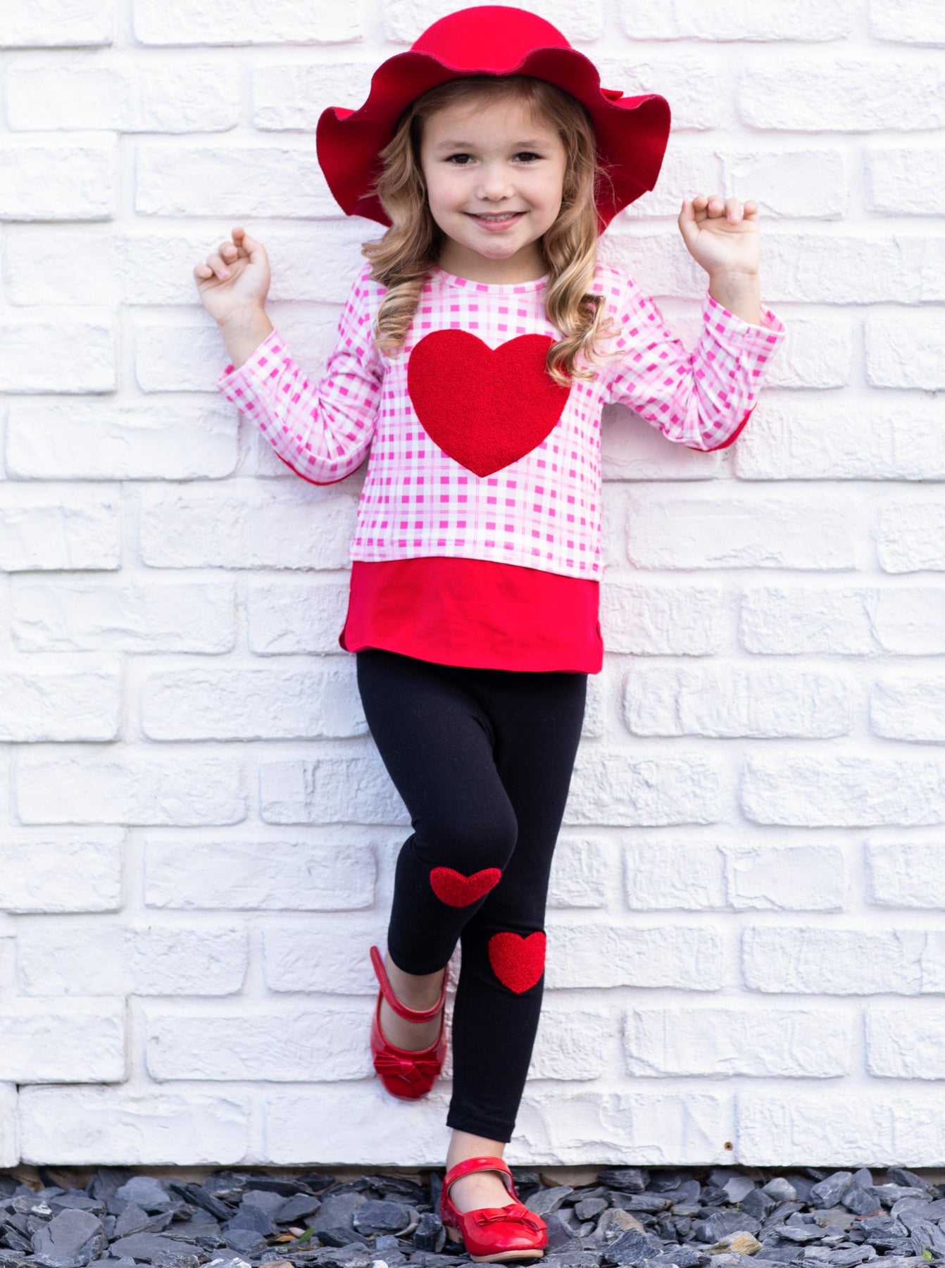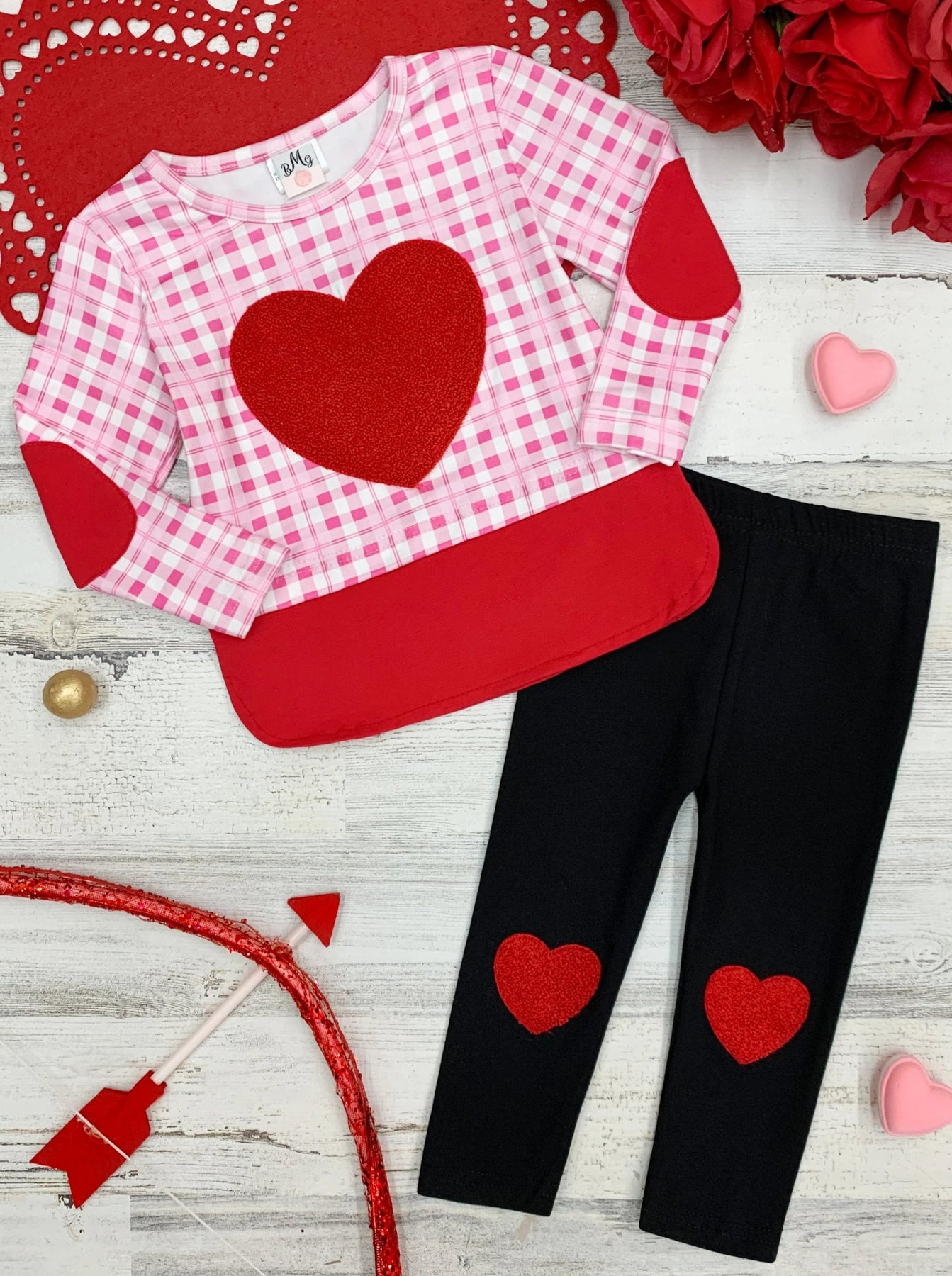 - This lovable legging set has a dazzling, princess feel. Fuzzy heart applique on the checkered plaid top's chest and elbows ties the outfit together with heart knee-patch leggings and makes the whole set fun and stylish for the perfect Valentine's Day glam!