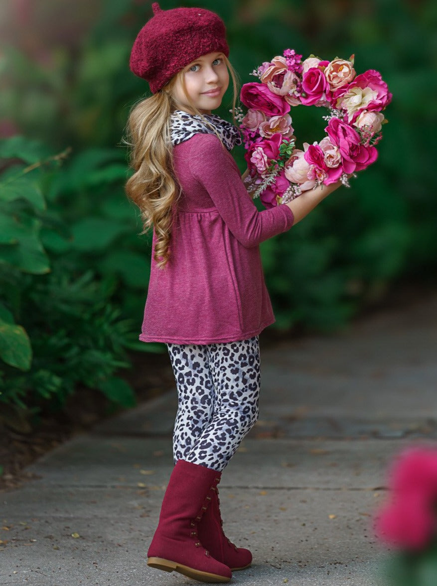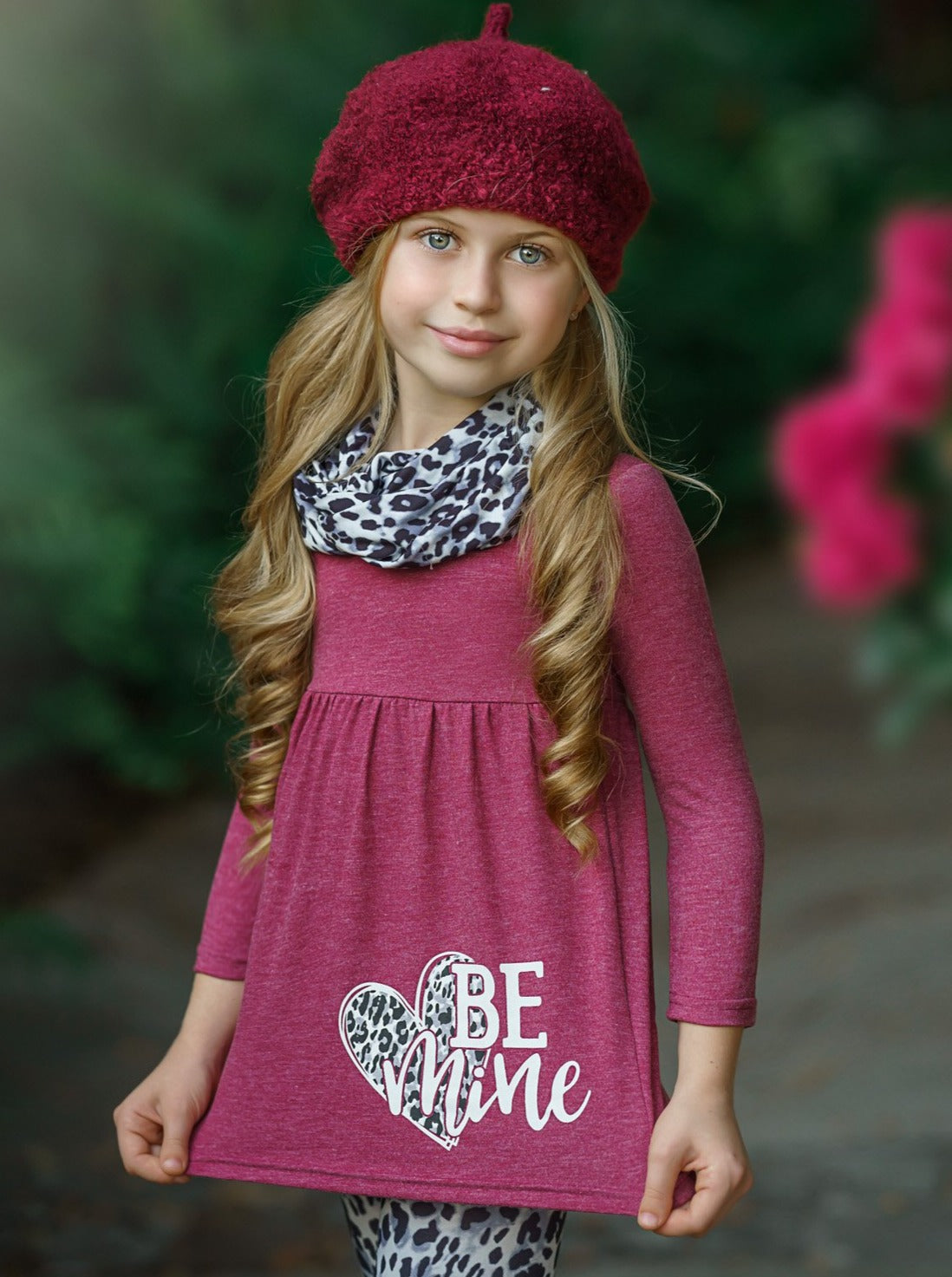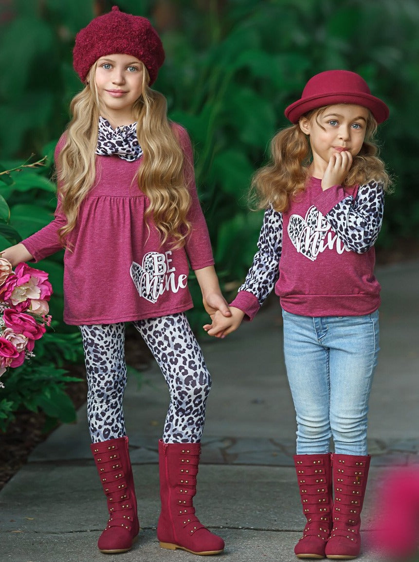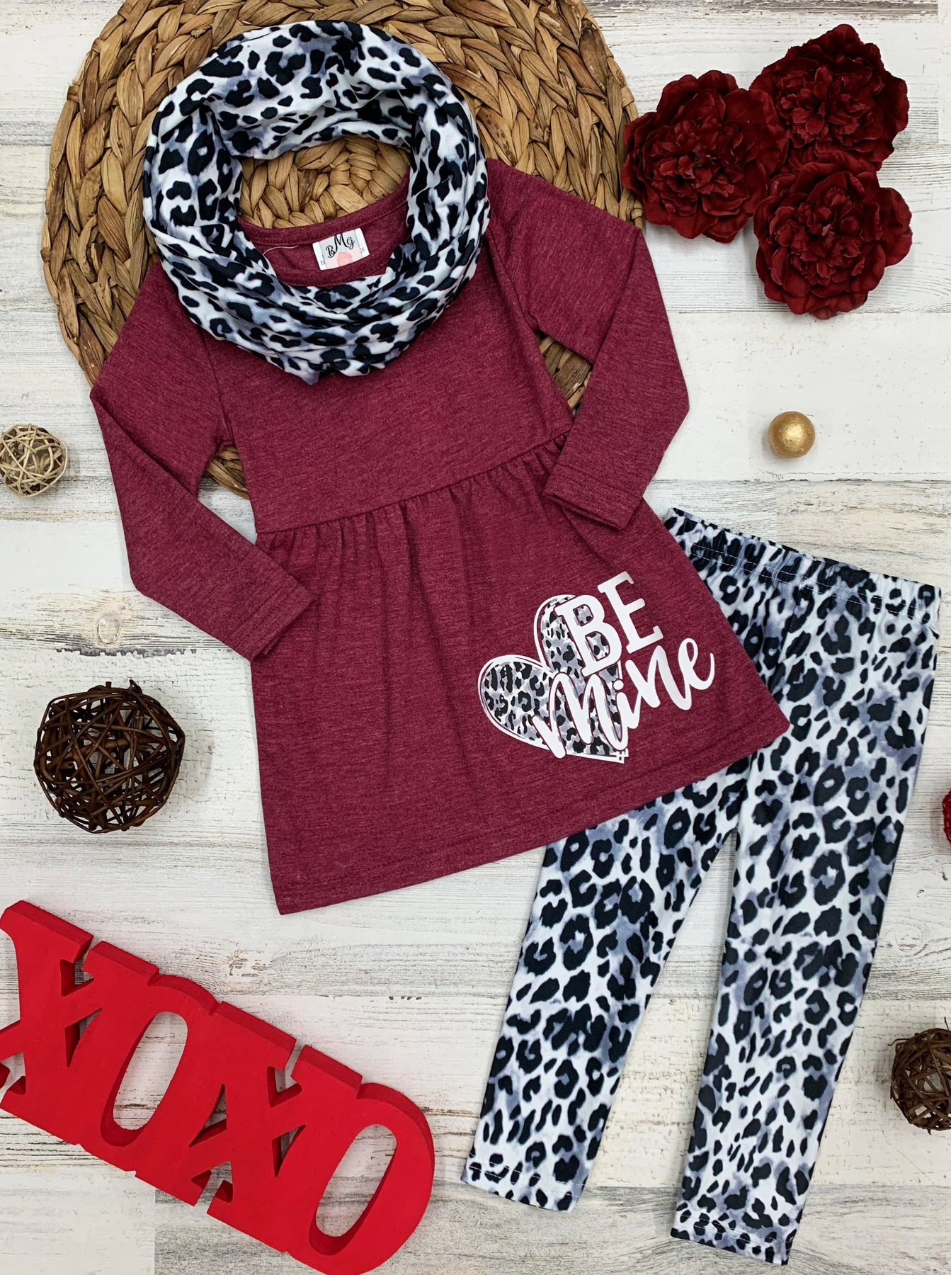 - Long-sleeve "Be Mine" tunic with leopard print leggings and matching infinity wrap scarf
