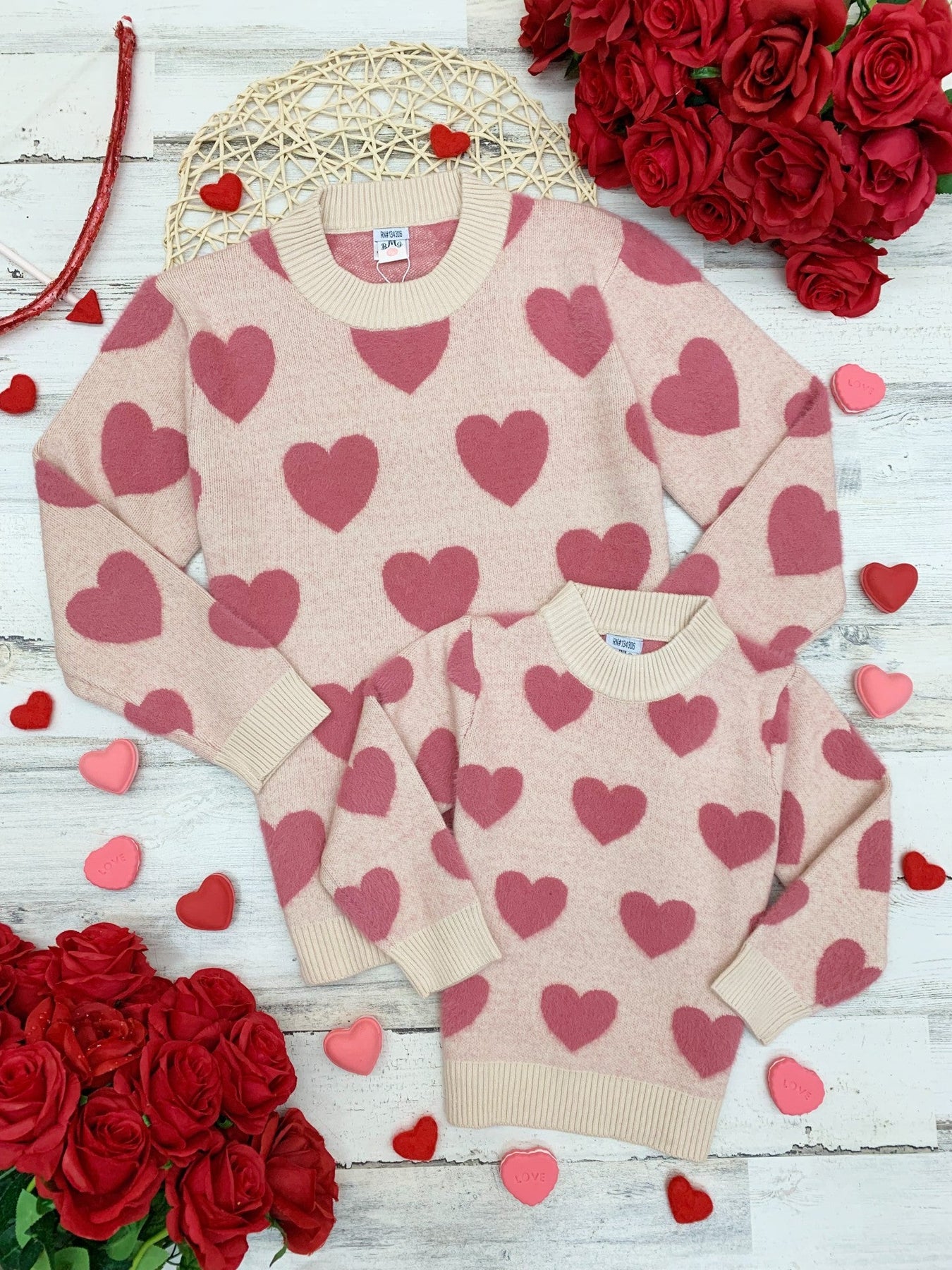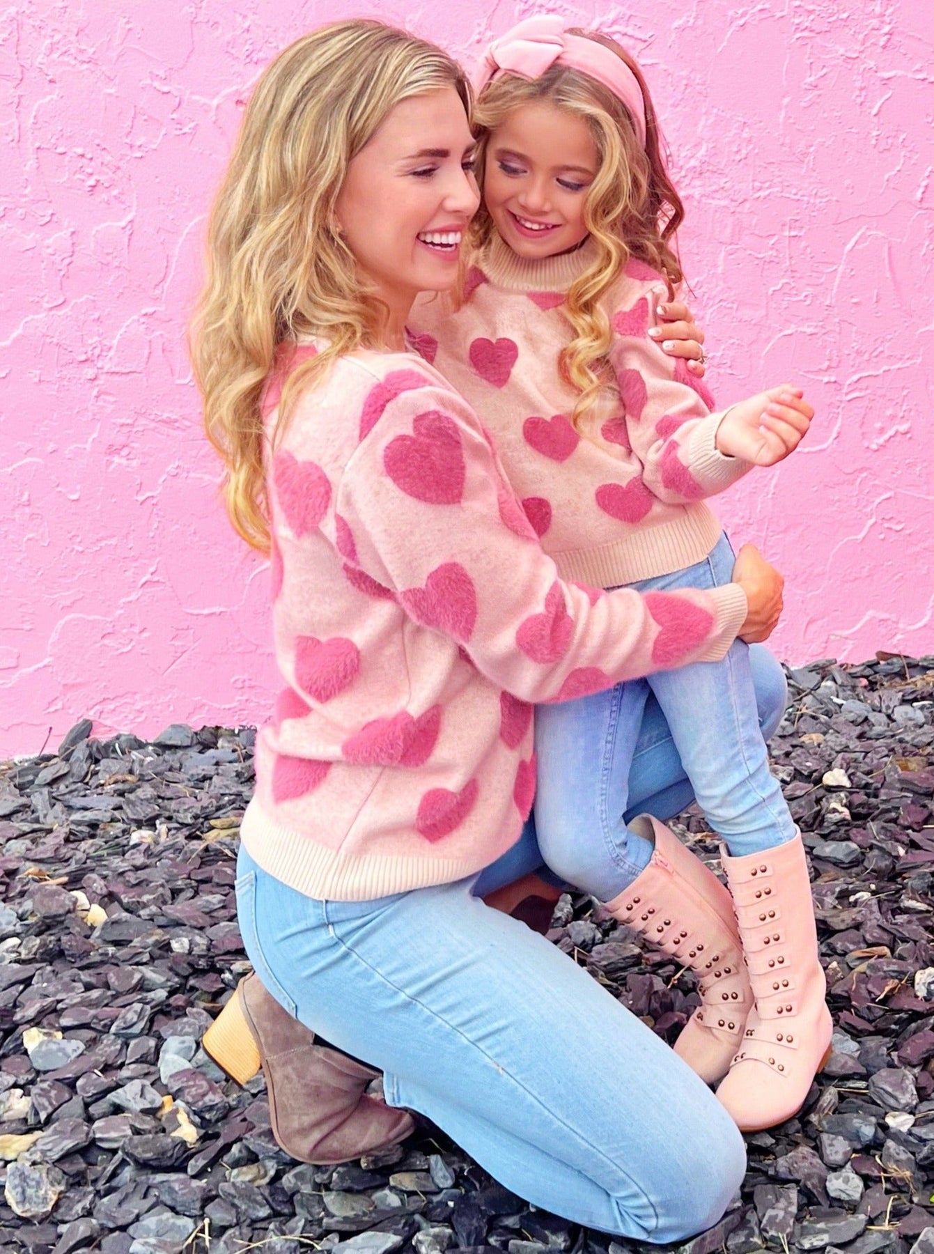 Cuddle up close with your little loves in these matching heart print sweaters. Keep her snug all day long wearing this pullover bursting with hearts and love in every stitch.