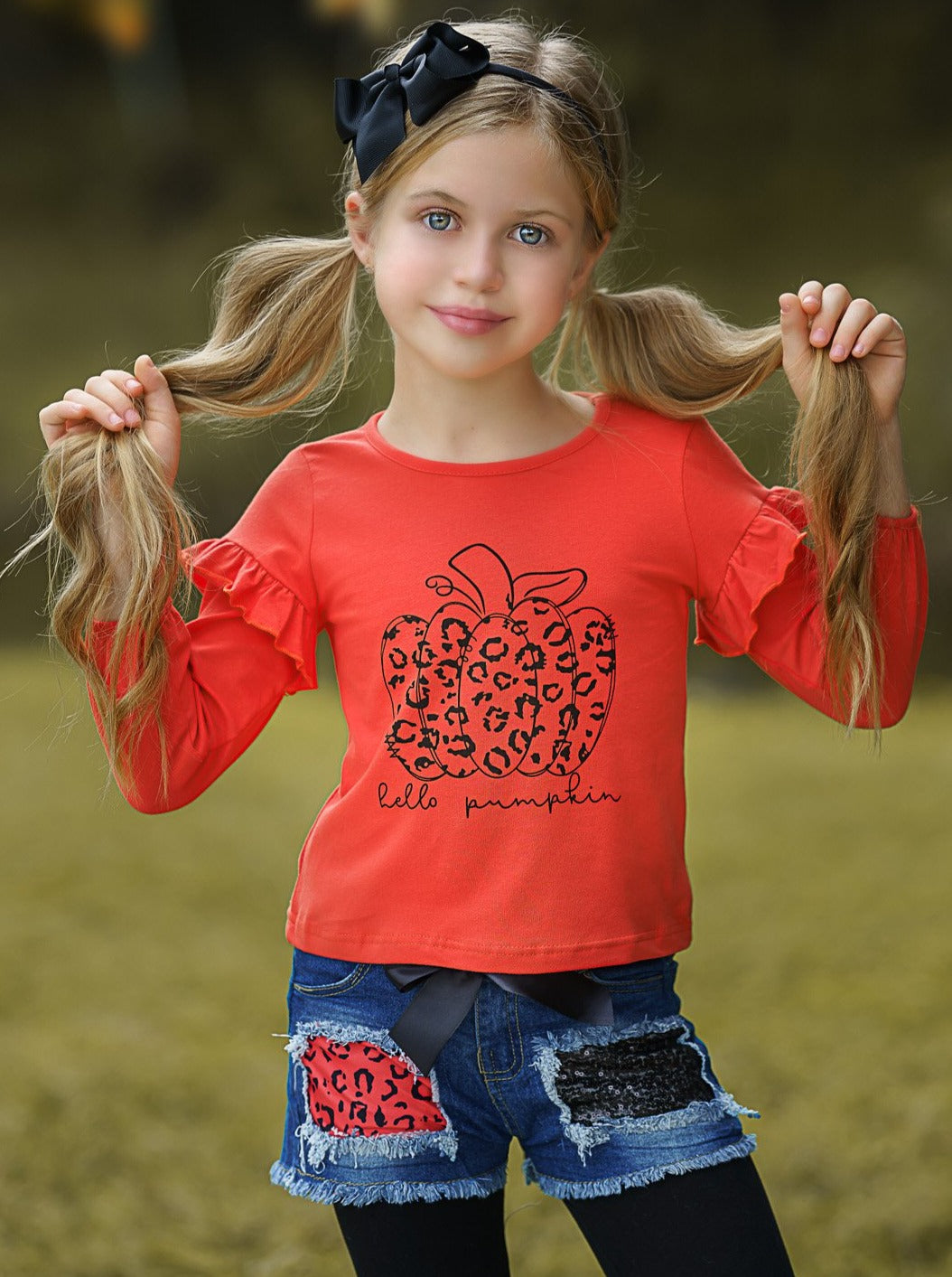 Long-sleeve "Hello Pumpkin" leopard print top with ruffle sleeve accents, sequin patched denim shorts with a black sash and black leggings