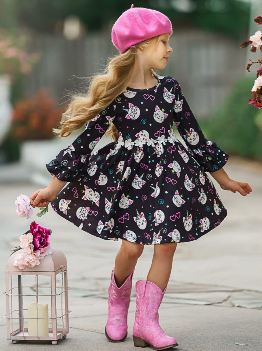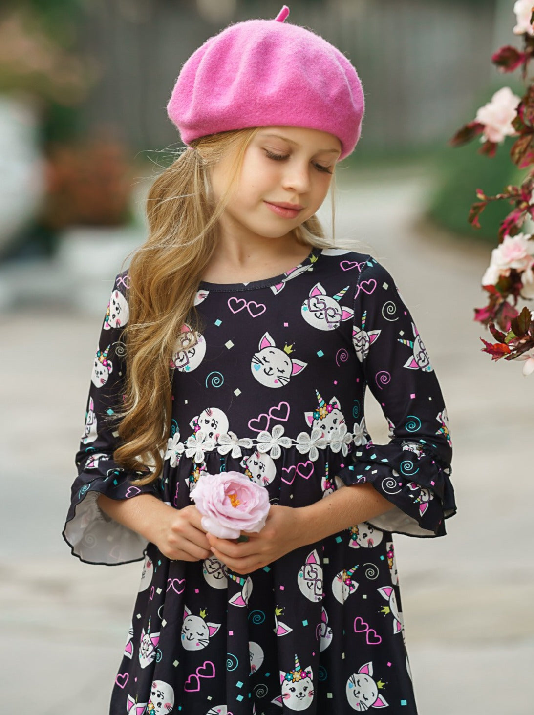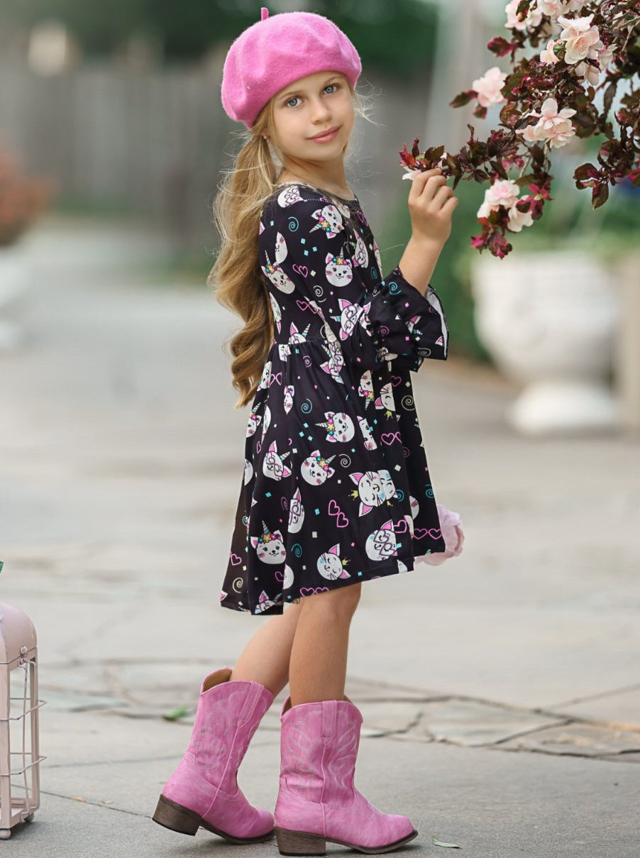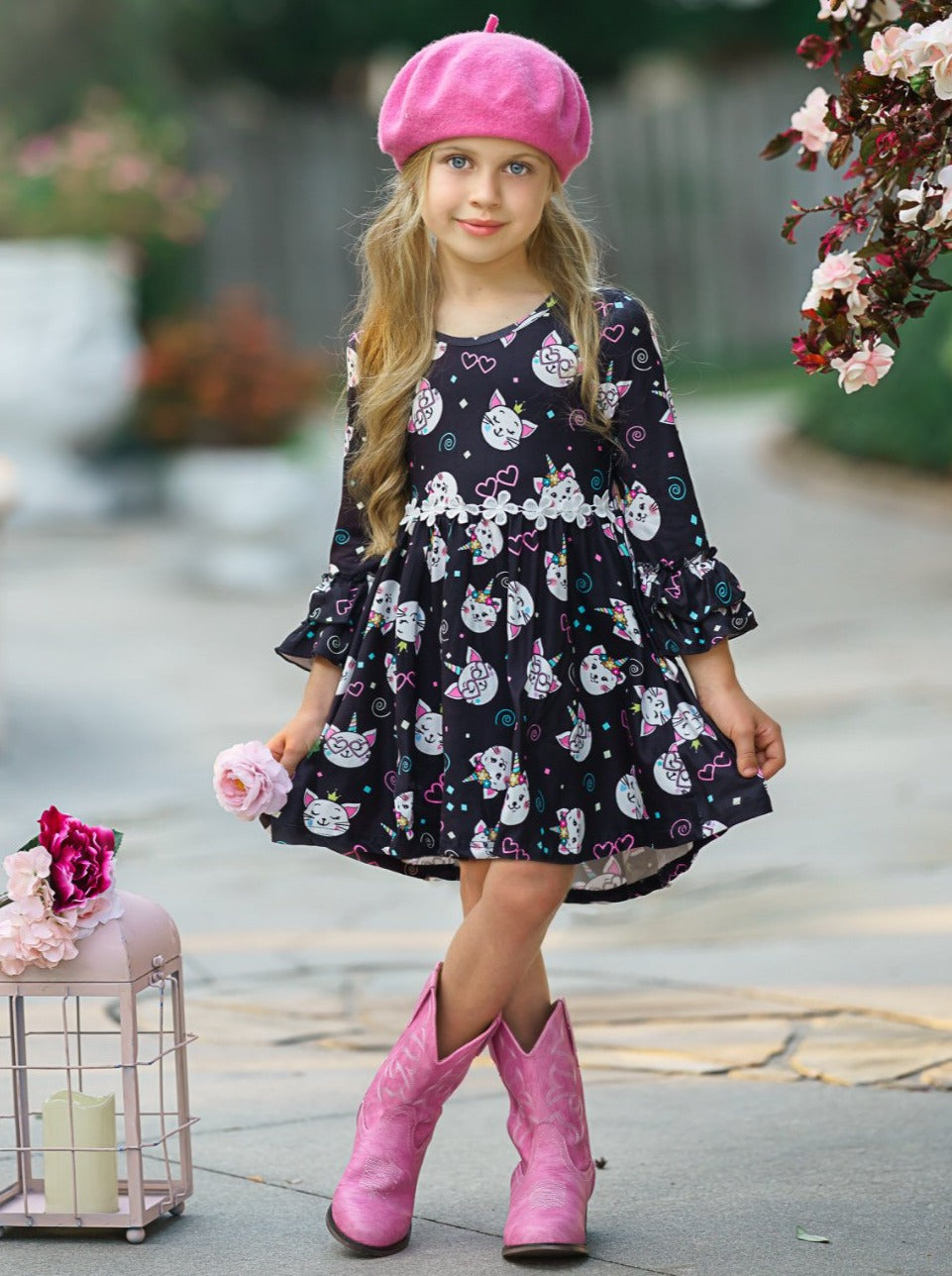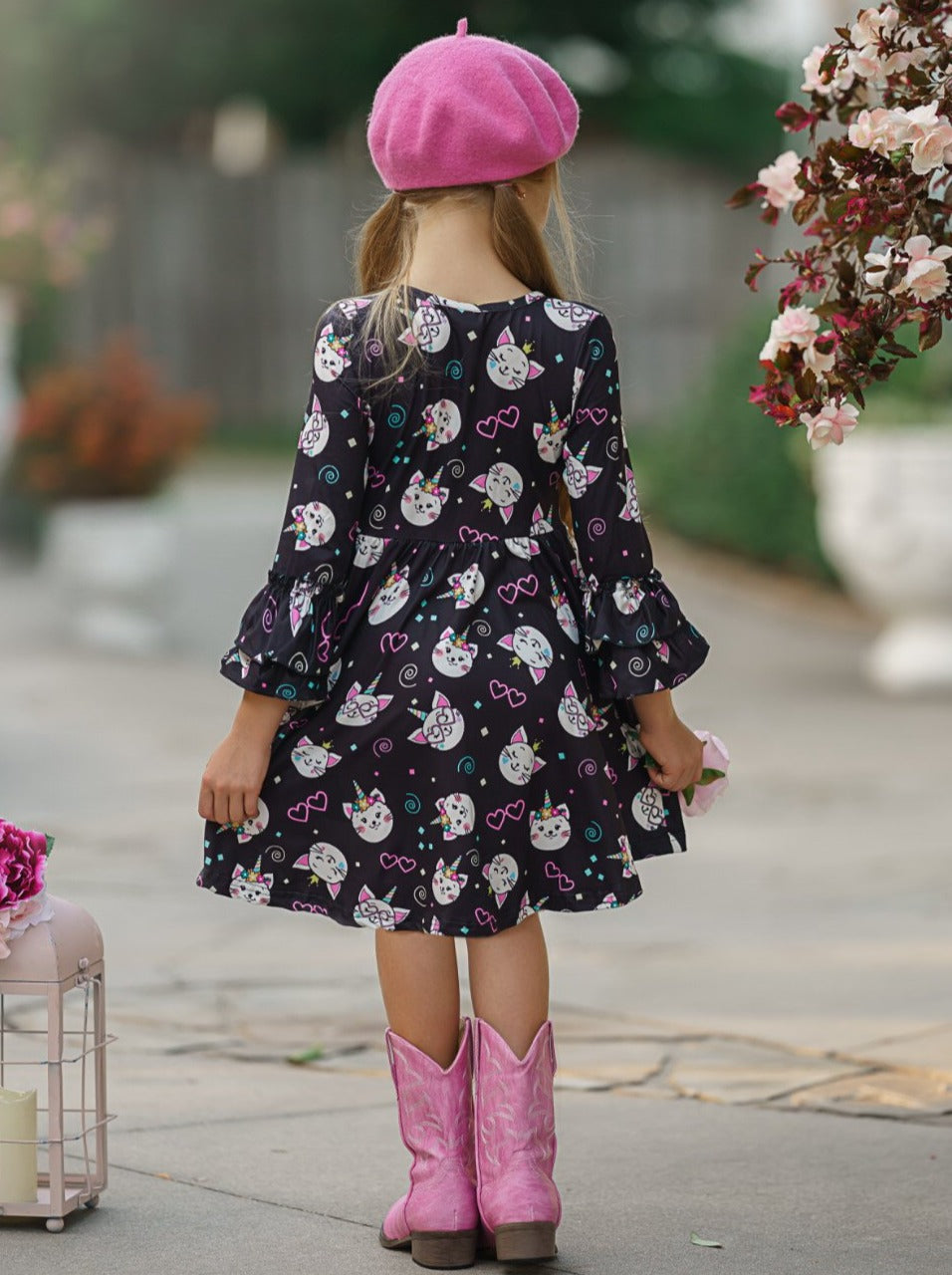 Girls Hi-Lo Double Ruffle Sleeve Kitten Print Dress