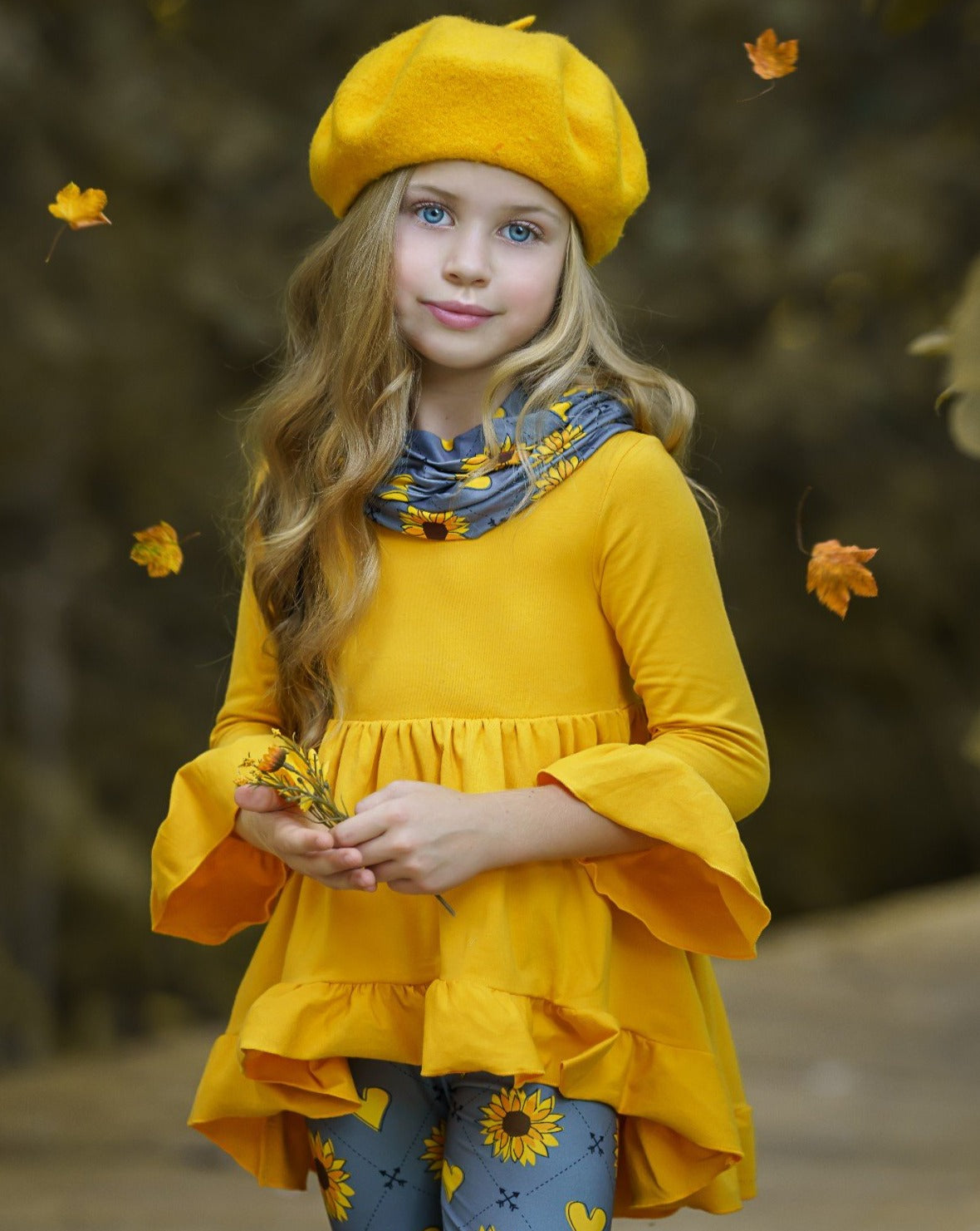 Long-sleeve hi-lo ruffled tunic with flared cuffs, sunflower/heart print leggings, and a matching infinity wrap scarf