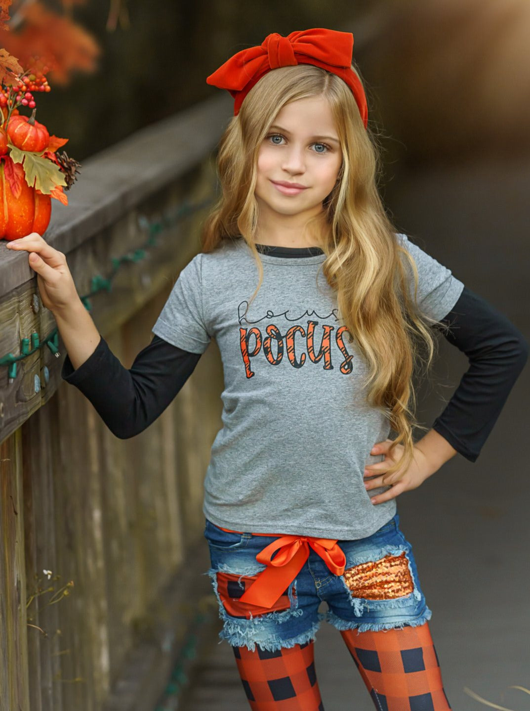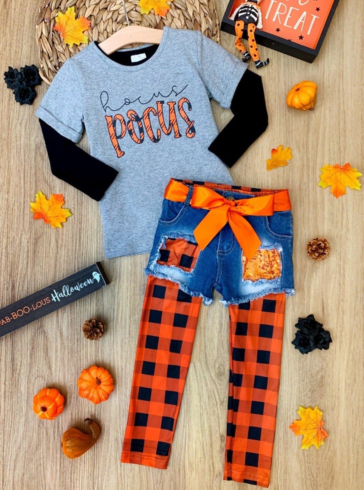 Girls Hocus Pocus Top, Leggings & Denim Shorts Set - Mia Belle Girls