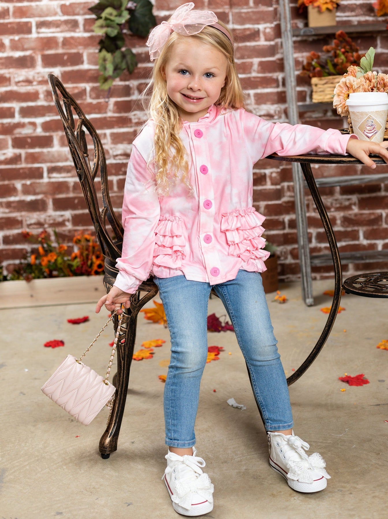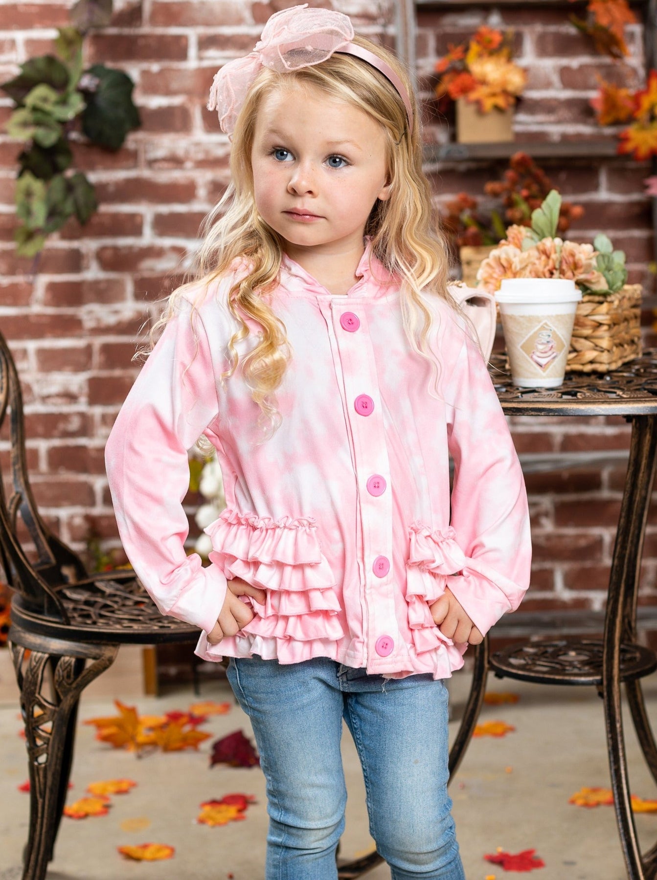 We are living for the lush tie-dye colors and fancy ruffle details in this button-down hoodie cardigan. Just the thing to style up your diva's everyday wardrobe!