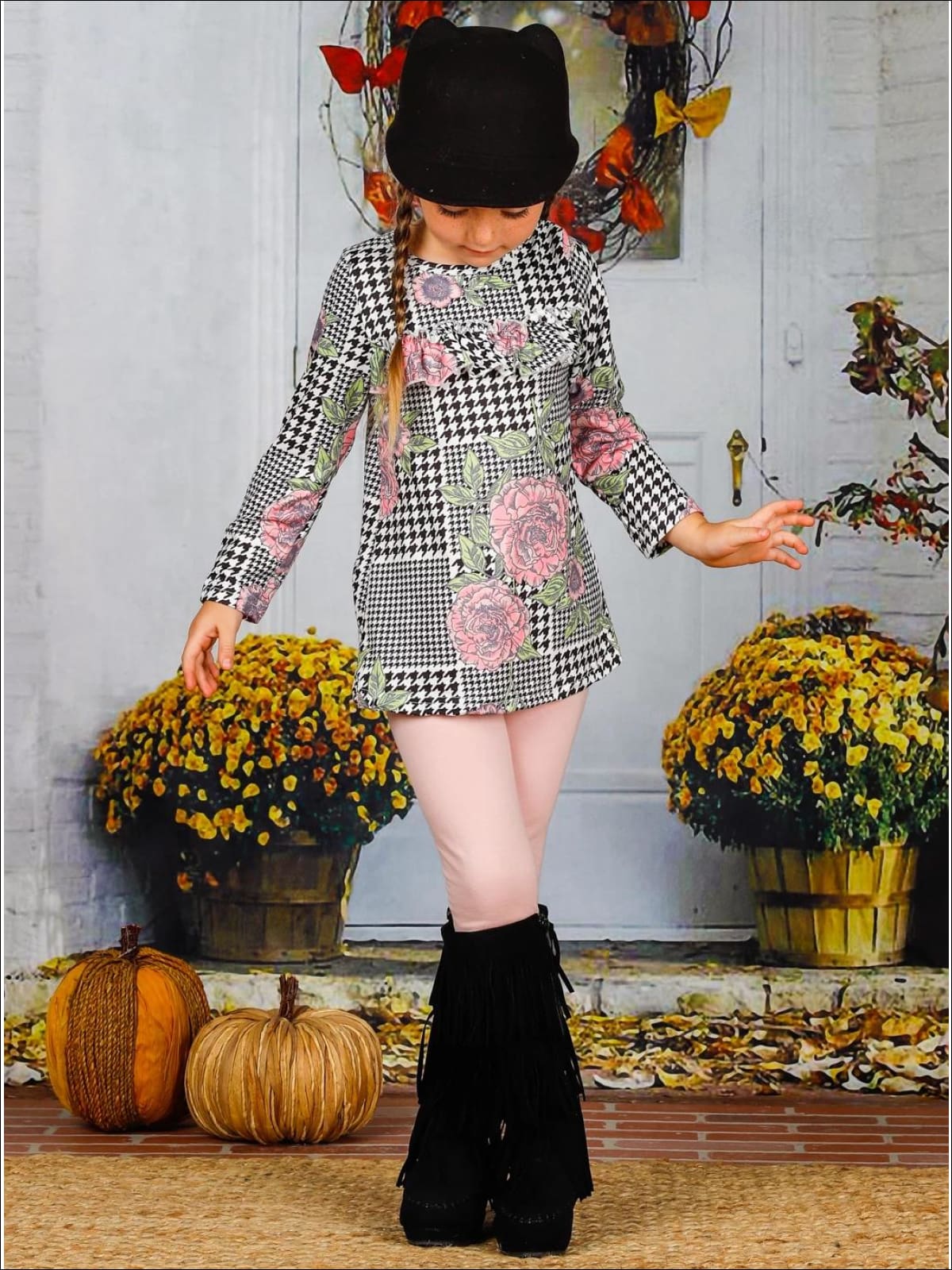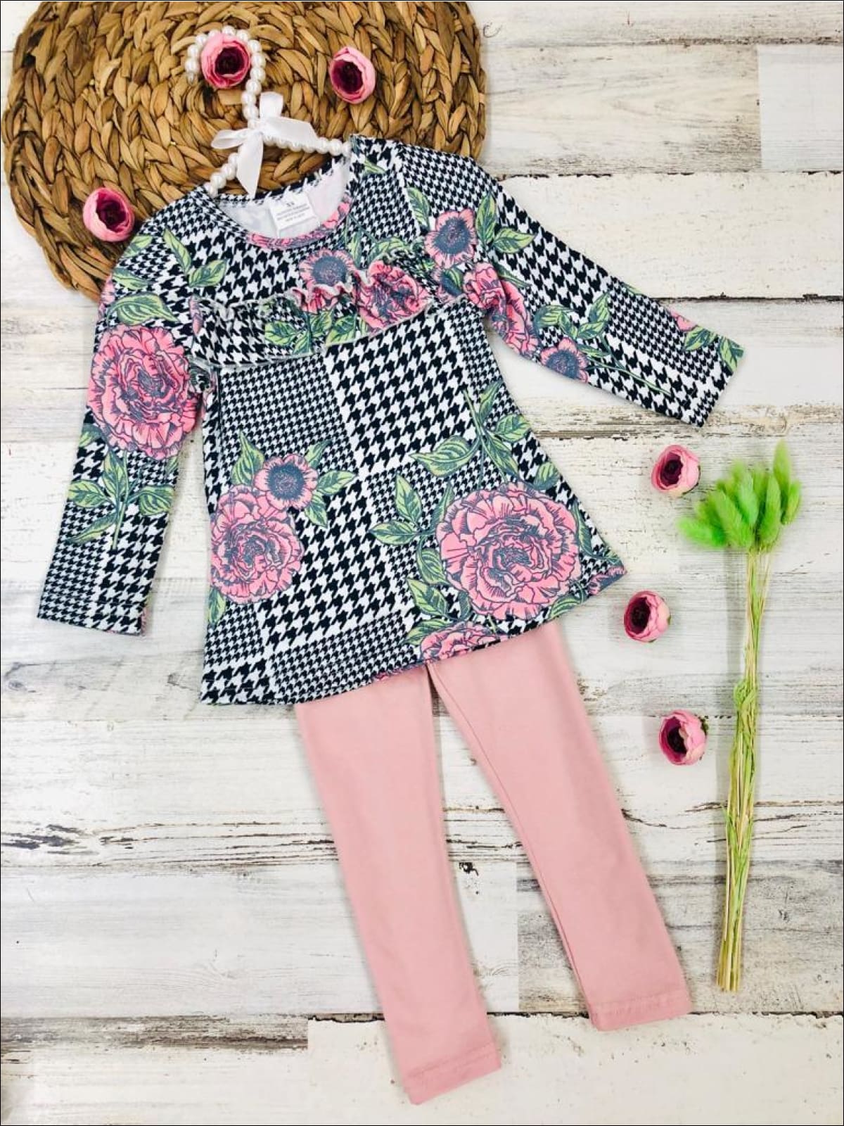 A houndstooth print gives this tunic preppy flair while a pop of roses and a center ruffle add sweet appeal to her fall look. This vividly designed set will keep her looking fresh & playful from head to toe.