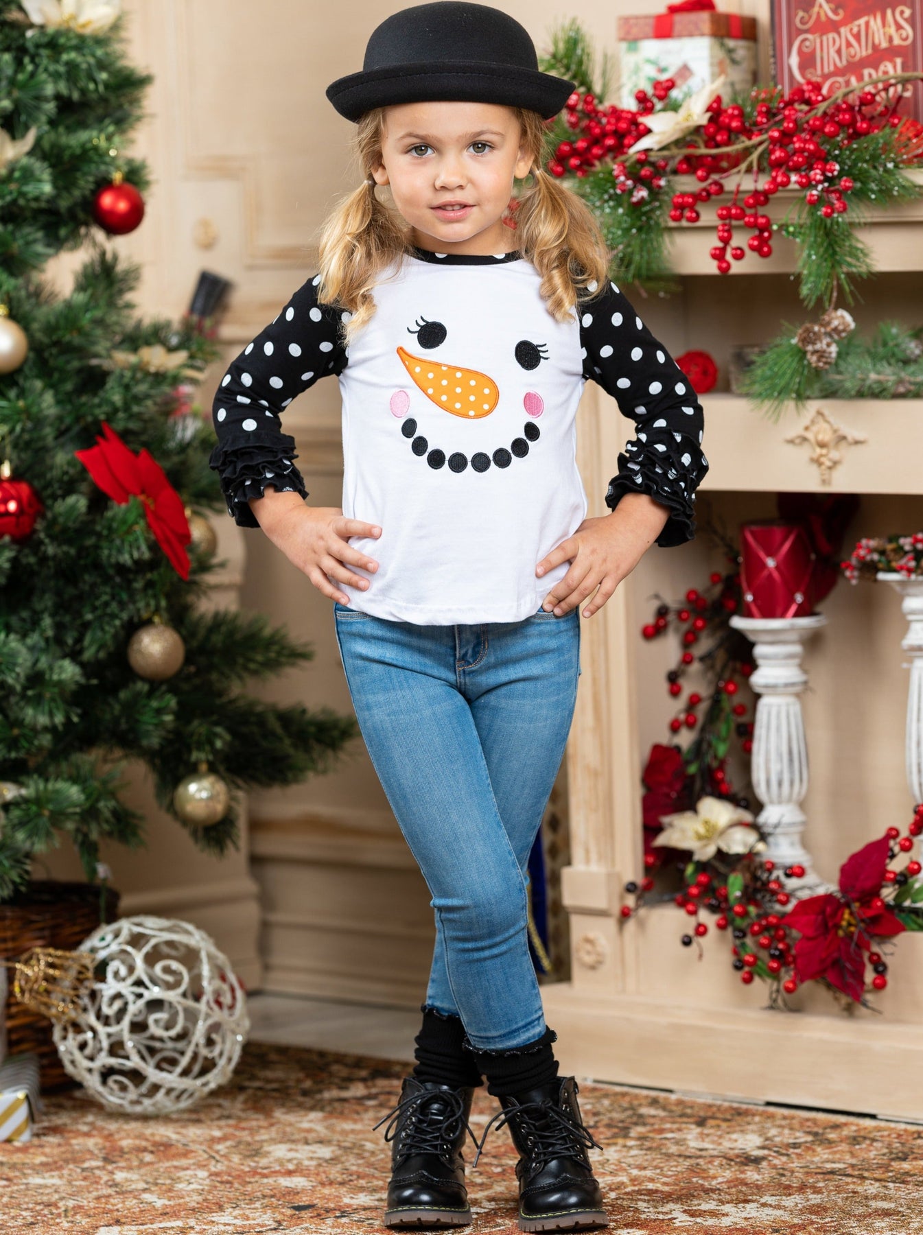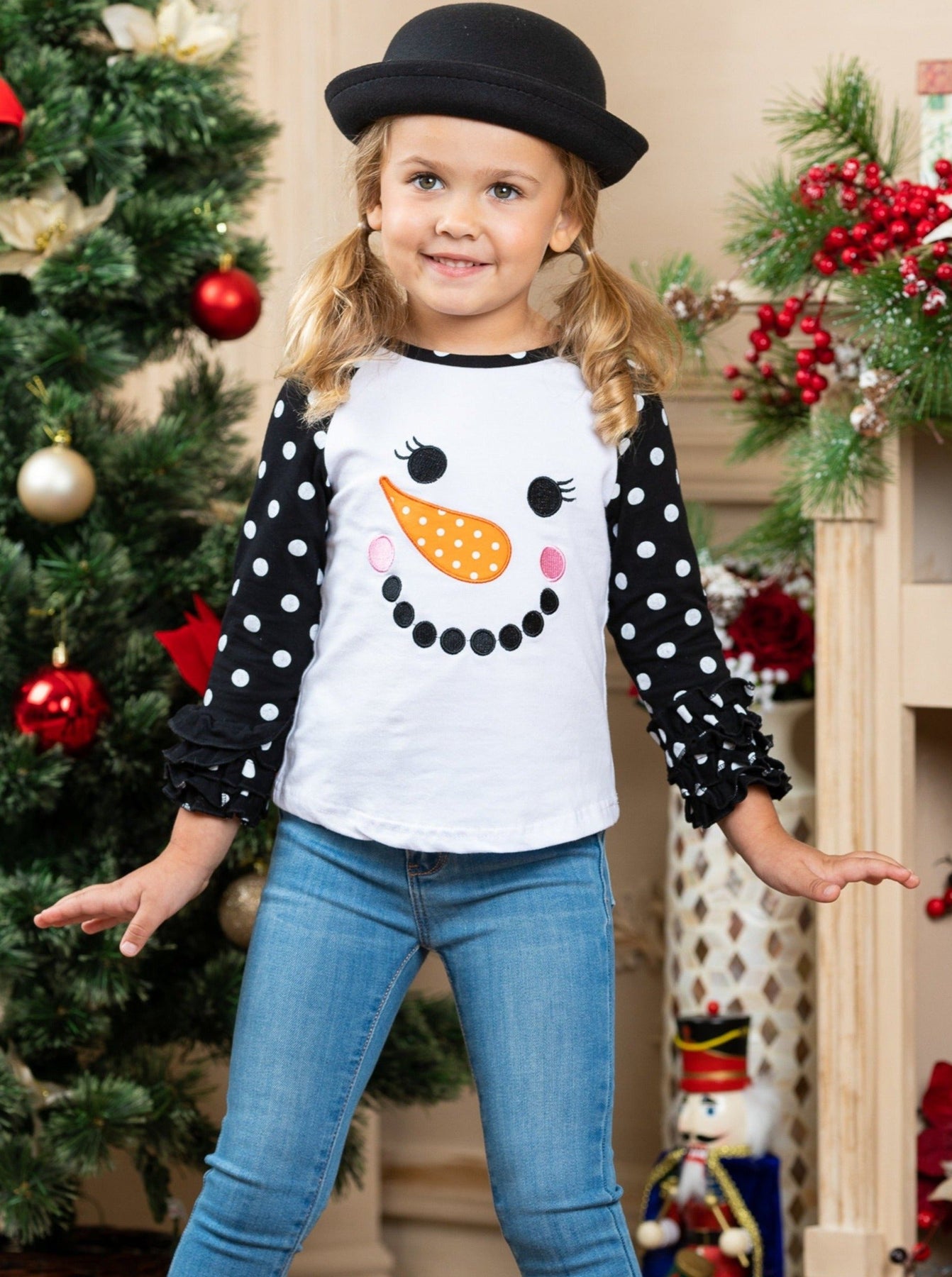 Everyone knows snowmen love warm hugs! Layer your snow girl's look with happy holiday style in this polka dot raglan top boasting snowman graphic details. This top will make for many festive outfits during the merry holiday season!