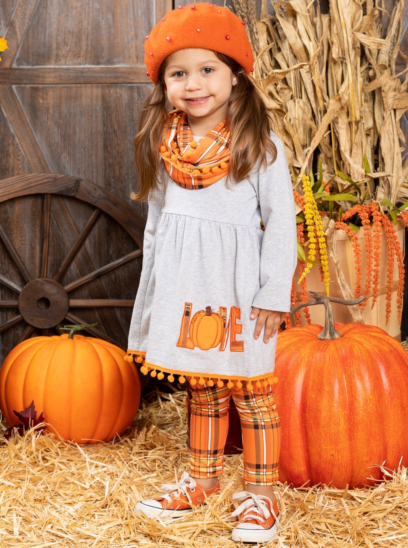 Long-sleeve tunic with plaid pumpkin "Love" graphic applique on skirt, pom-pom tassel hem, plaidleggings, and a matching infinity wrap scarf