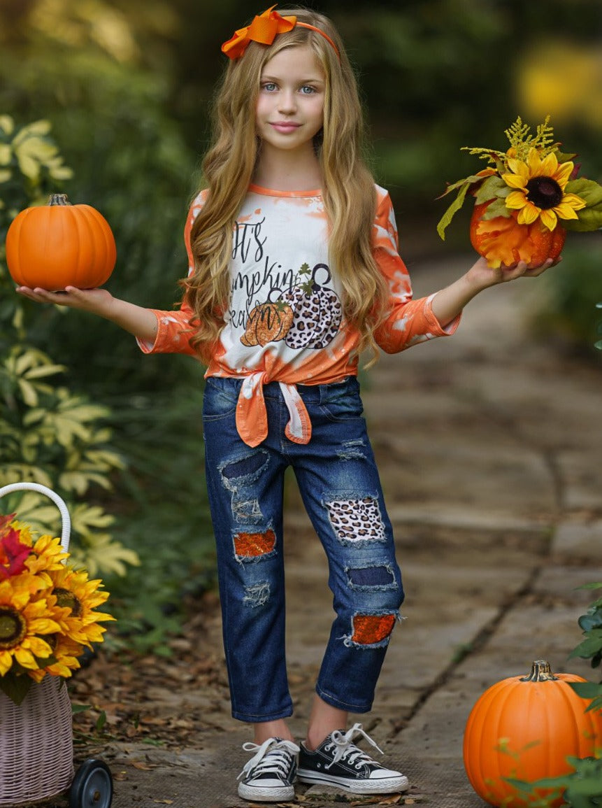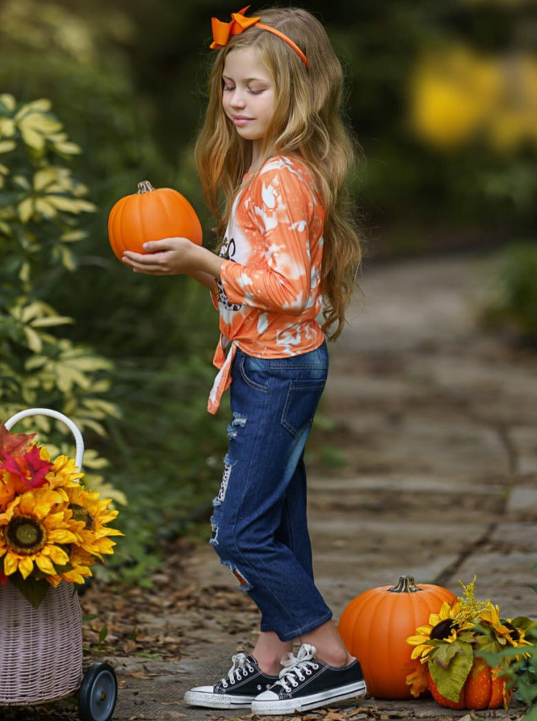 Make the pumpkin season oh-so-special for your princess with this festive set to rack up praise and compliments. A knot-hem tie-dye top and jeans with matching sequin patches will keep her on-trend and looking sweeter than pumpkin pie!