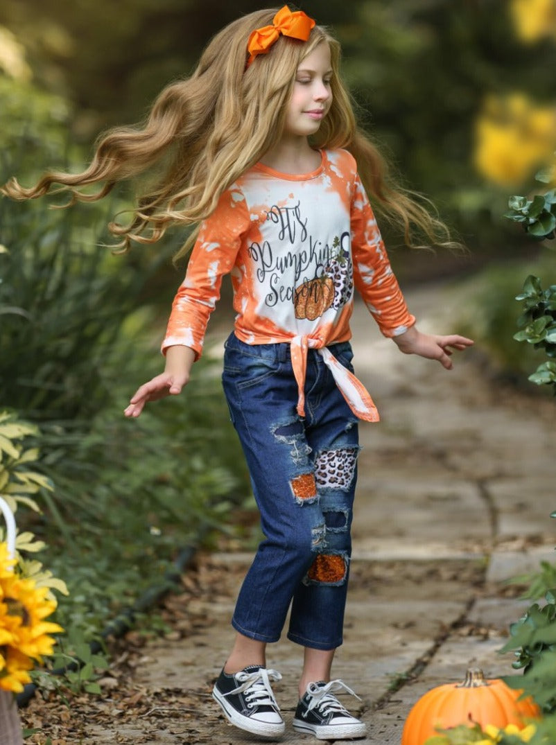 Long-sleeve knot-hem tie-dye top with "It's Pumpkin Season" graphic print, and leopard print/glitter patched distressed jeans