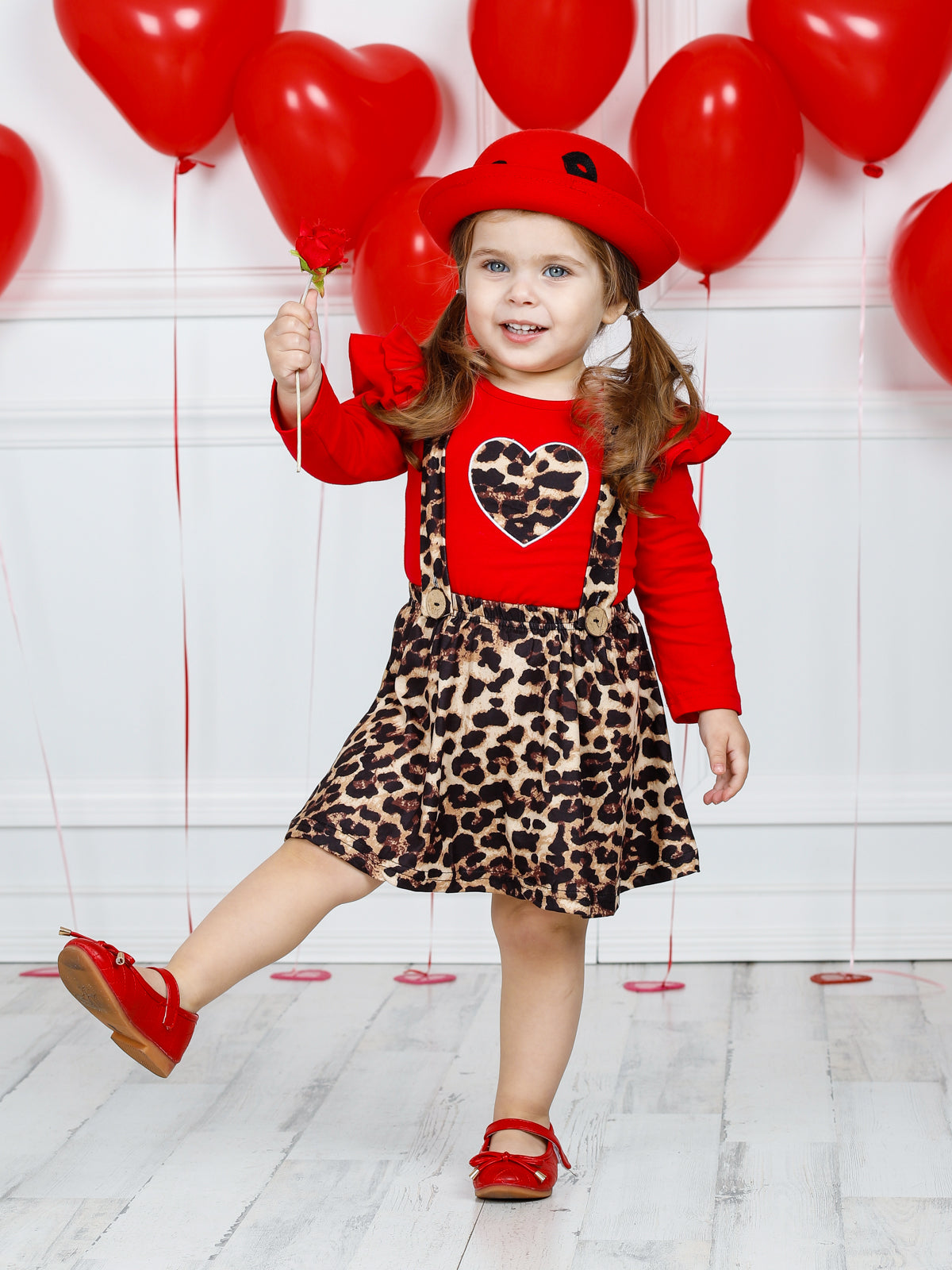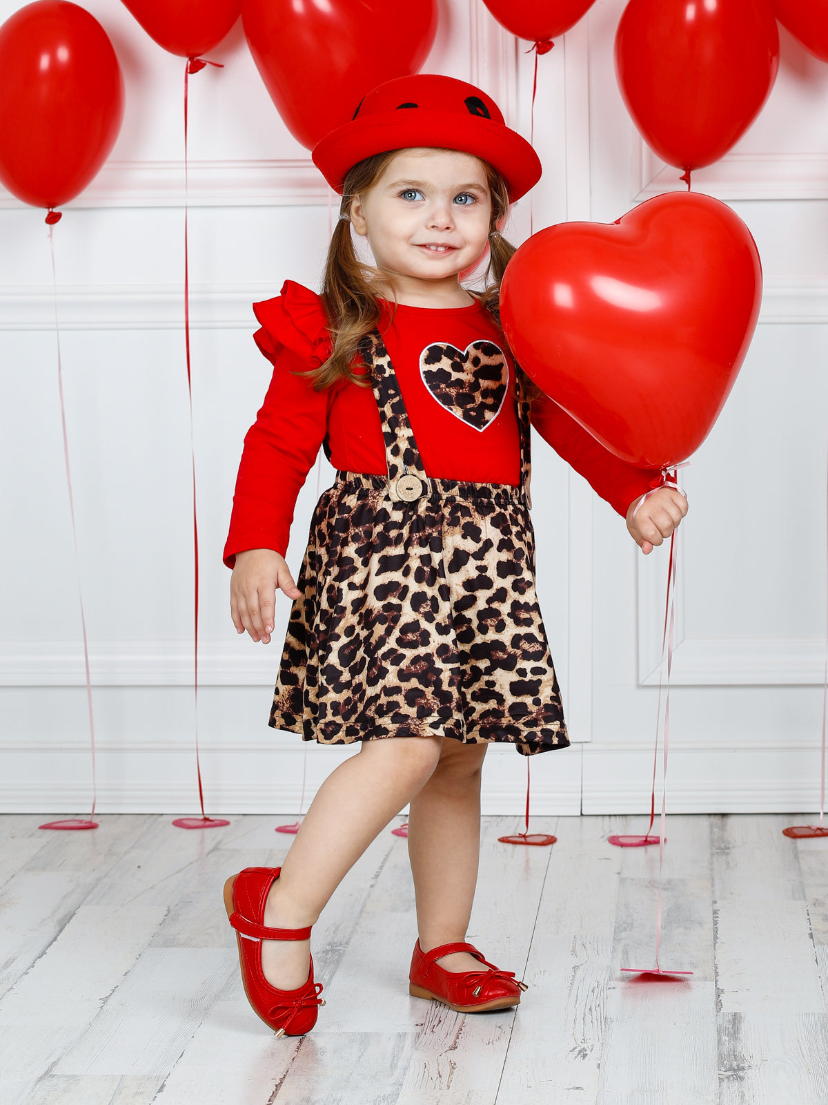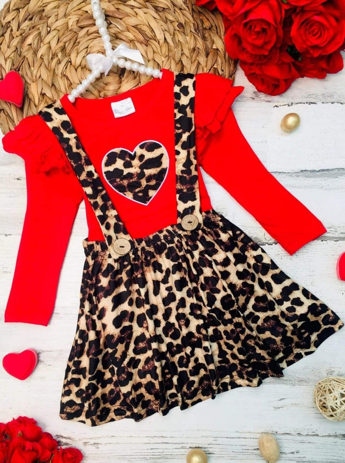 • The two-piece set features a red long sleeve ruffle shoulder top with leopard print heart and leopard overall ruffle skirt with buttoned suspenders