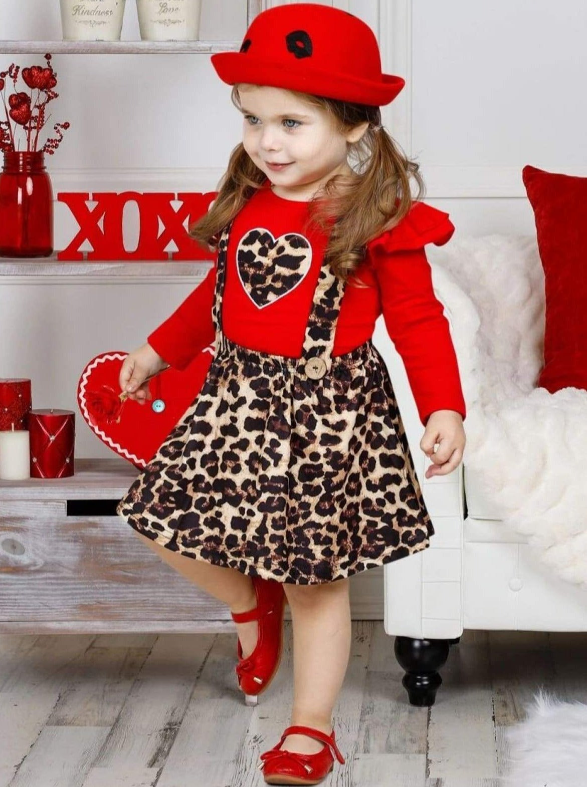 You'll HEARTLY believe your eyes when you see your Valentine dressed in her casual best thanks to this precious leopard pinafore skirt set. Whether she's having a blast at her classroom party or exchanging cards with loved ones, she'll love all the compliments on her fabulous style.