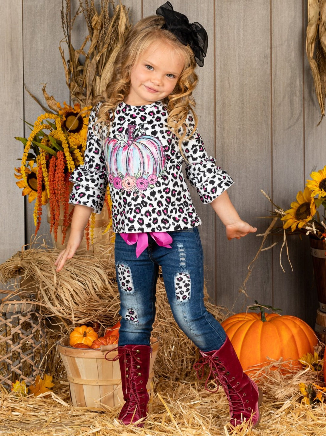 • 3/4 sleeve leopard print top with pumpkin graphic print, double ruffle cuffs, and matching patched jeans with satin sash belt