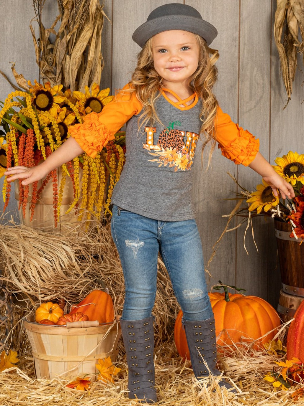 Girls Cute Fall Tops | Pumpkin Ruffle Raglan Top - Mia Belle Girls