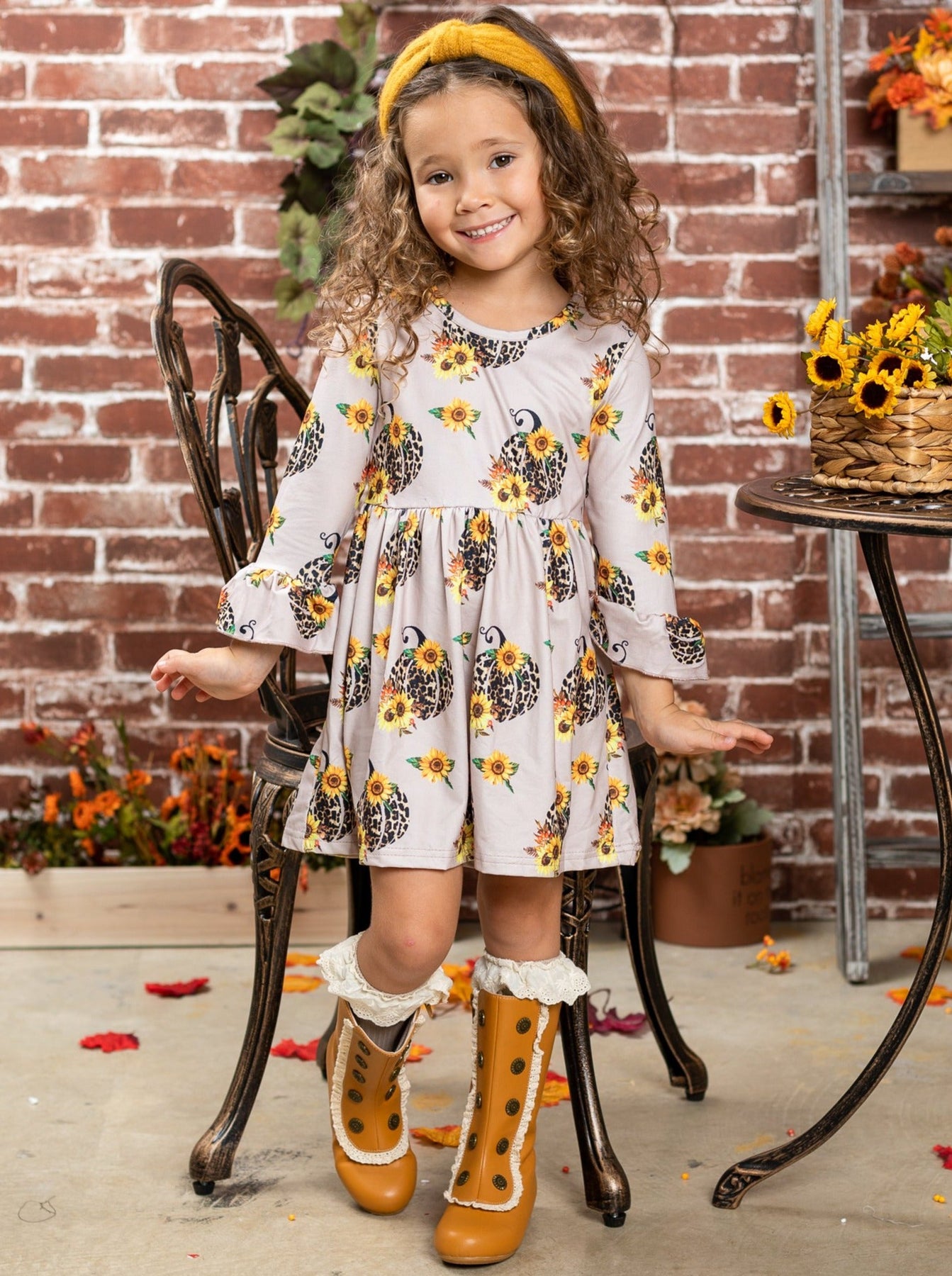Dress features ruffled sleeves and a leopard, sunflower pumpkin print