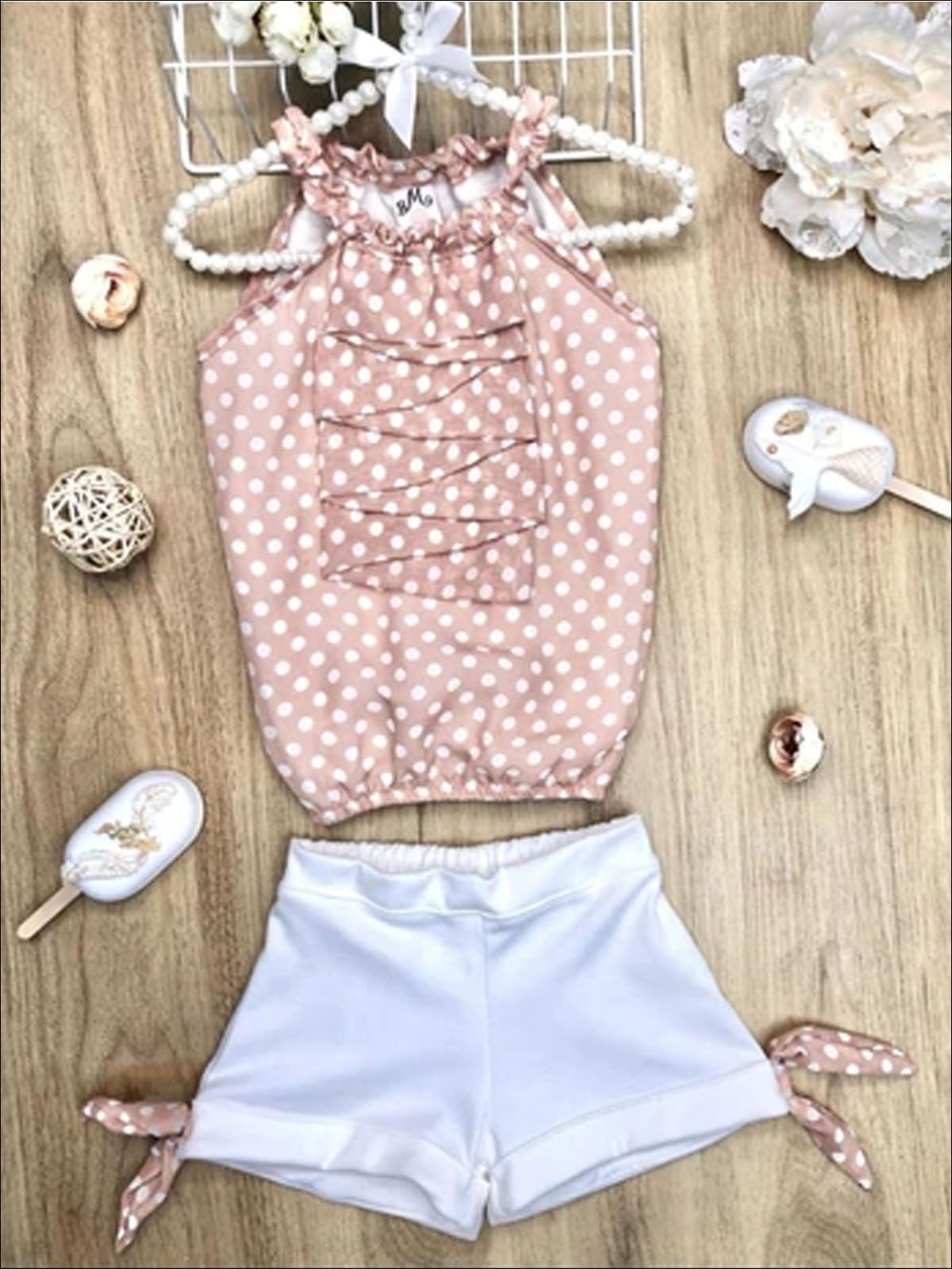 Girls Polka Dot Ruched Halter Neck Cascade Front Top & Cuffed Bow Shorts Set - Girls Spring Casual Set