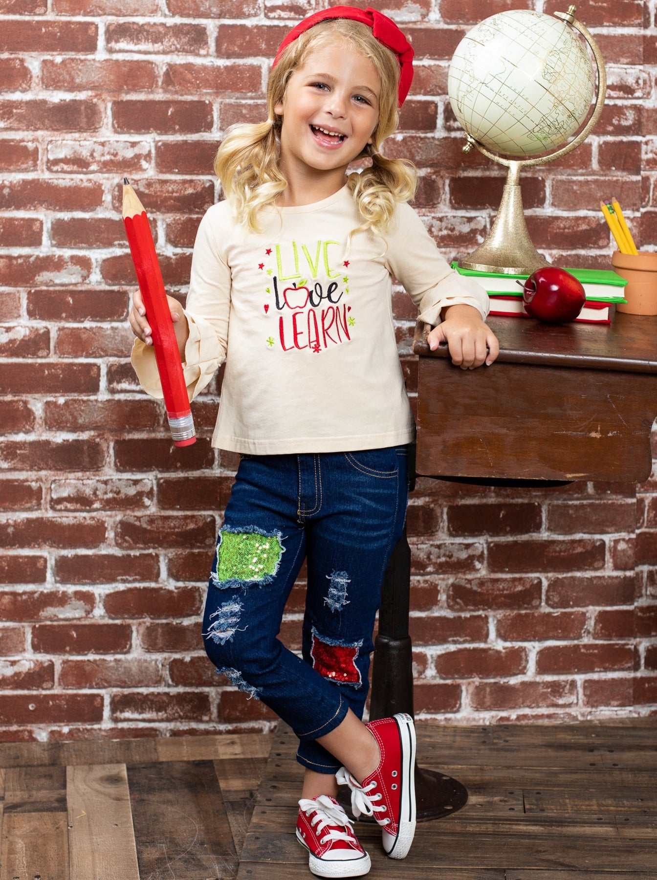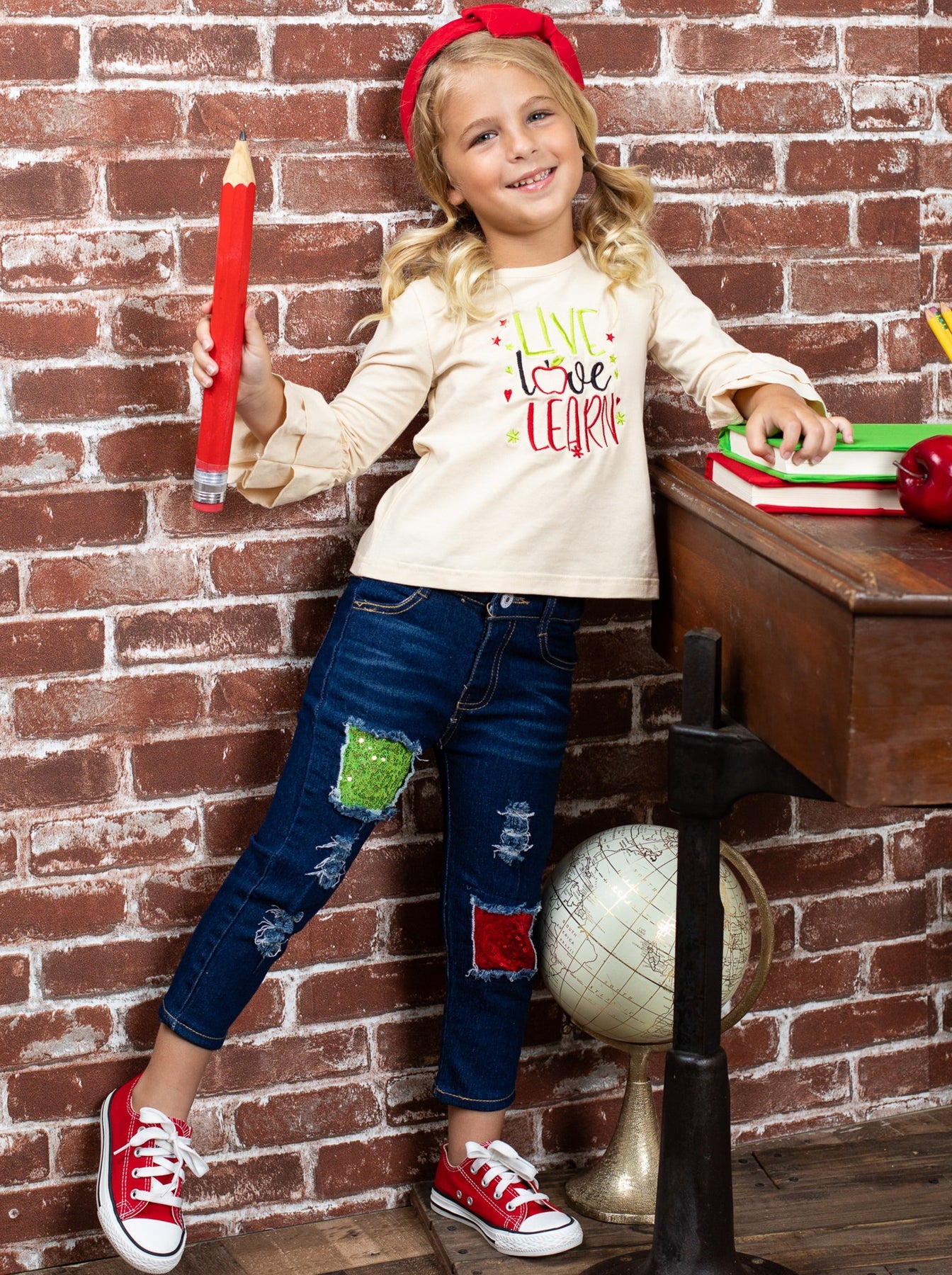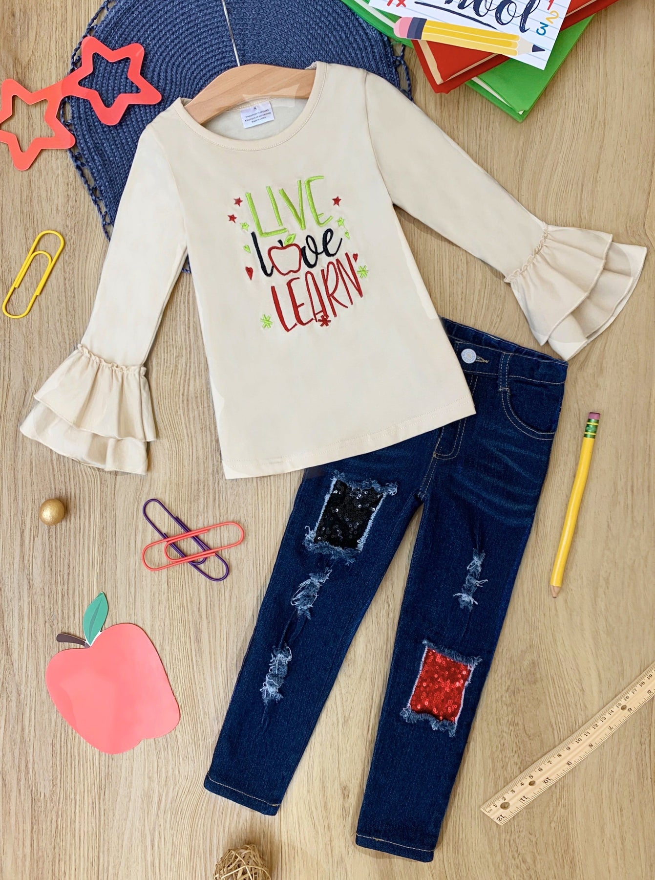 "Live, Love, Learn" long-sleeve top with ruffle cuffs and sequin patched jeans