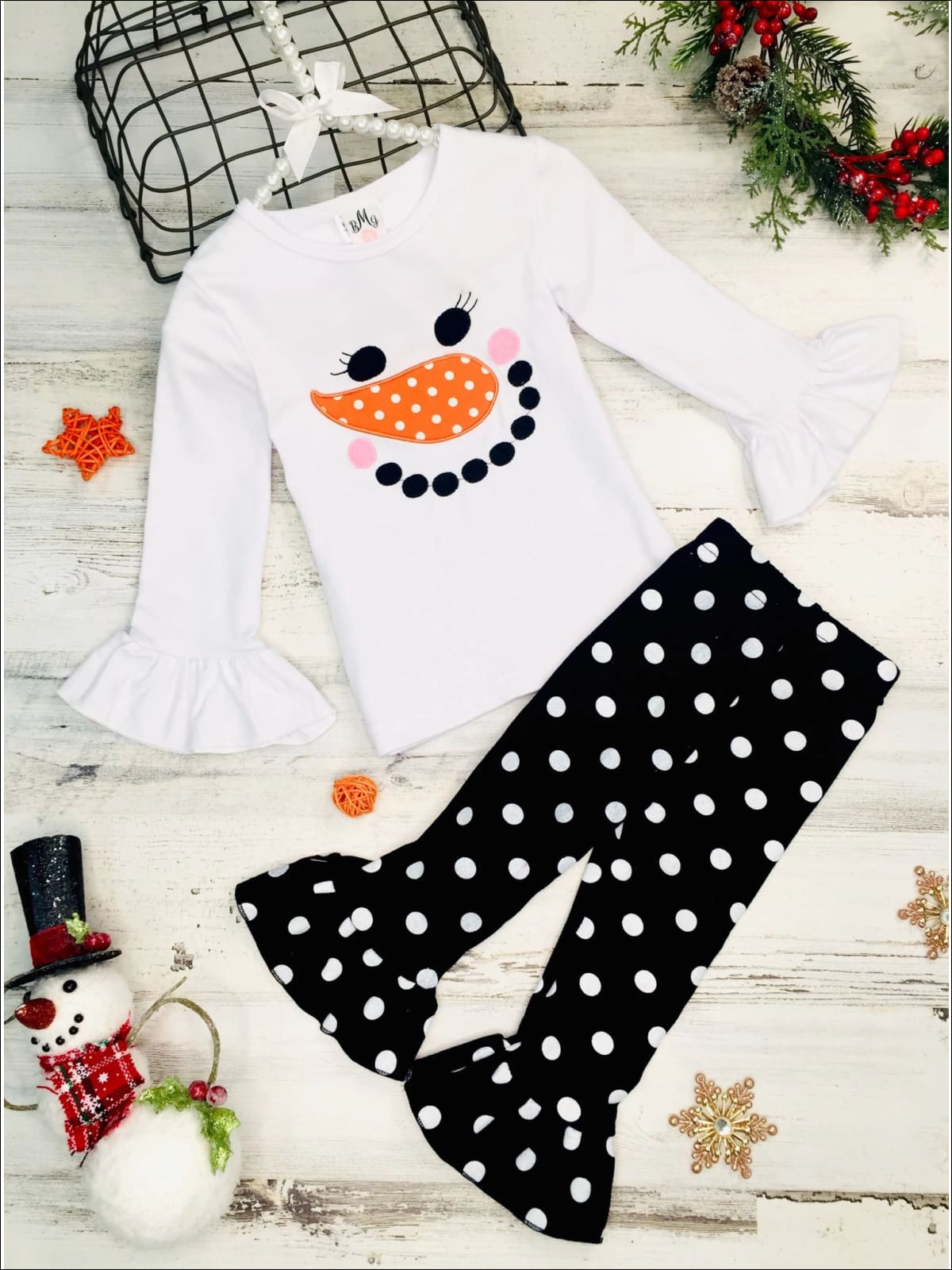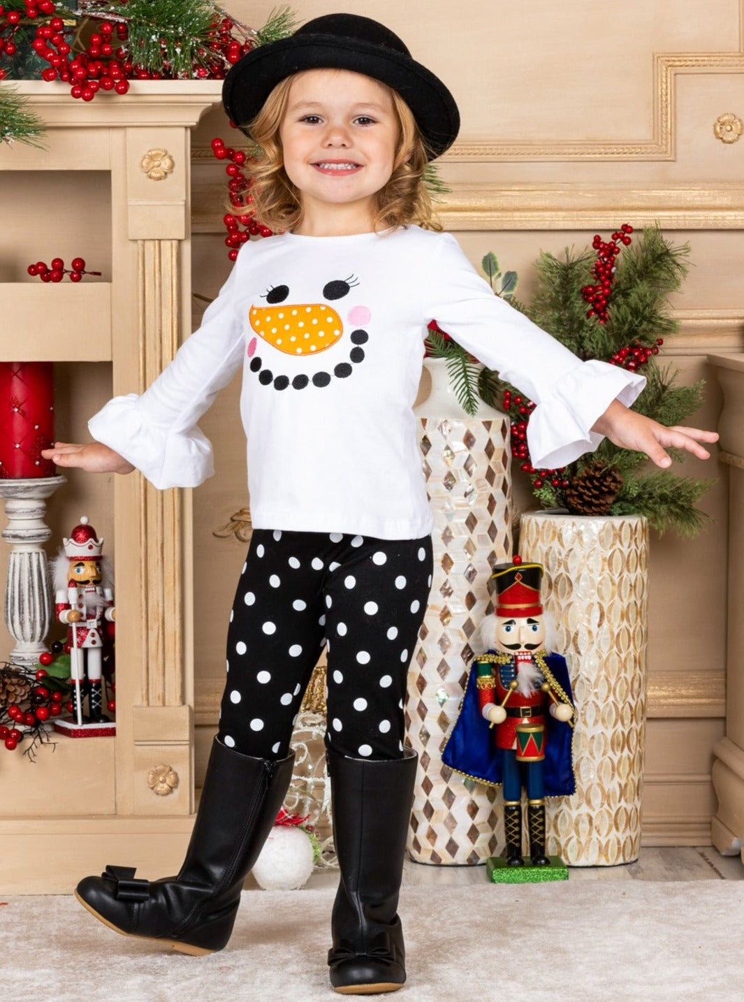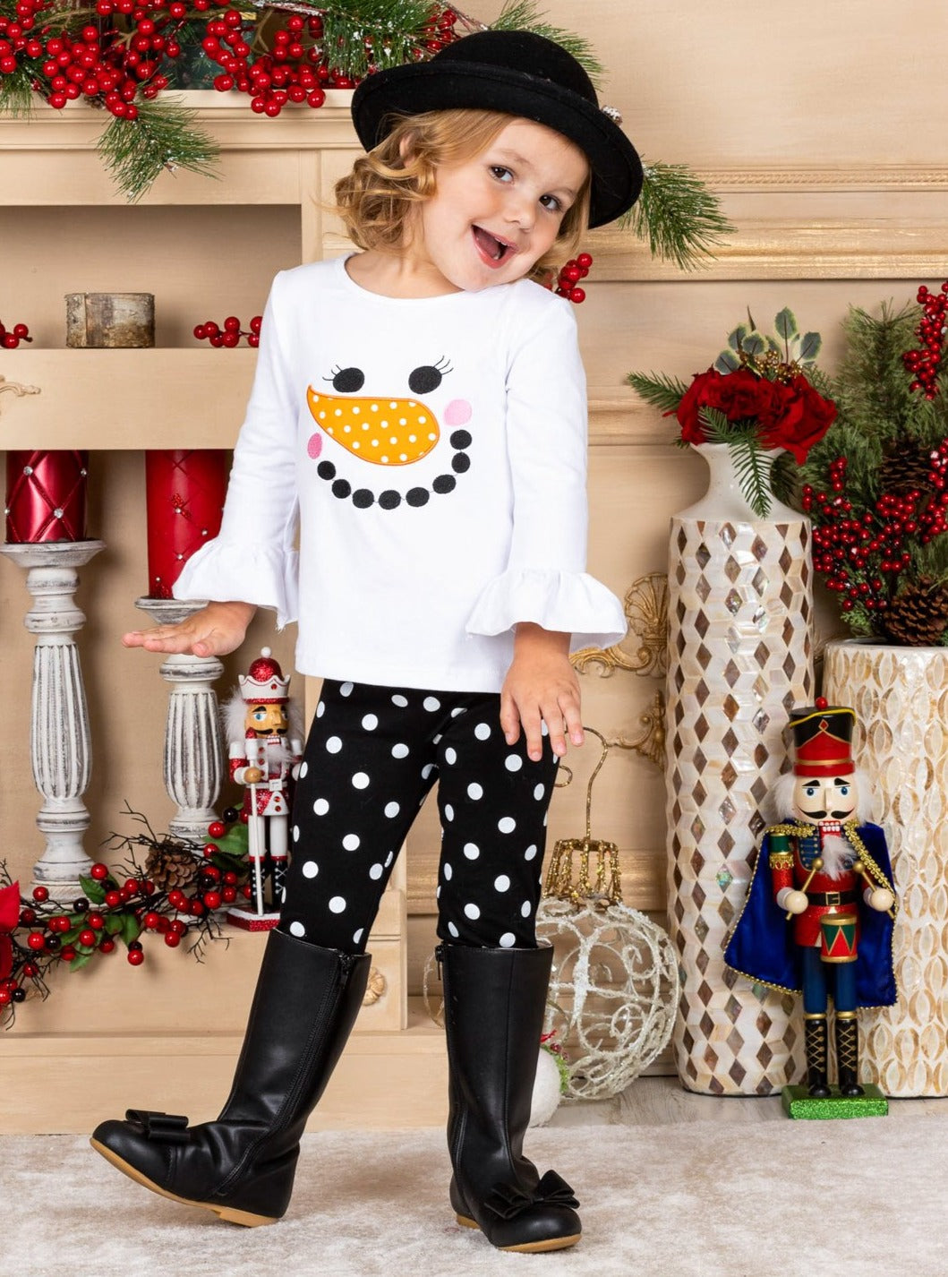 Girls Long Ruffled Sleeve Snowman Top & Ruffled Polka Dot Legging Set