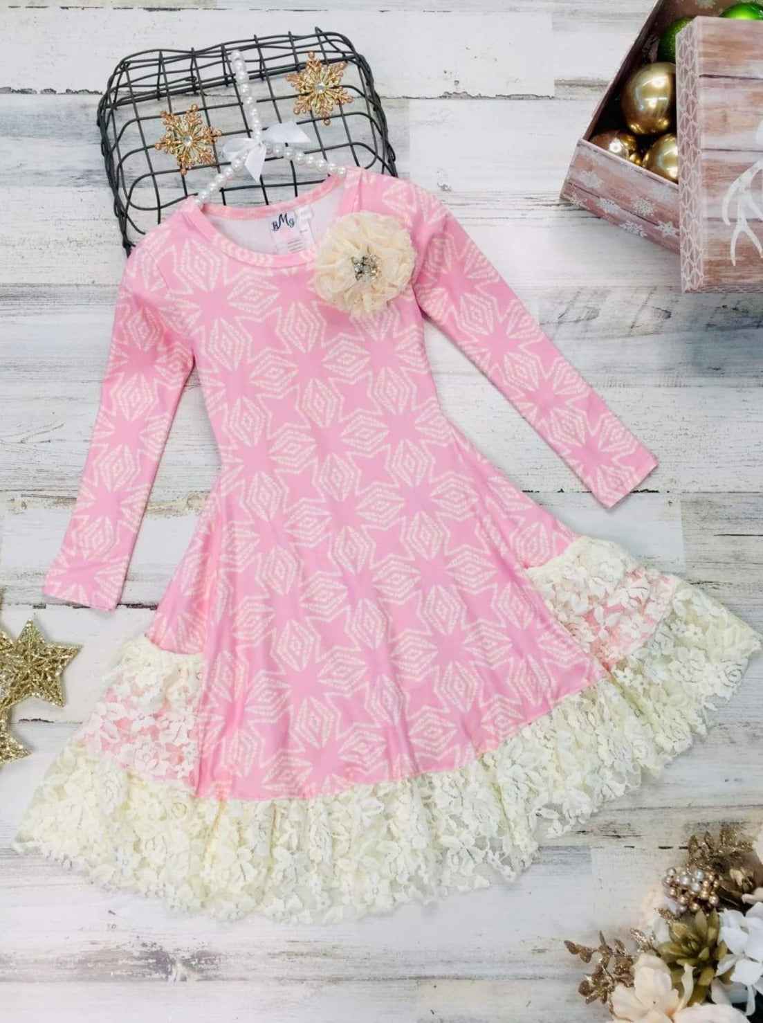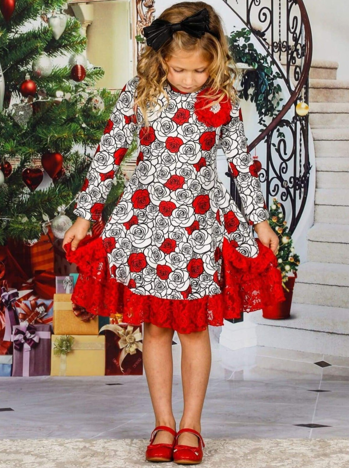 Long-sleeve floral or snowflake print dress with collar floral applique, lace side pockets, ruffle lace hem