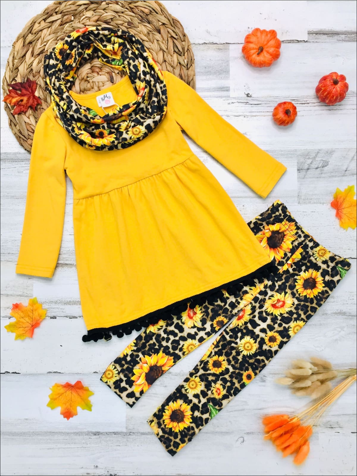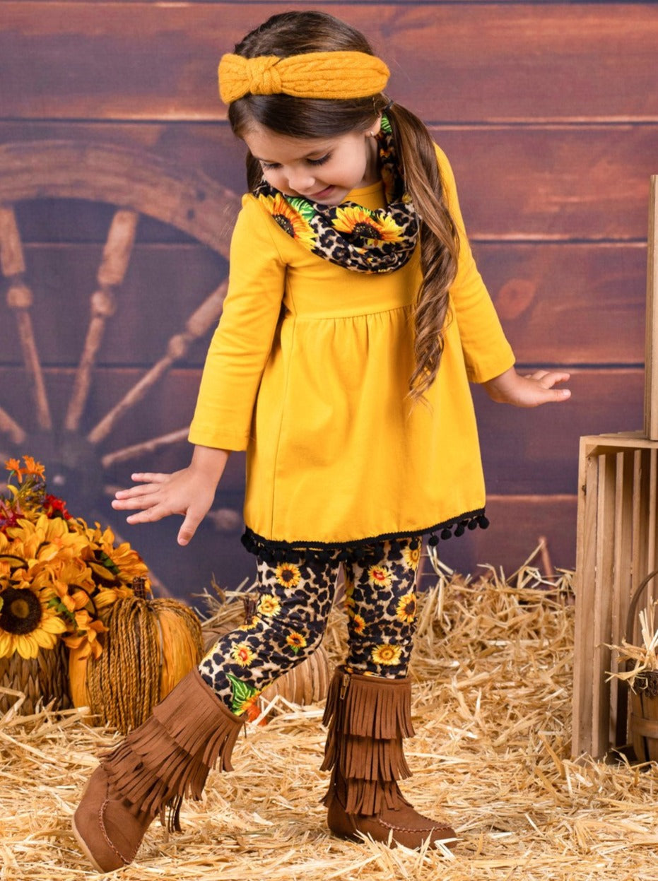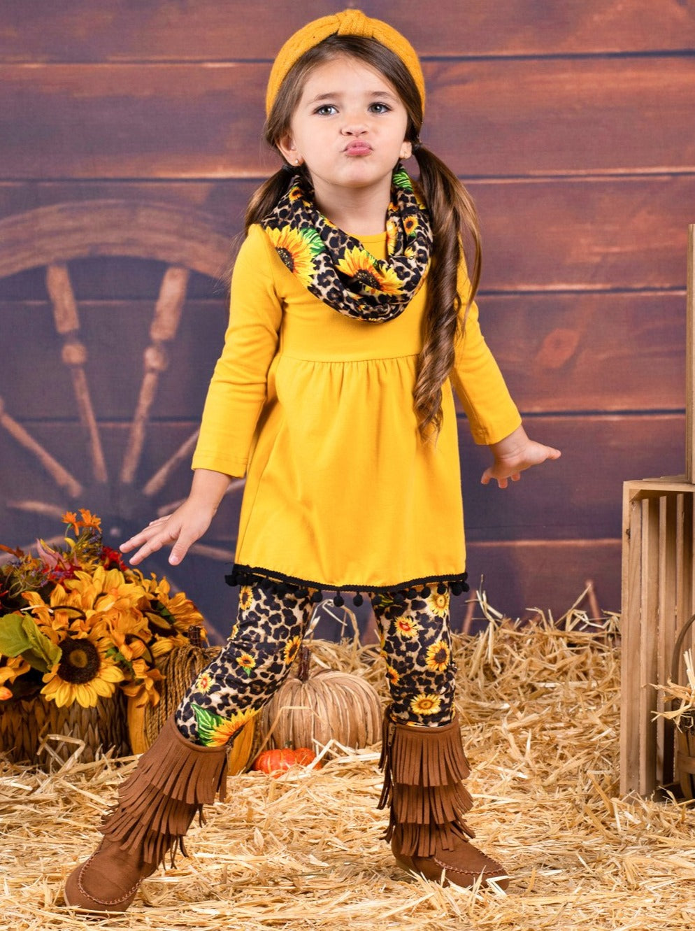 This fall legging set comes enhanced with fun pom-poms at the hem of the tunic to make little girls the brightest & trendiest cuties around. The mix of sunflowers and leopard print create a FALLbulous ensemble fit for your princess.