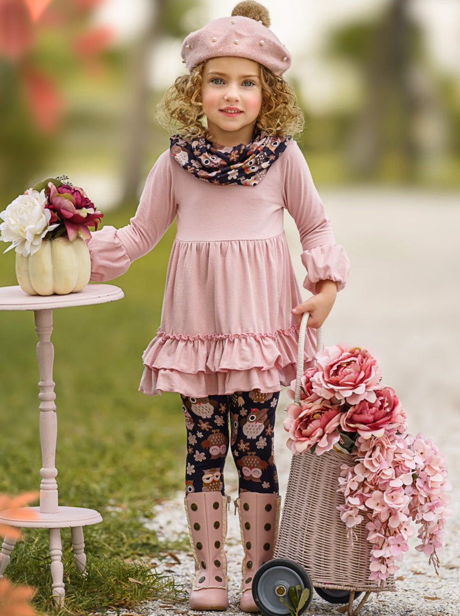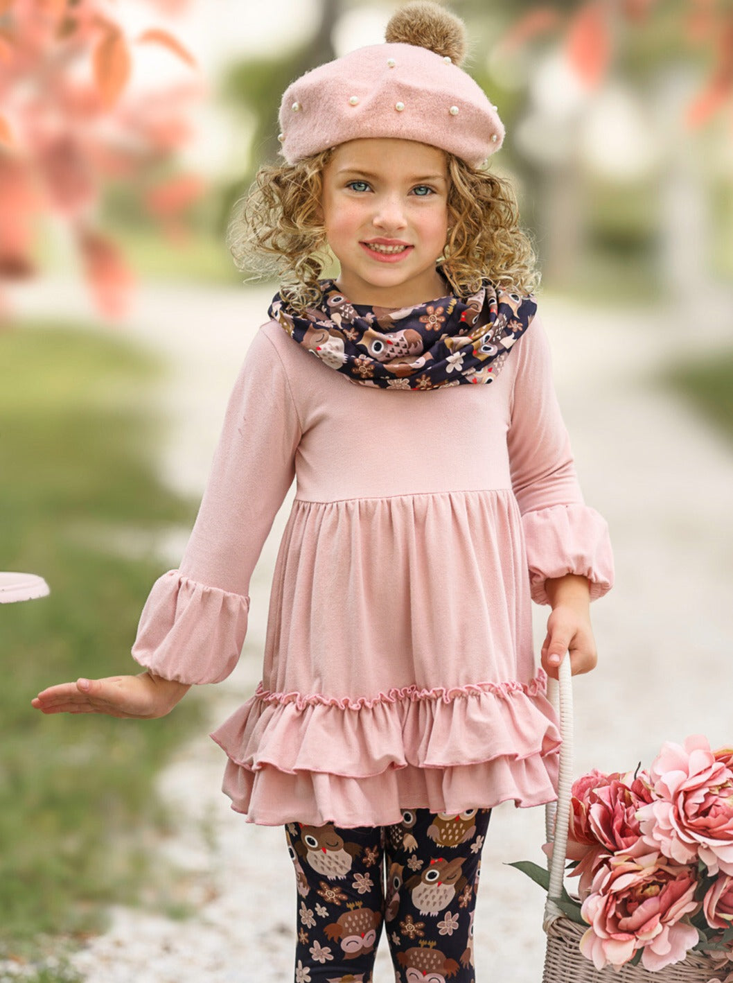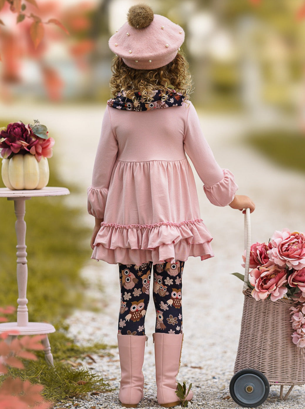 Long-sleeve tunic with puffed cuffs, double ruffle hem, owl print leggings, and matching infinity wrap scarf