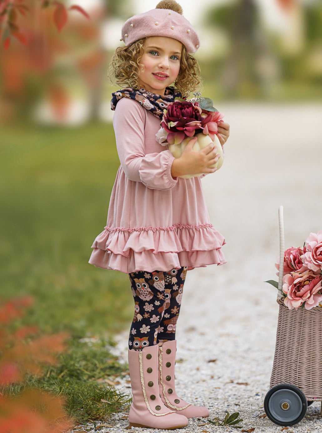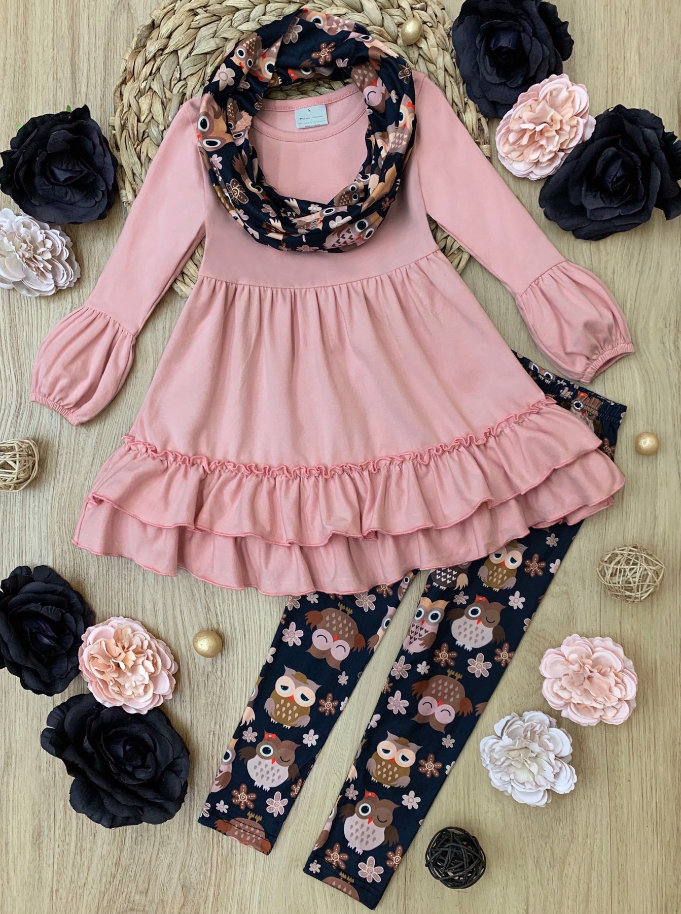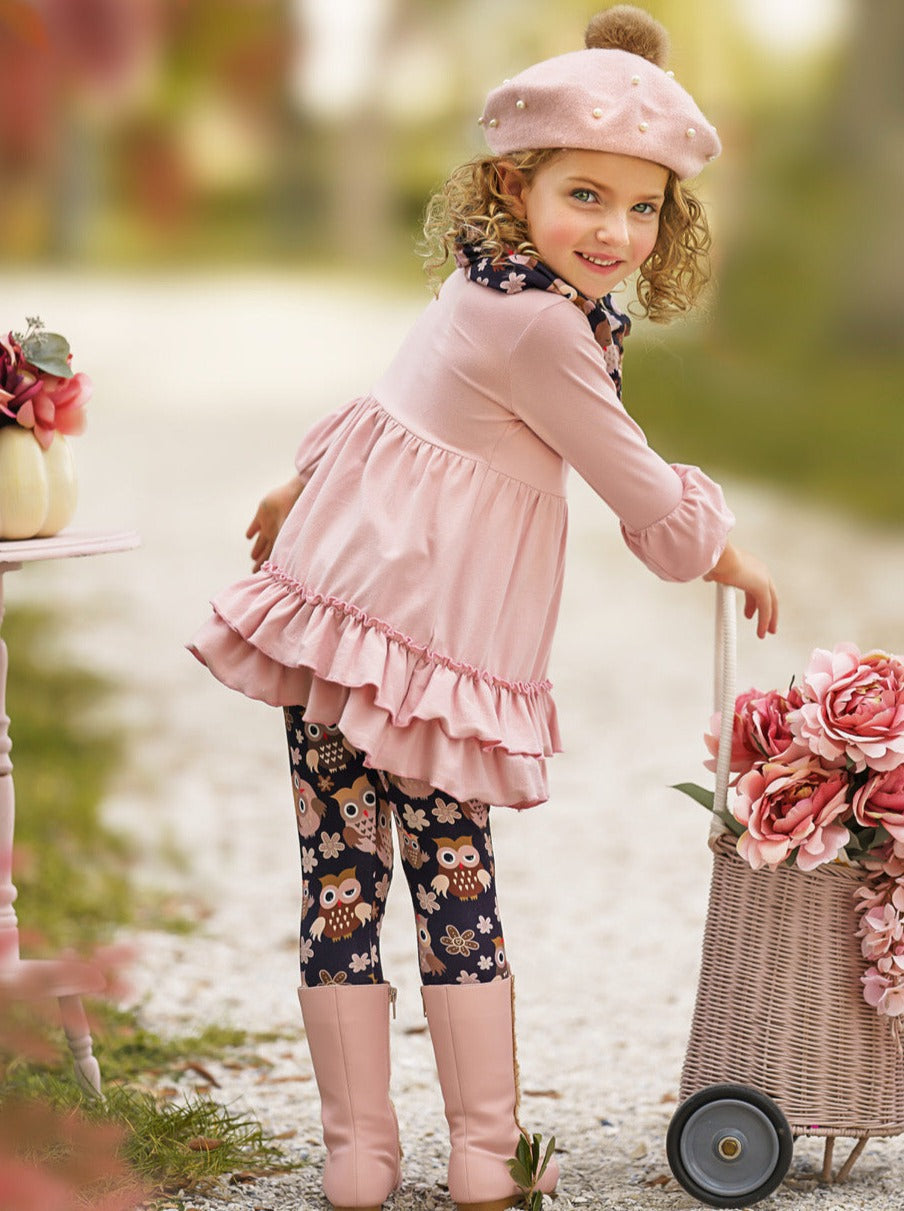 Long-sleeve tunic with puffed cuffs, double ruffle hem, owl print leggings, and matching infinity wrap scarf