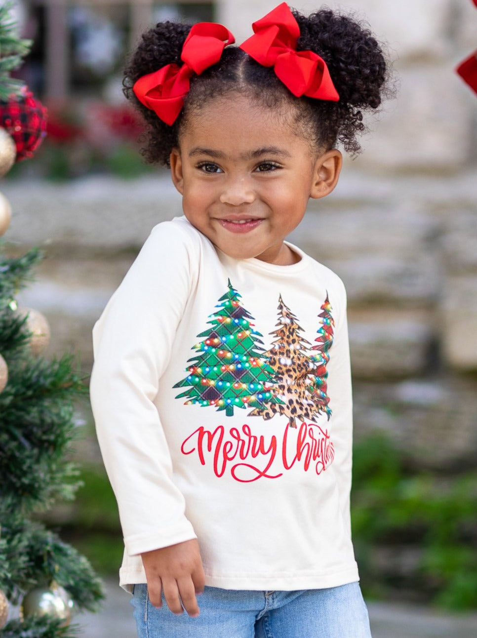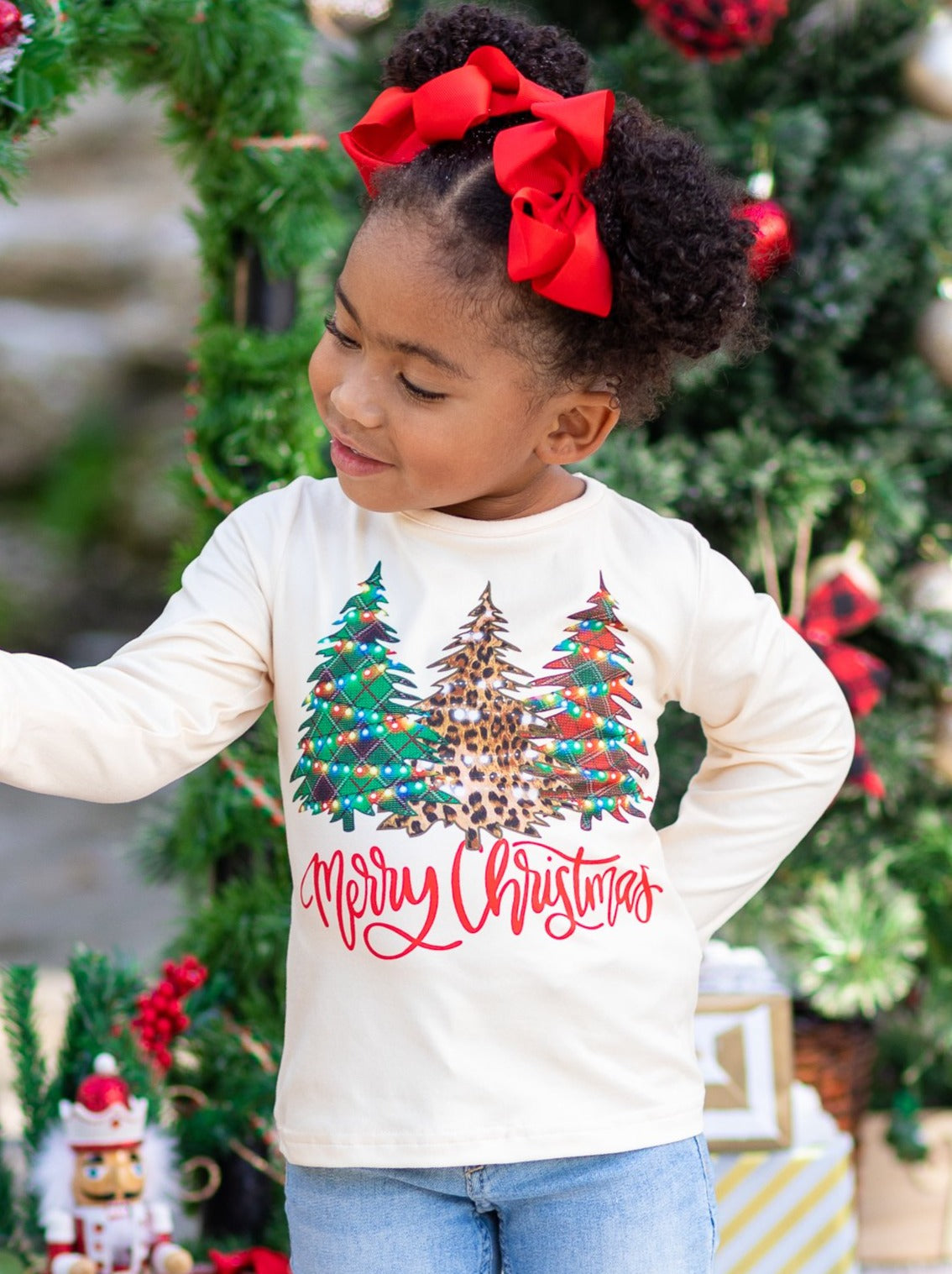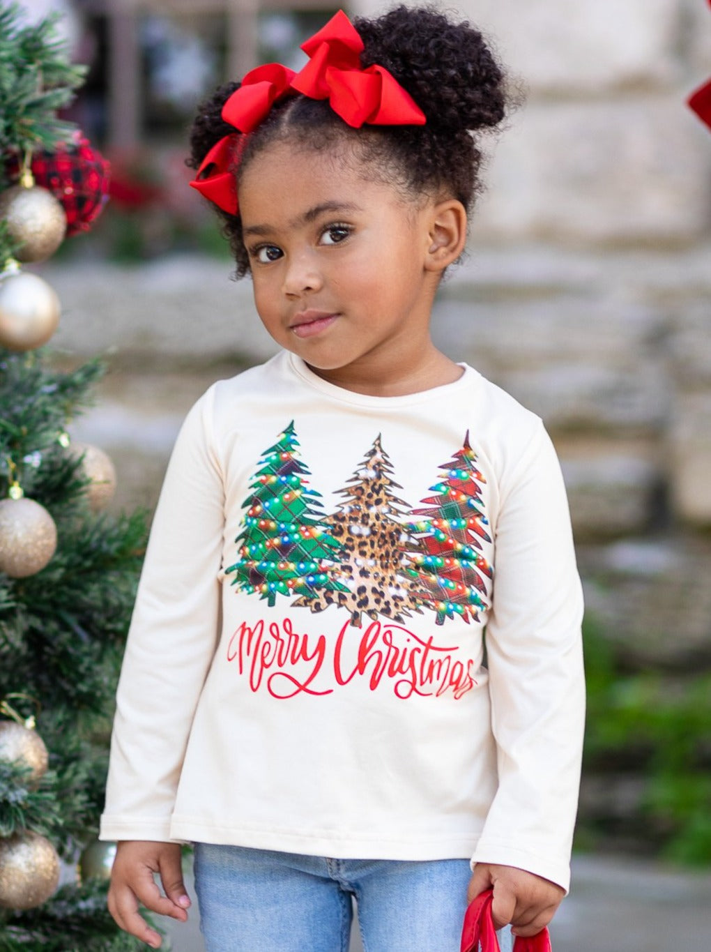 • Looking to add a little Christmas magic to your sugarplum's closet? Get her this sweet long-sleeve graphic tee. Delightful Christmas trees dazzle with plaid and leopard print patterns and cheerful font below