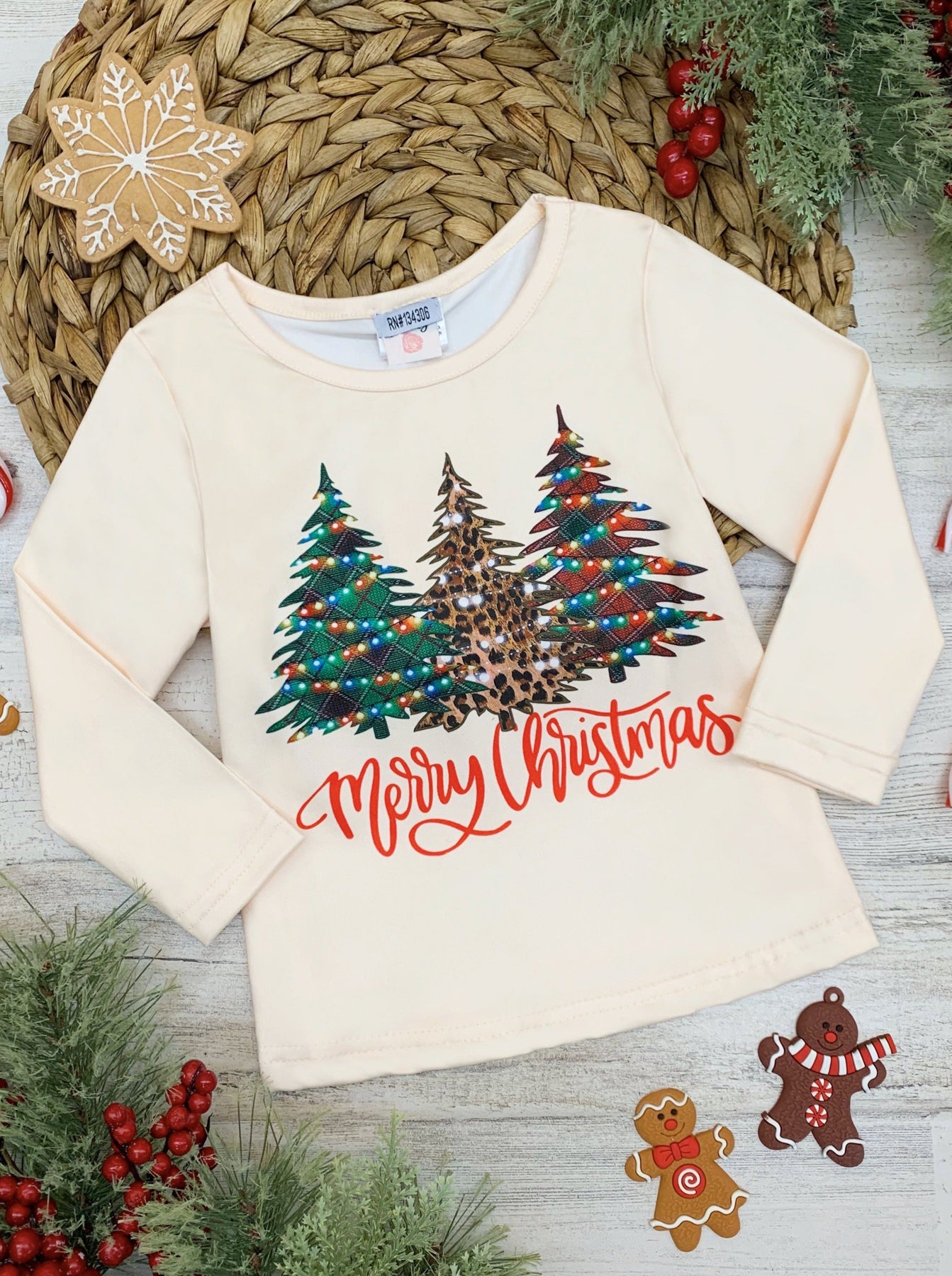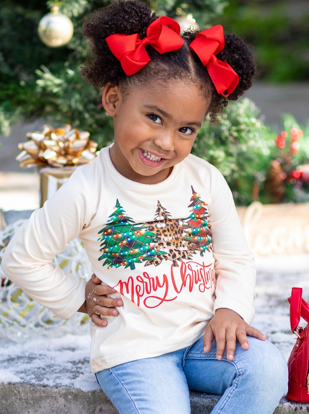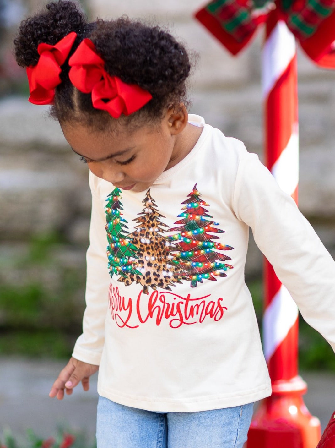 • Looking to add a little Christmas magic to your sugarplum's closet? Get her this sweet long-sleeve graphic tee. Delightful Christmas trees dazzle with plaid and leopard print patterns and cheerful font below