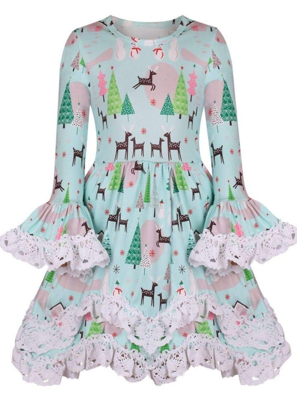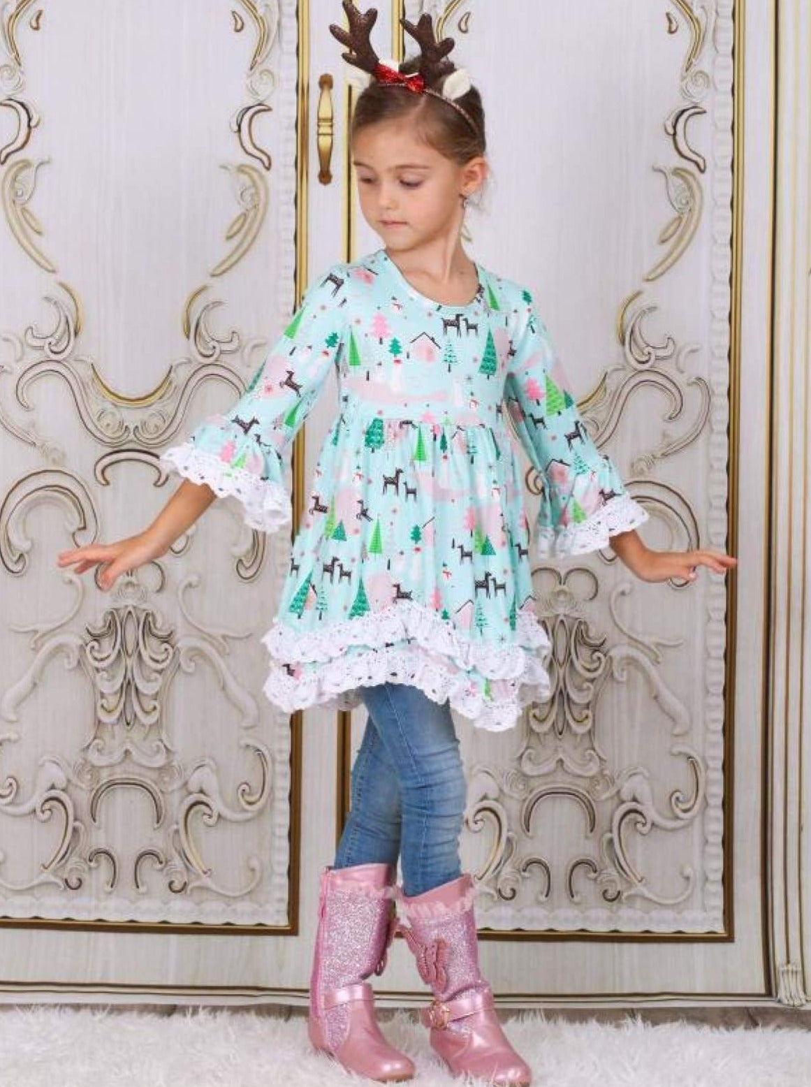 Girls Mint Reindeer & Christmas Tree Handkerchief Tunic with Lace Trim - Girls Christmas Top