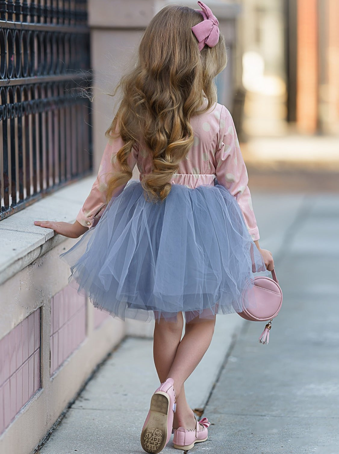 Long-sleeve tutu dress with polka dot blazer-style bodice and grey gather tulle skirt