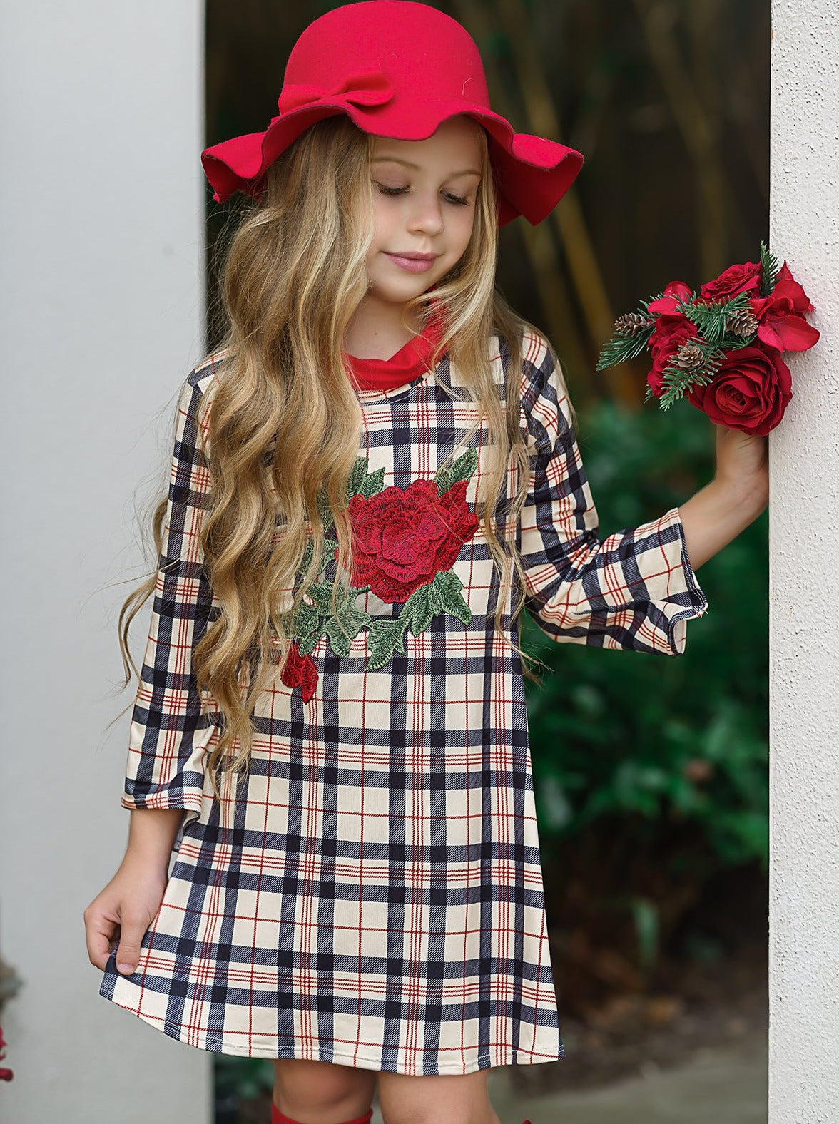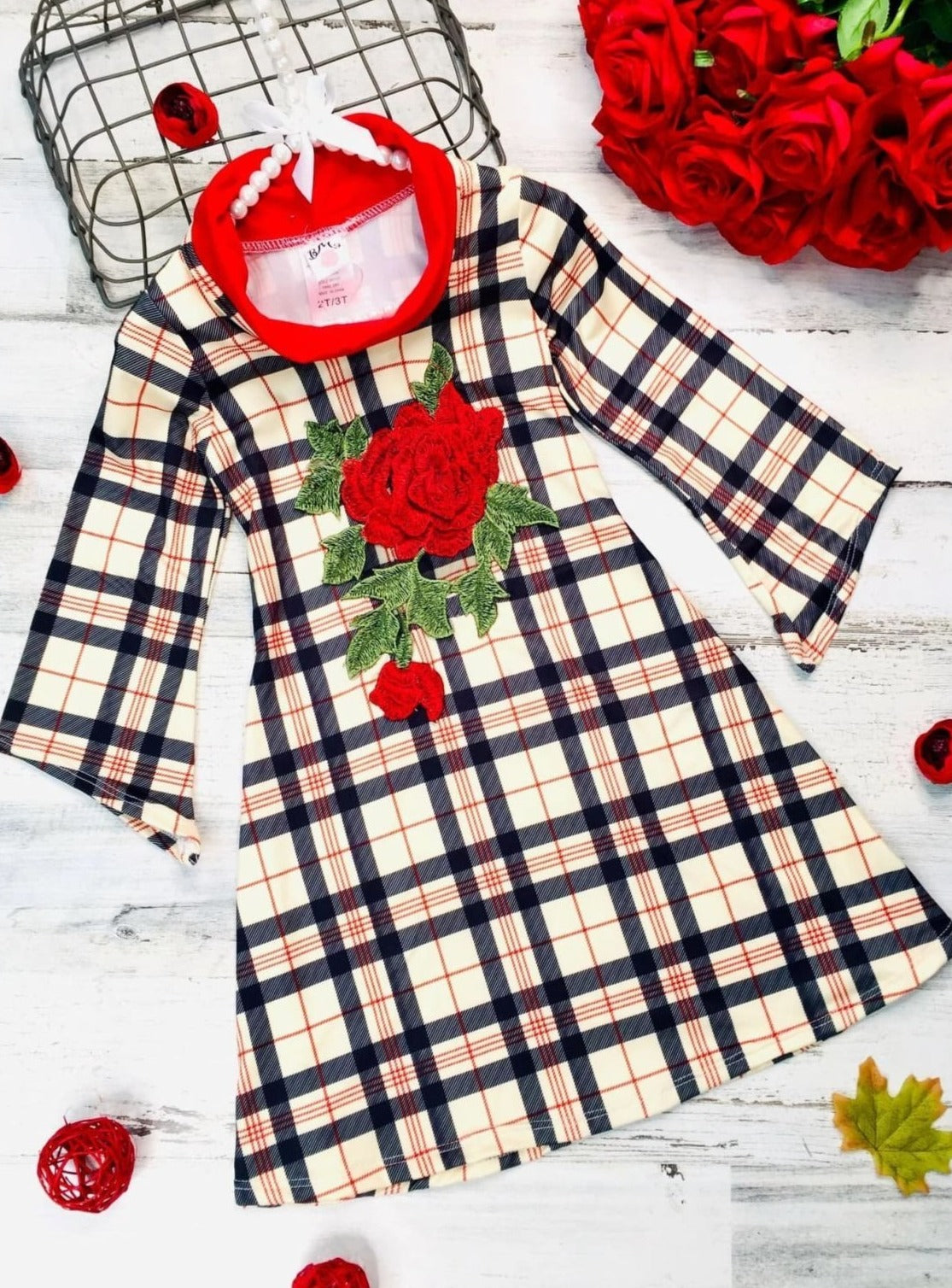 Long-sleeve turtleneck plaid winter dress with asymmetric cuffs and embroidered roses in the center