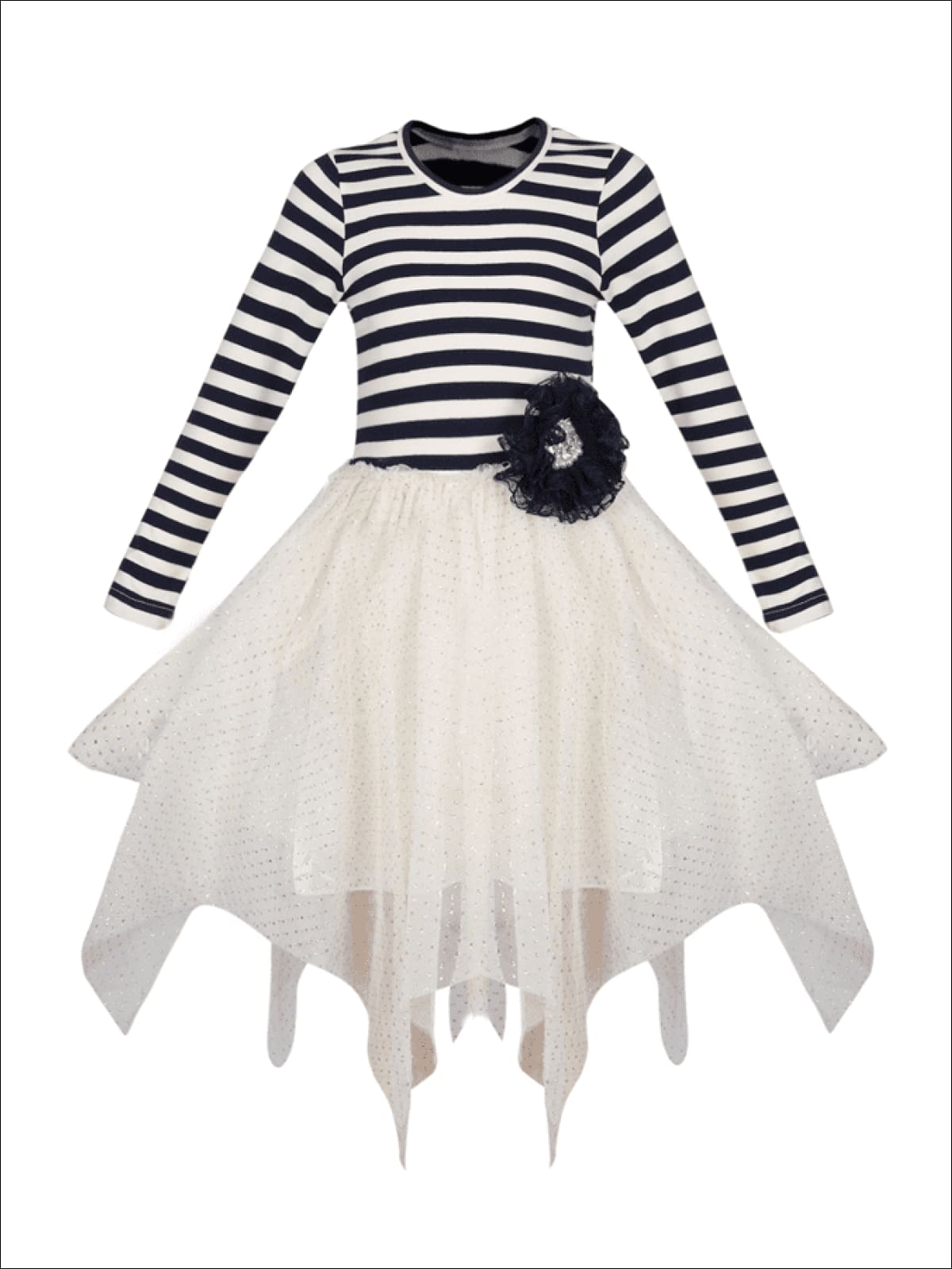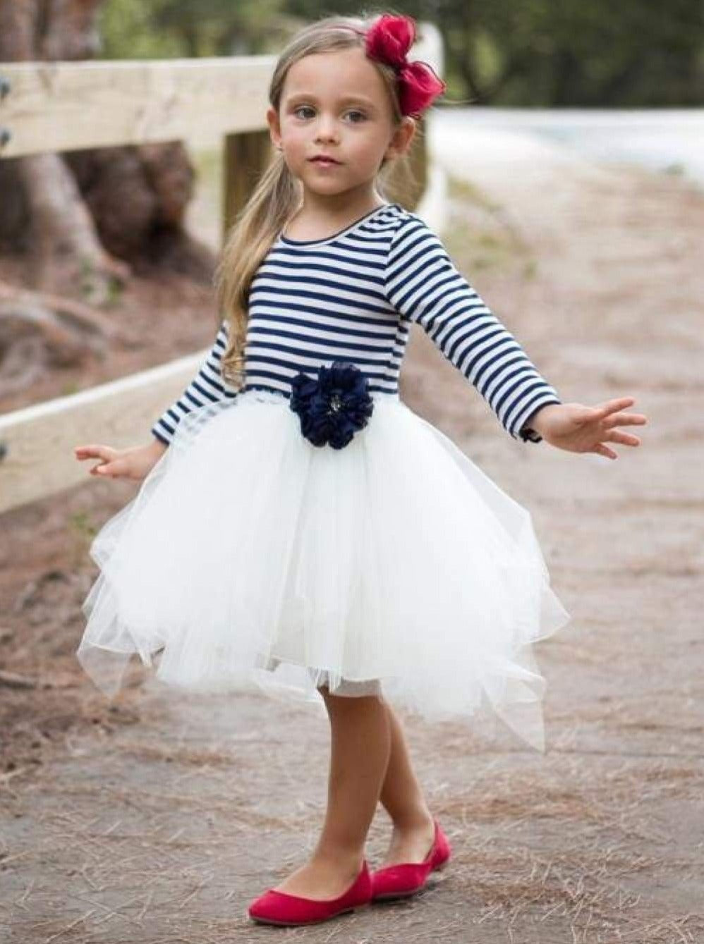 Her inner ballerina will adore this dress. The soft striped knit and delicate flower clip with pearls make this the perfect fall wardrobe staple!