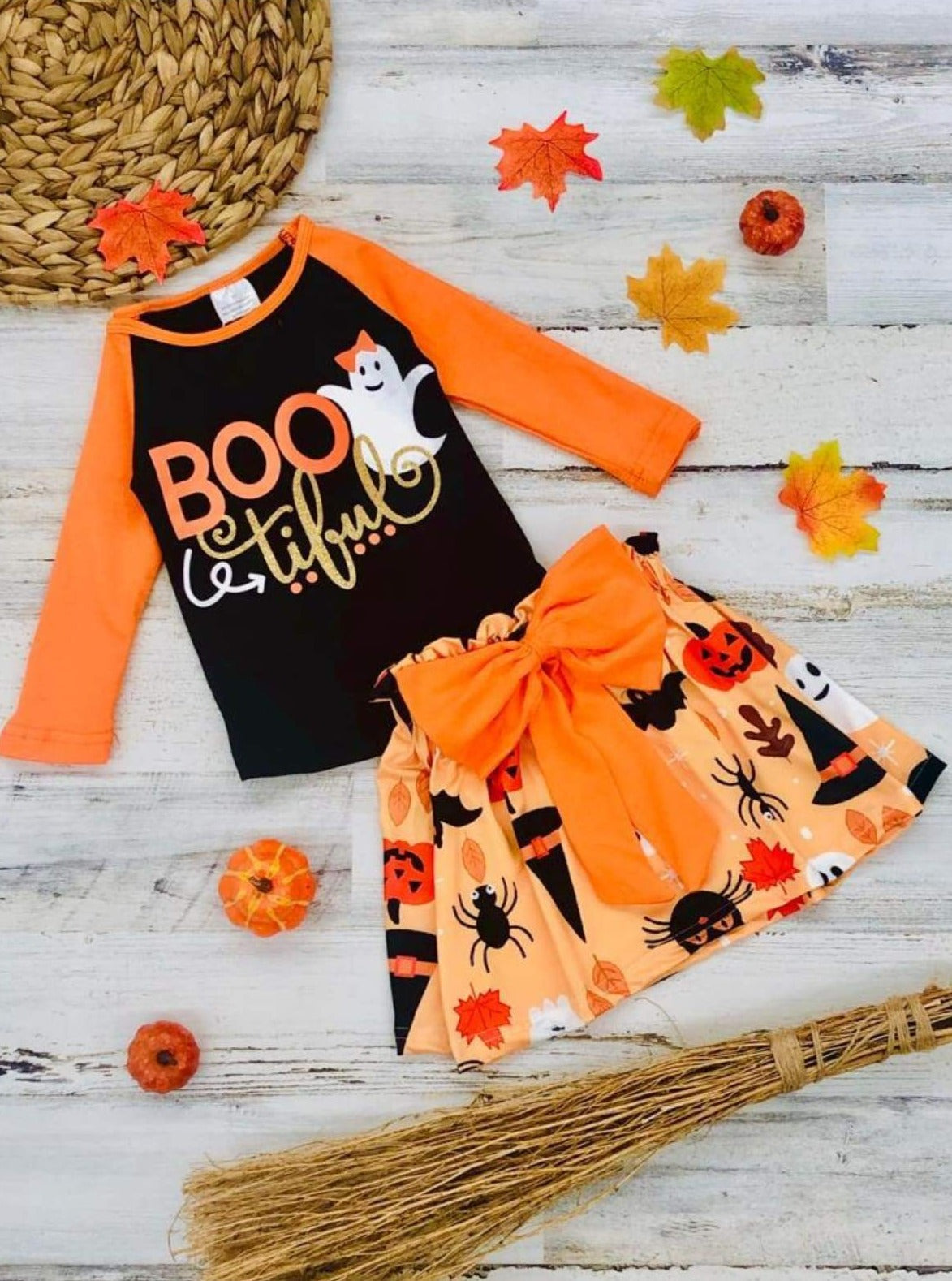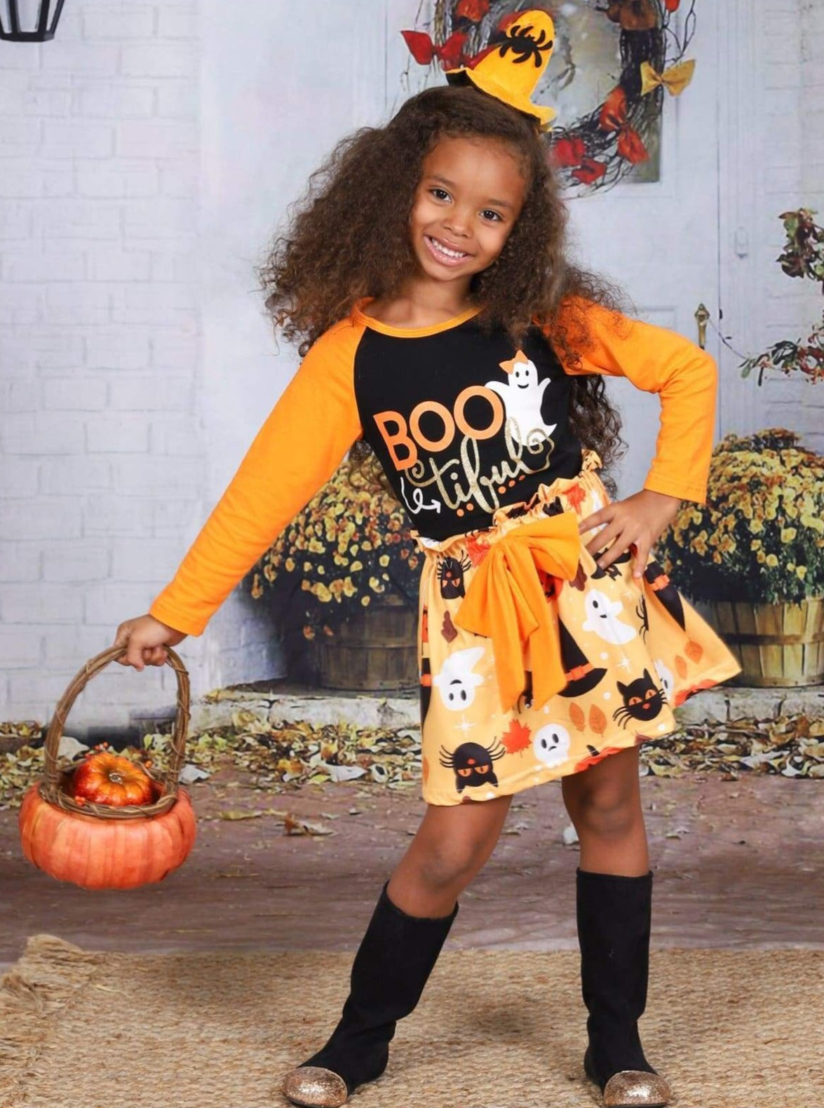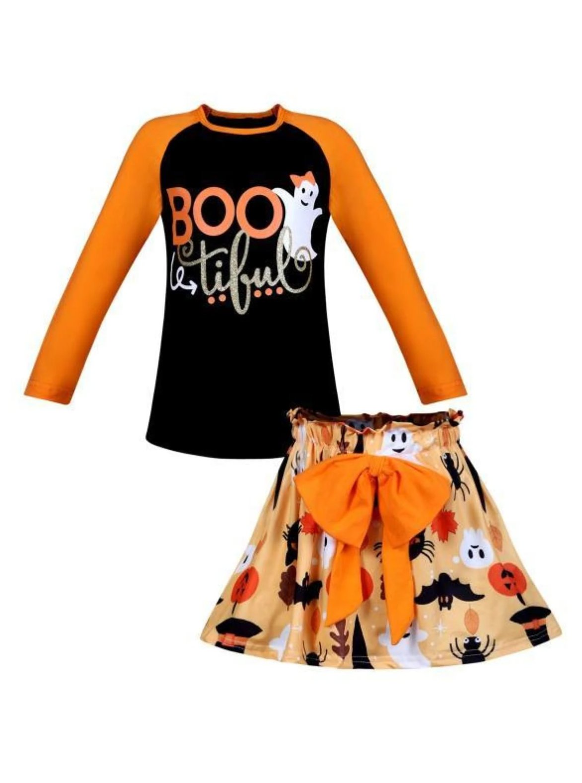 Girls Orange & Black Halloween Themed "BOOtiful" Raglan Long Sleeve Ghost Top & Printed Skirt Set