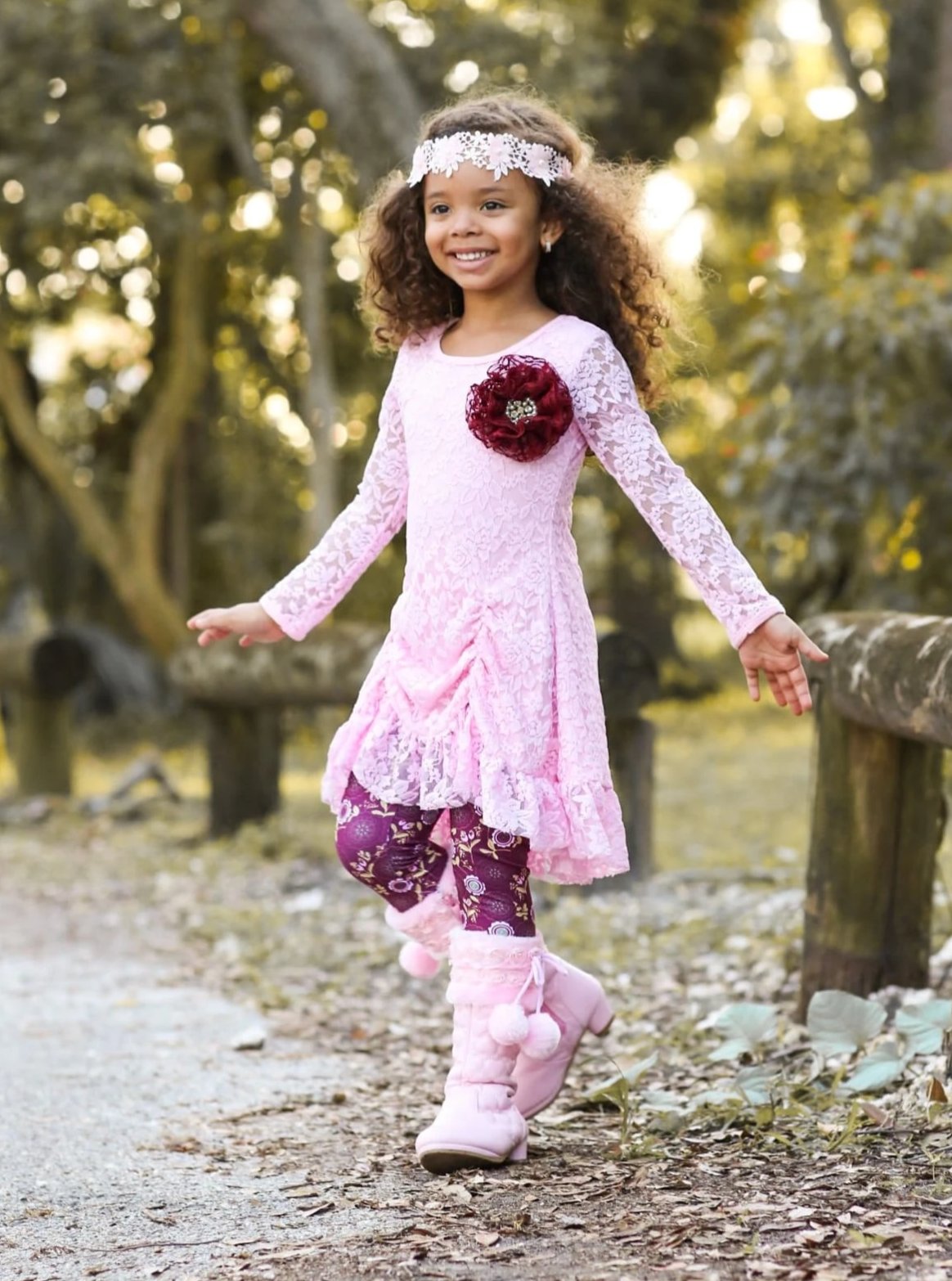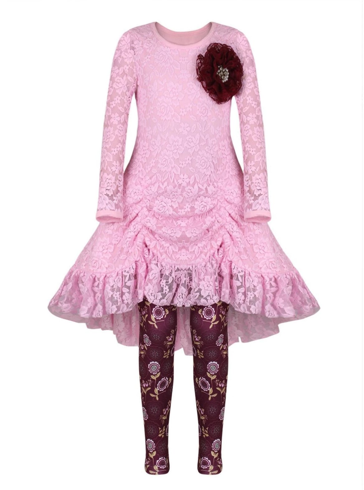 Girls Pink Drawstring Lace Tunic & Floral Legging Set