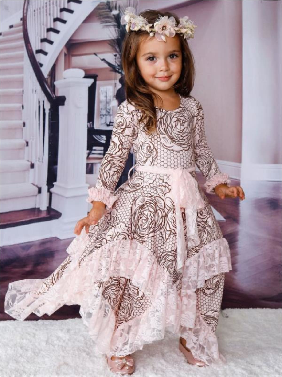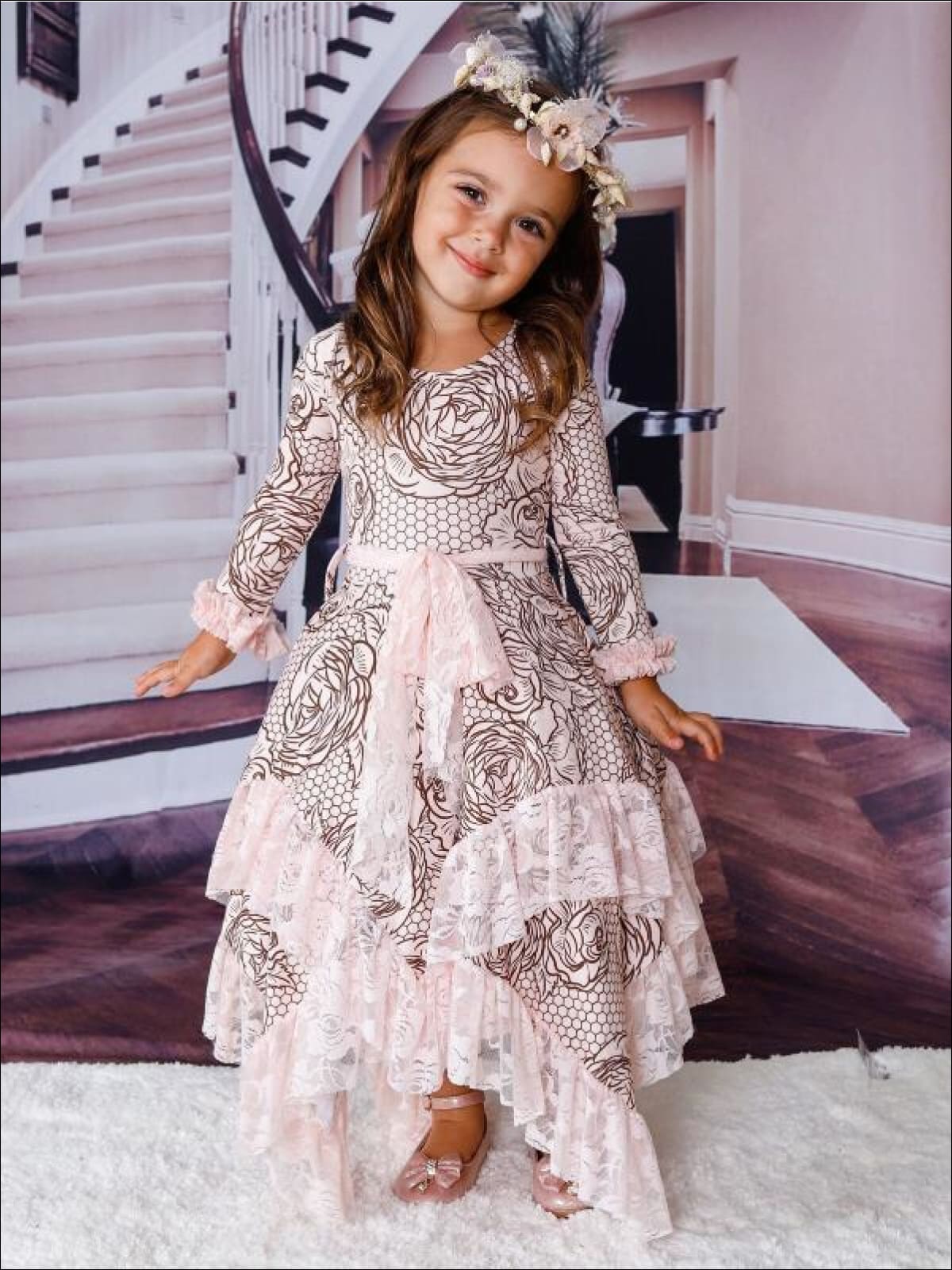 Girls Rose Lace Print Long Sleeve Lace Ruffled Double Layer Handkerchief Dress - Girls Fall Dressy Dress