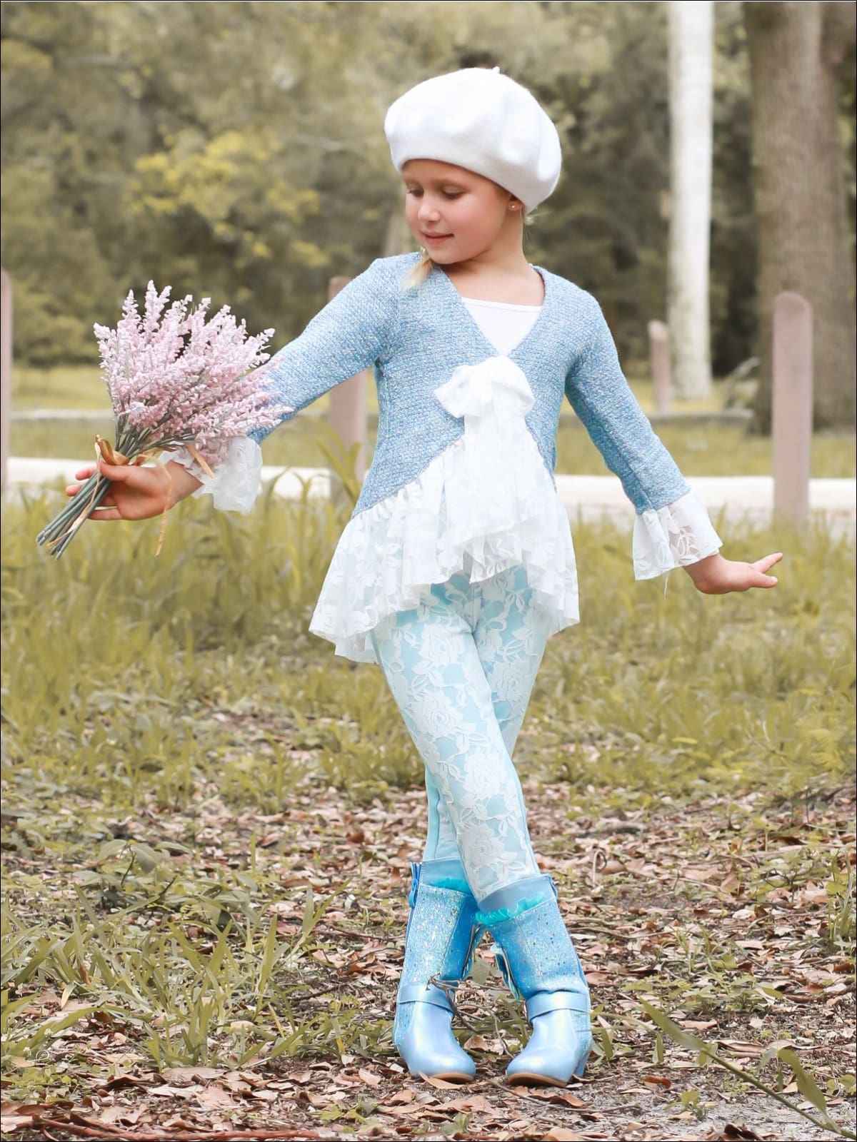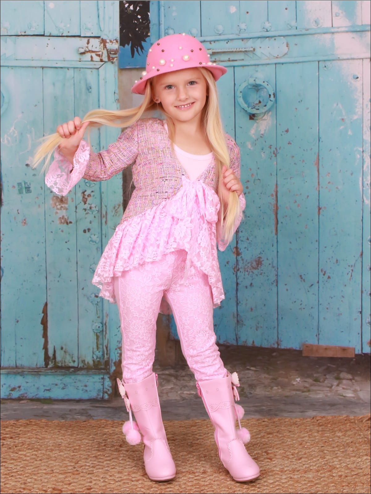 This flowy tweed and lace ruffled blazer with matching leggings will have her looking precious from head to toe. For a polished and dainty look that is suitable for any occasion, this set is a must-have for your girl!