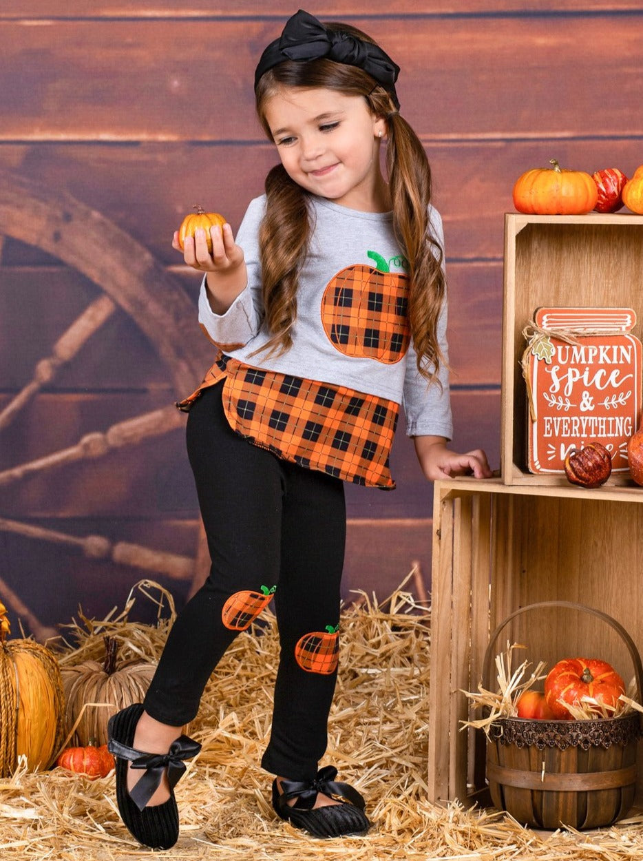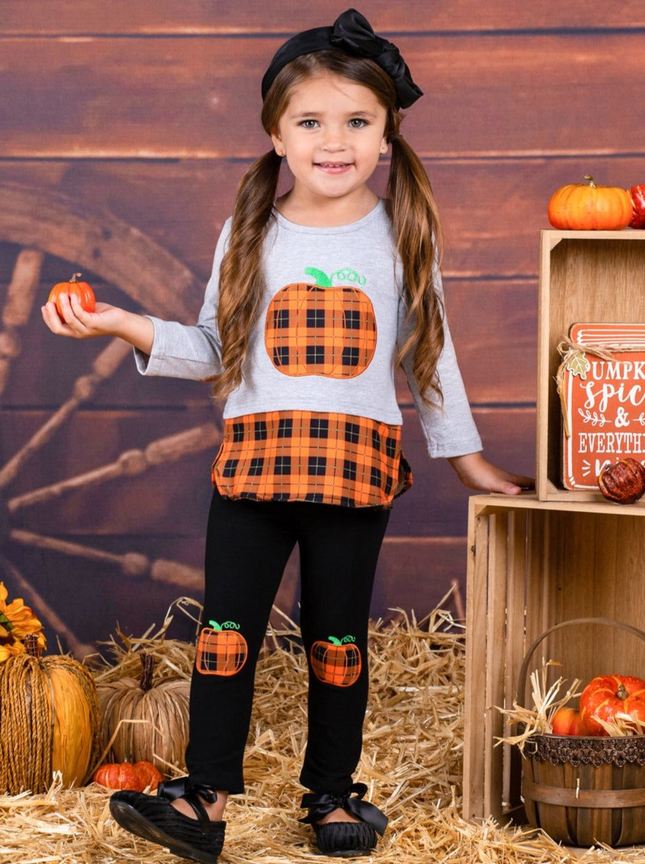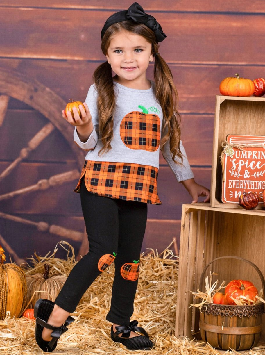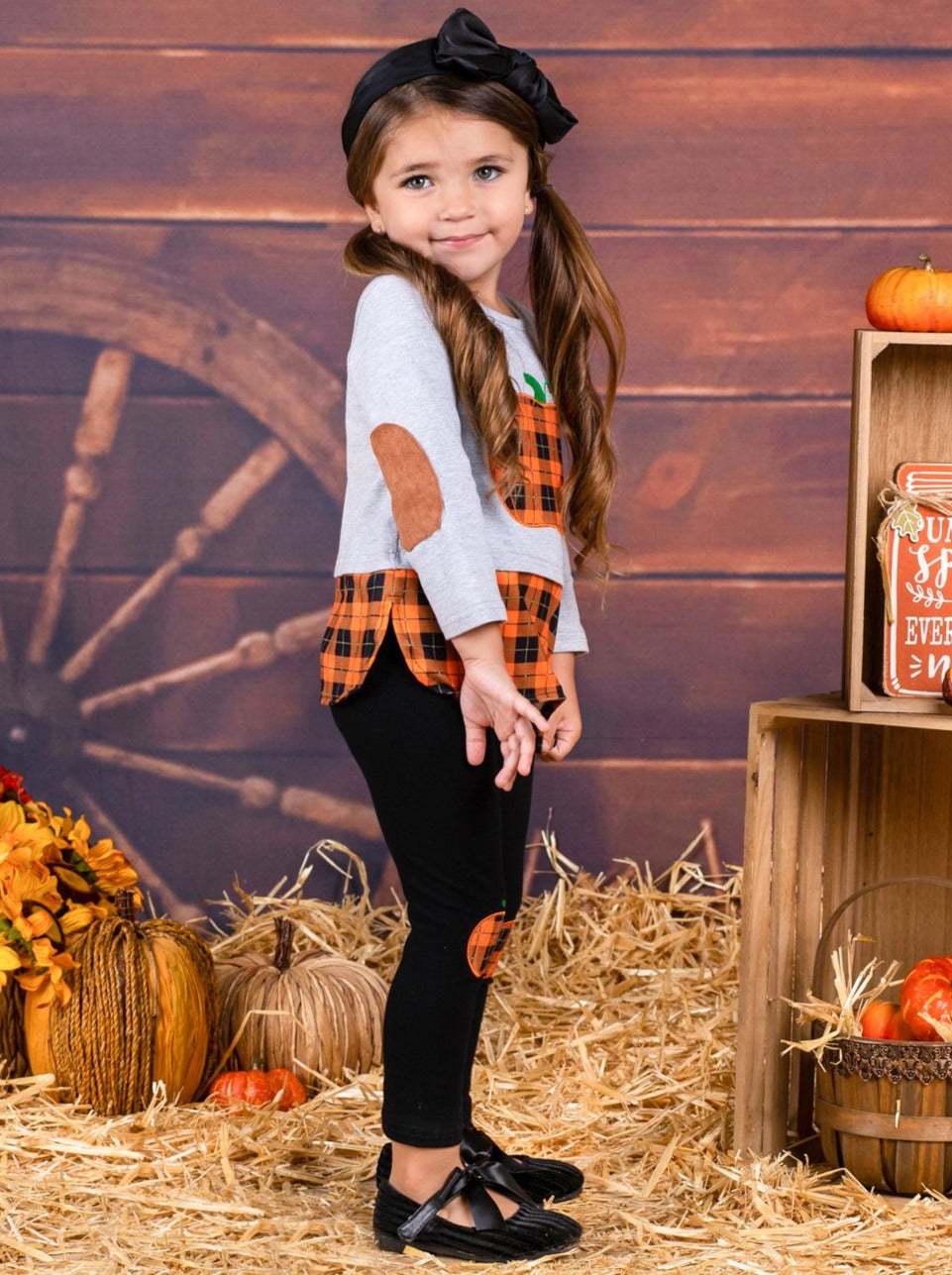 This pumpkin is just ripe for her to pick! Help her fall into harvest-ready style with this pumpkin themed set enhanced with elbow patches and pumpkin knee patches on the leggings. Everything from the plaid pumpkin to the matching hem will have her looking her adorable best.