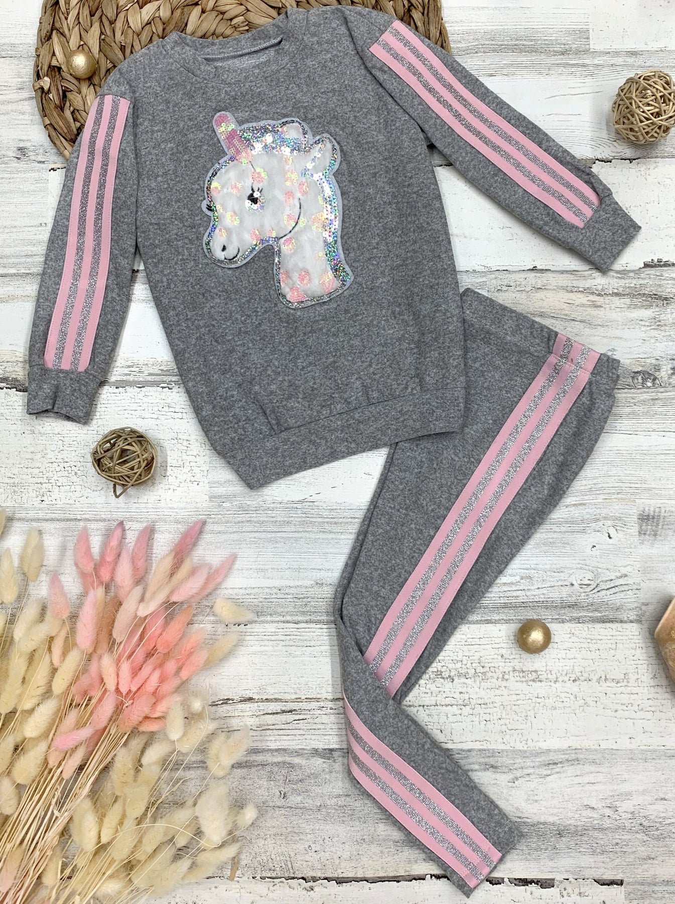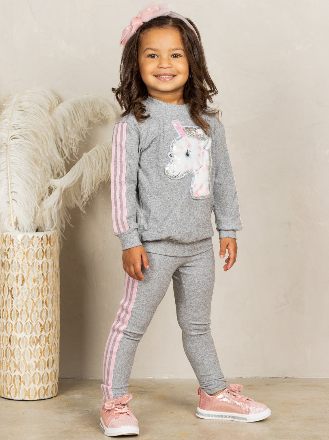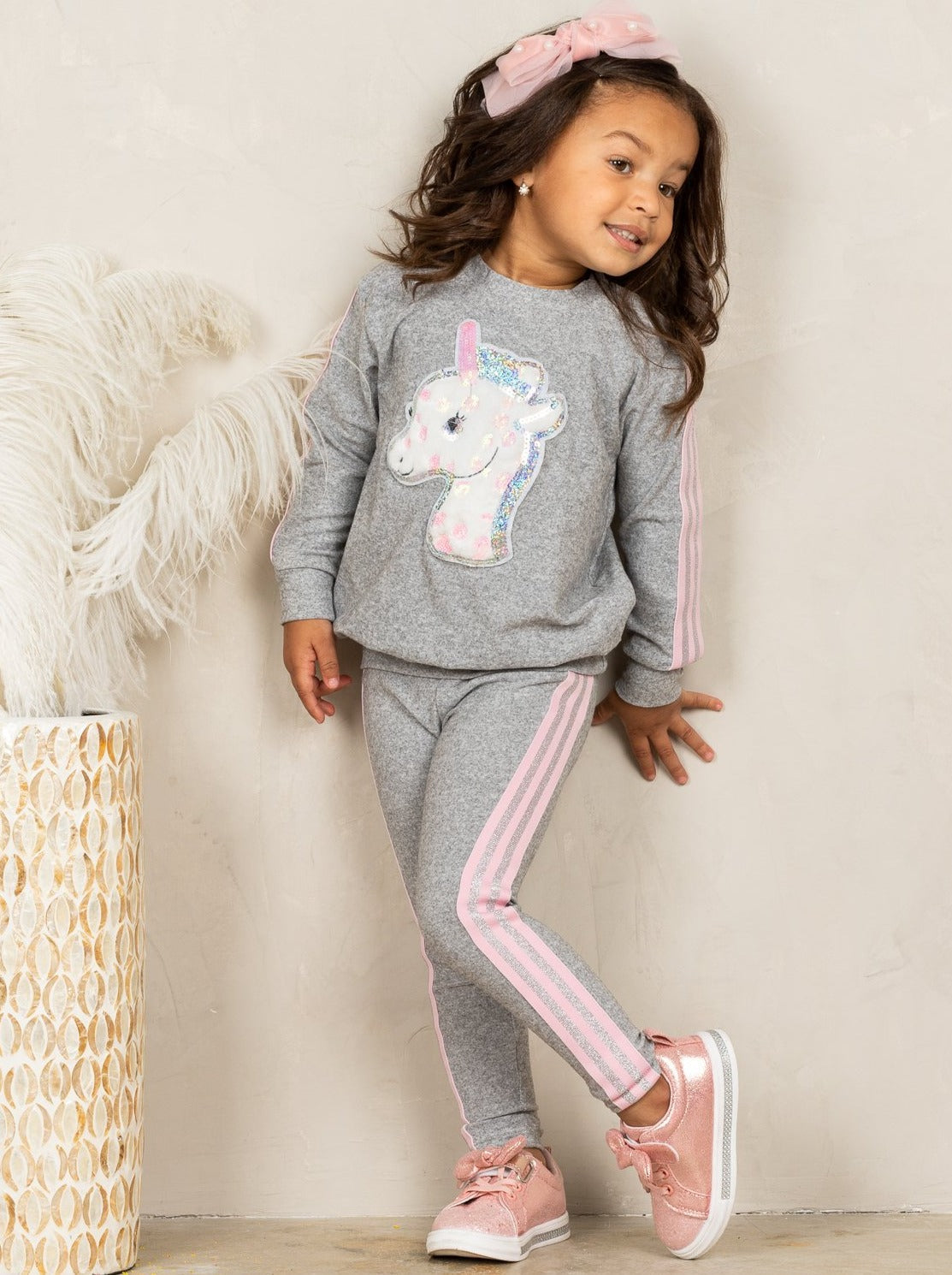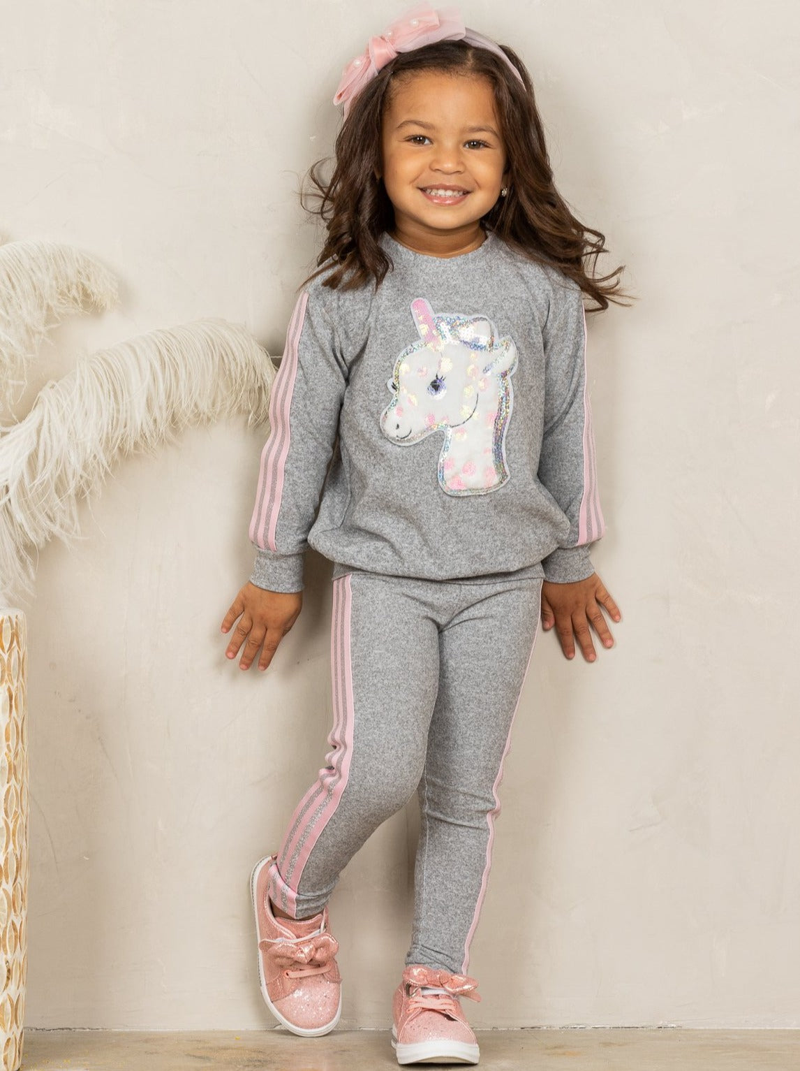- Set features a plush unicorn applique and striped trim on sleeves and side of joggers