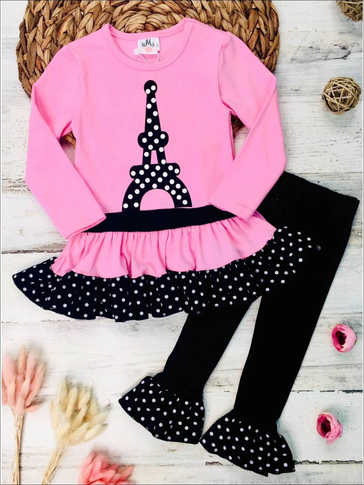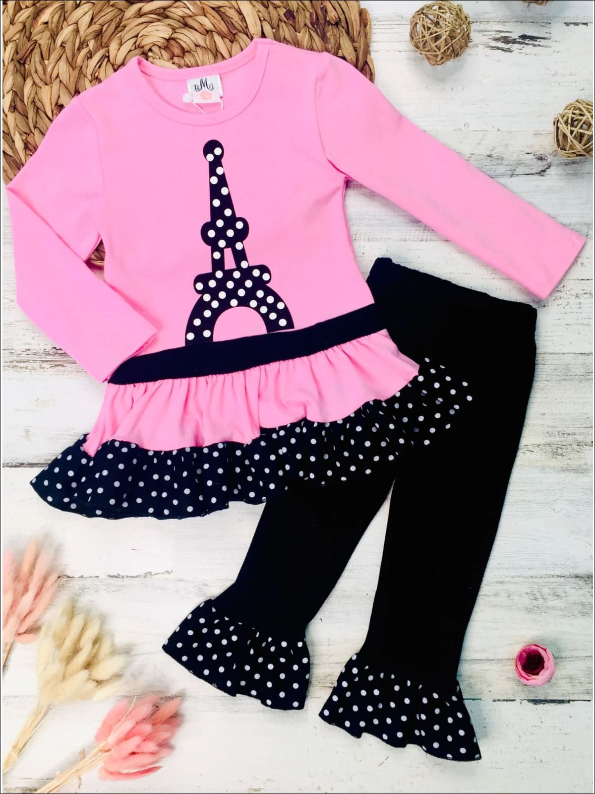 Girls Polka Dot Eiffel Tower Print Long Sleeve Peplum Bow Tunic & Ruffled Legging Set