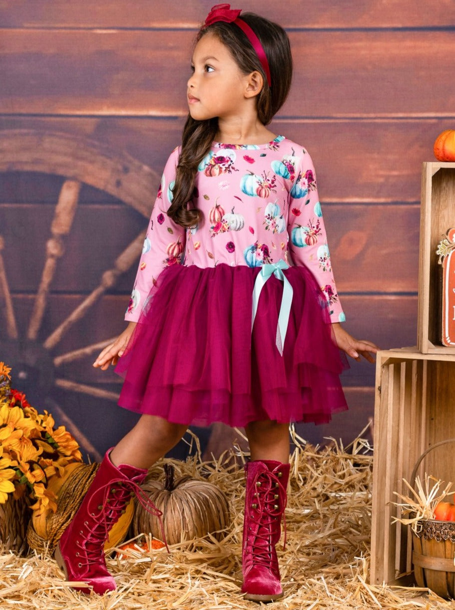 Long-sleeve tutu dress with pumpkin/leaves print on the bodice and layered tulle skirt embellished with a ribbon bow