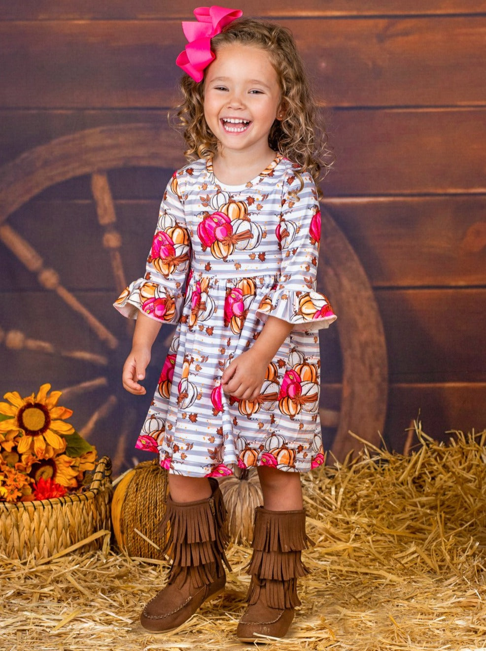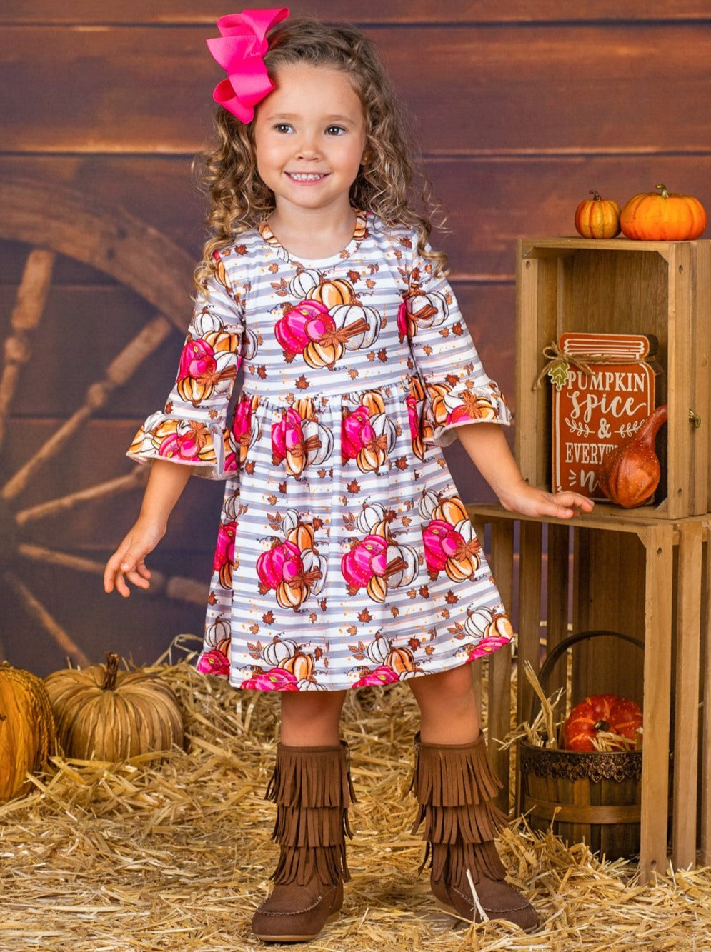 These pumpkins are just ripe for her to pick! Help her fall into harvest-ready style with this festive dress made with a hint of stretch for comfort all day long. Everything from the different pumpkin hues to the sweet leaves will have her looking her best.