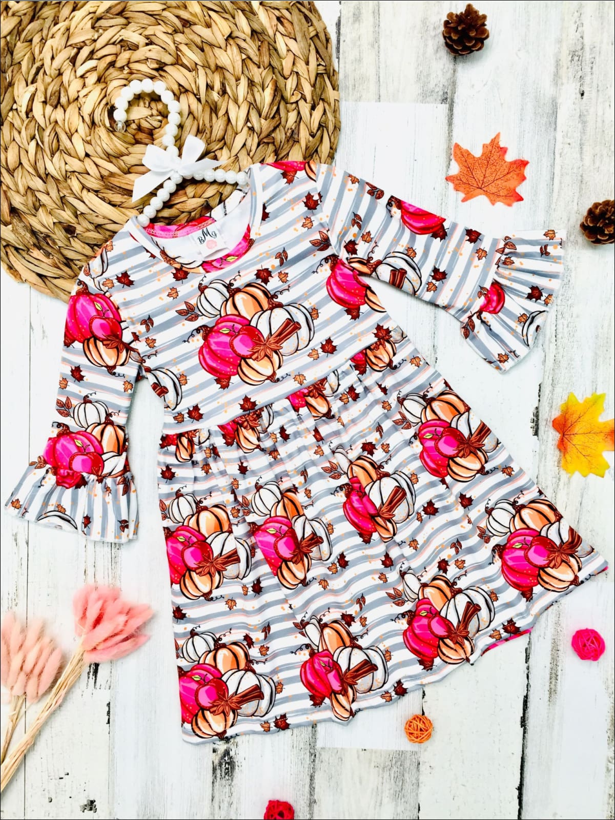 Girls Pumpkin Leaves Print Ruffled Sleeve Dress - Grey / 3T - Girls Fall Casual Dress